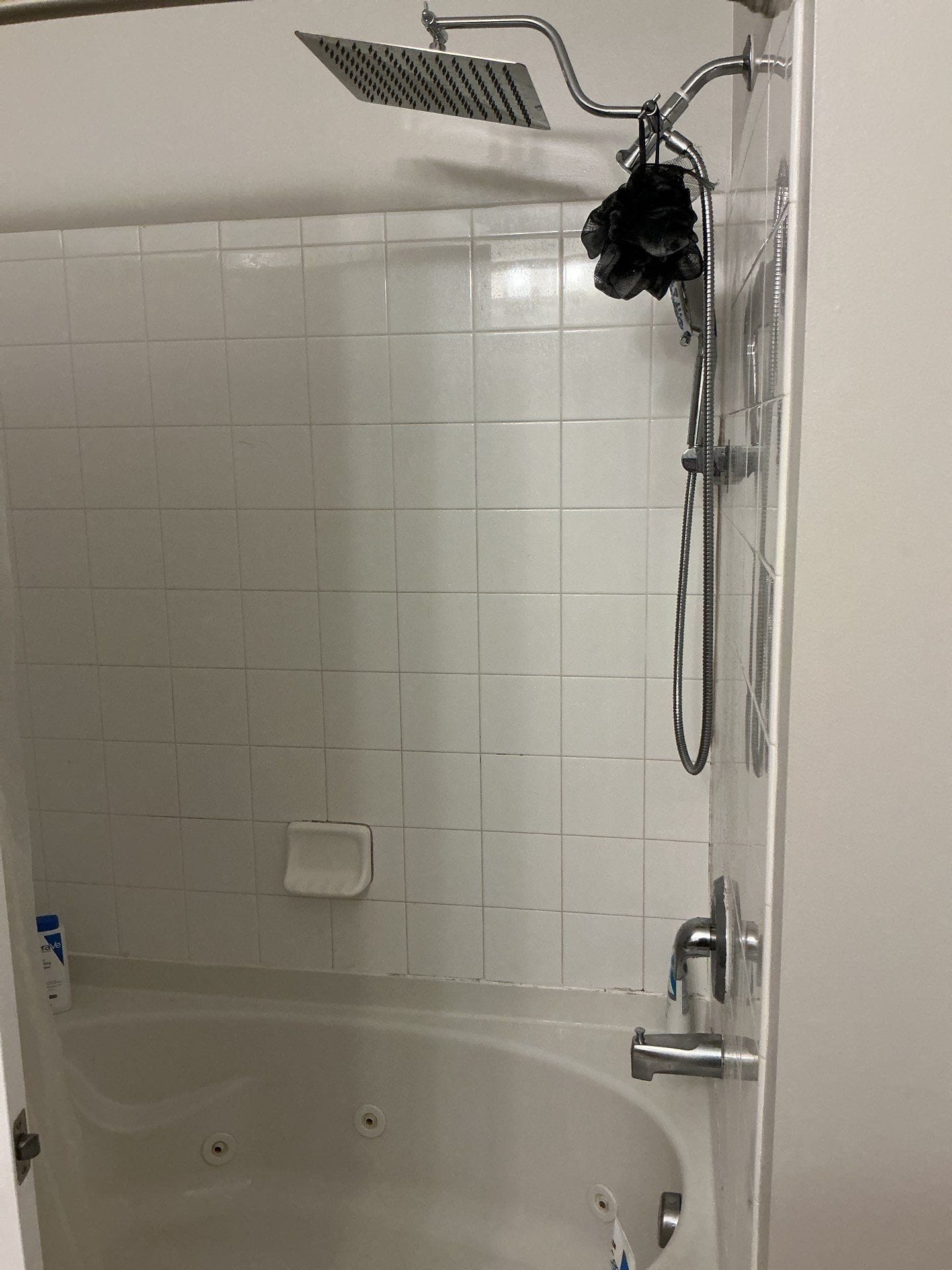 * Brushed nickel fixtures with handheld shower and slide bar
