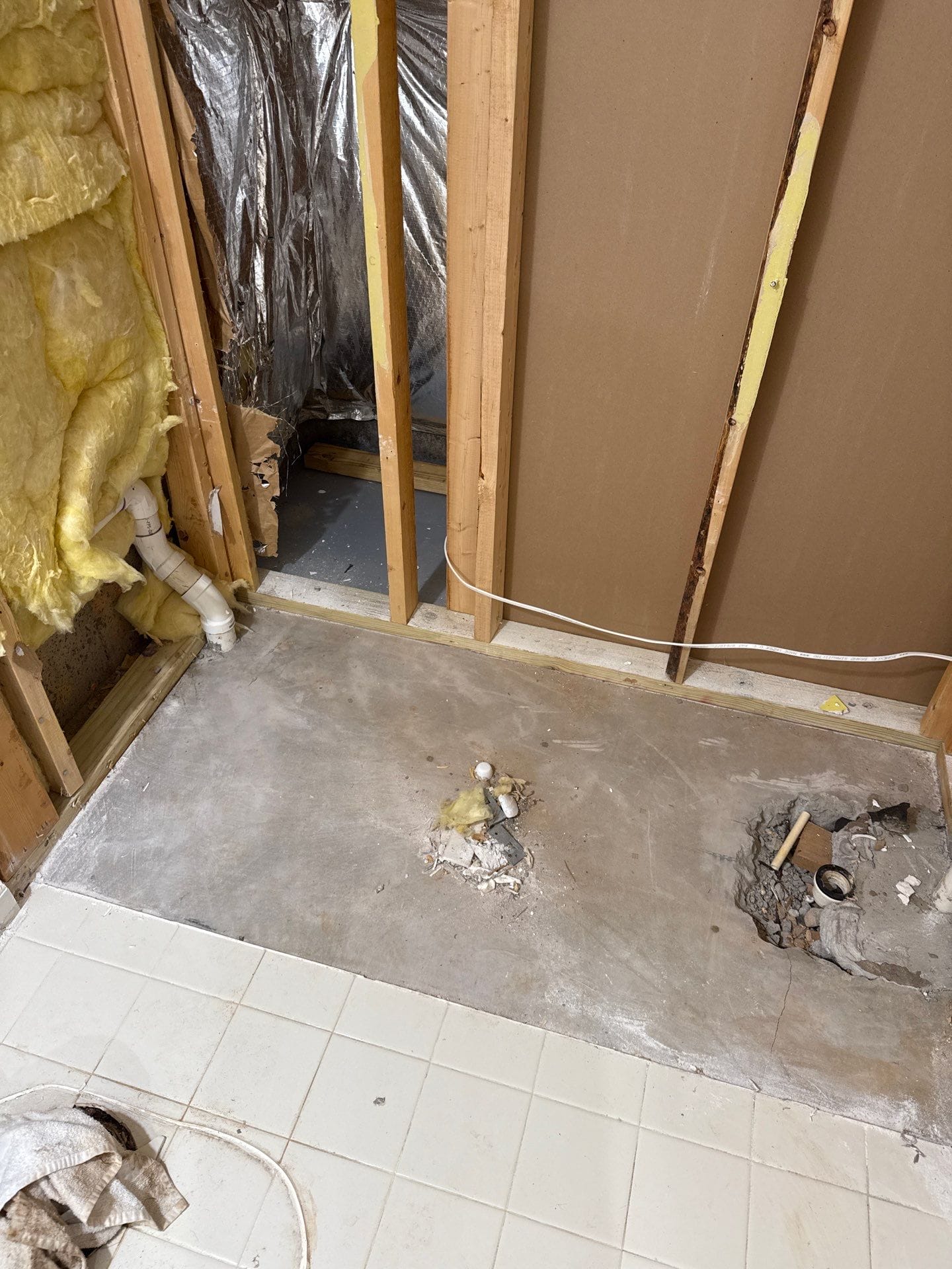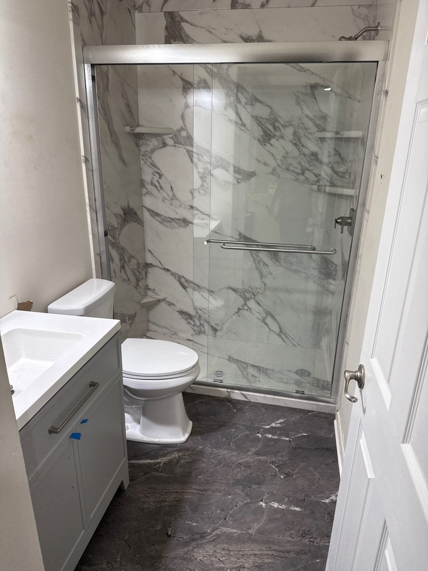Installation began with full demolition of the original tub and tile. The team removed wallboard to the studs, checked for hidden moisture issues, and rebuilt with waterproof foam backer board sealed with antimicrobial silicone. After securing the base and wall panels, the crew installed the shelving, grab bar, and fixtures. The entire bathroom was protected during the remodel, and the workspace was cleaned for immediate use upon completion. The project was completed within two days.