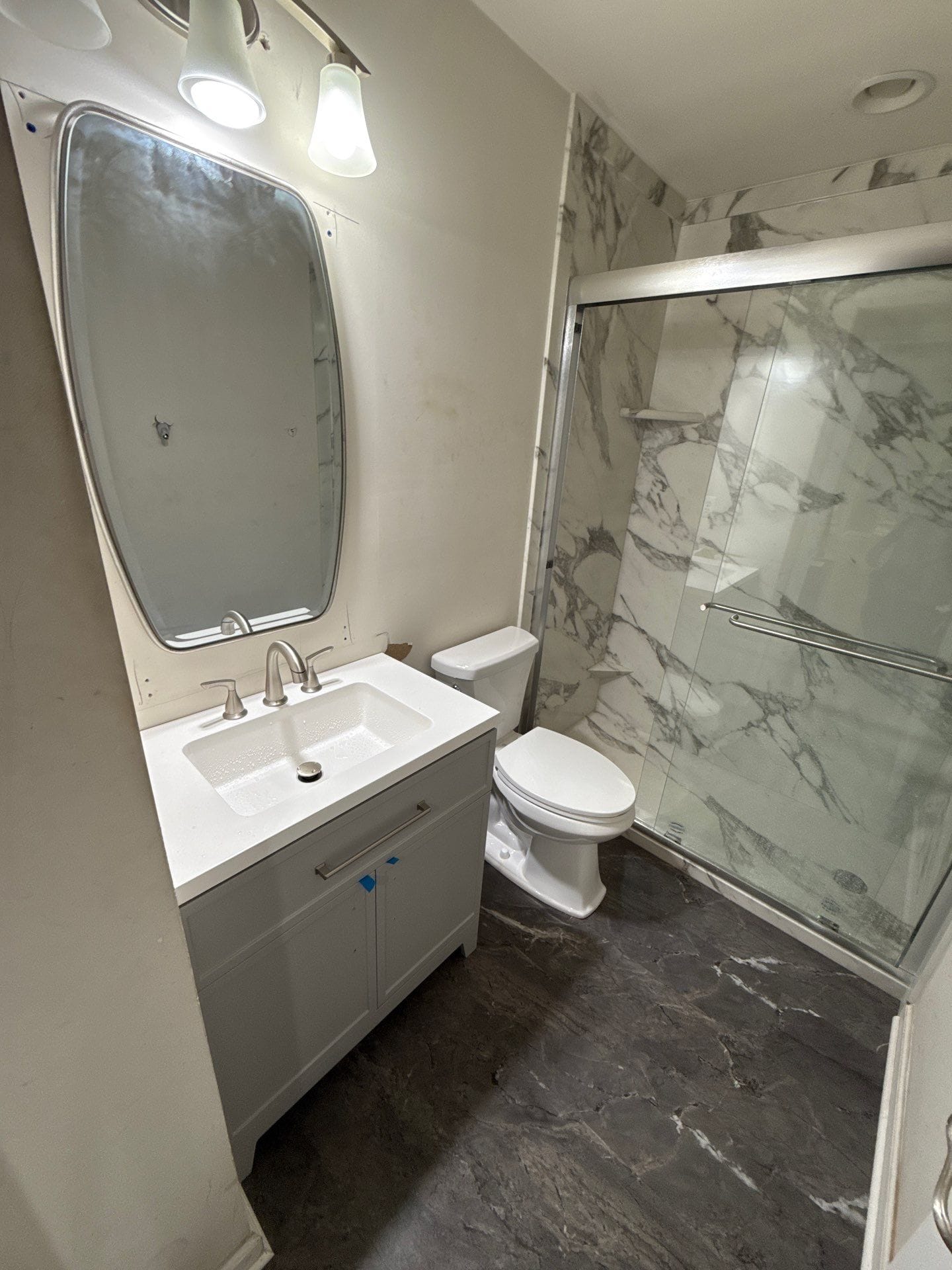 The new shower features a full tub-to-walk-in conversion with large-format, Calacatta-style composite wall panels in a gloss finish. A frameless glass bypass door system was installed, contributing to the clean and open appearance. The shower includes two recessed corner shelves for storage and a brushed nickel grab bar mounted horizontally along the inside. Matching fixtures and finishes coordinate with the new vanity and lighting updates across the bathroom.