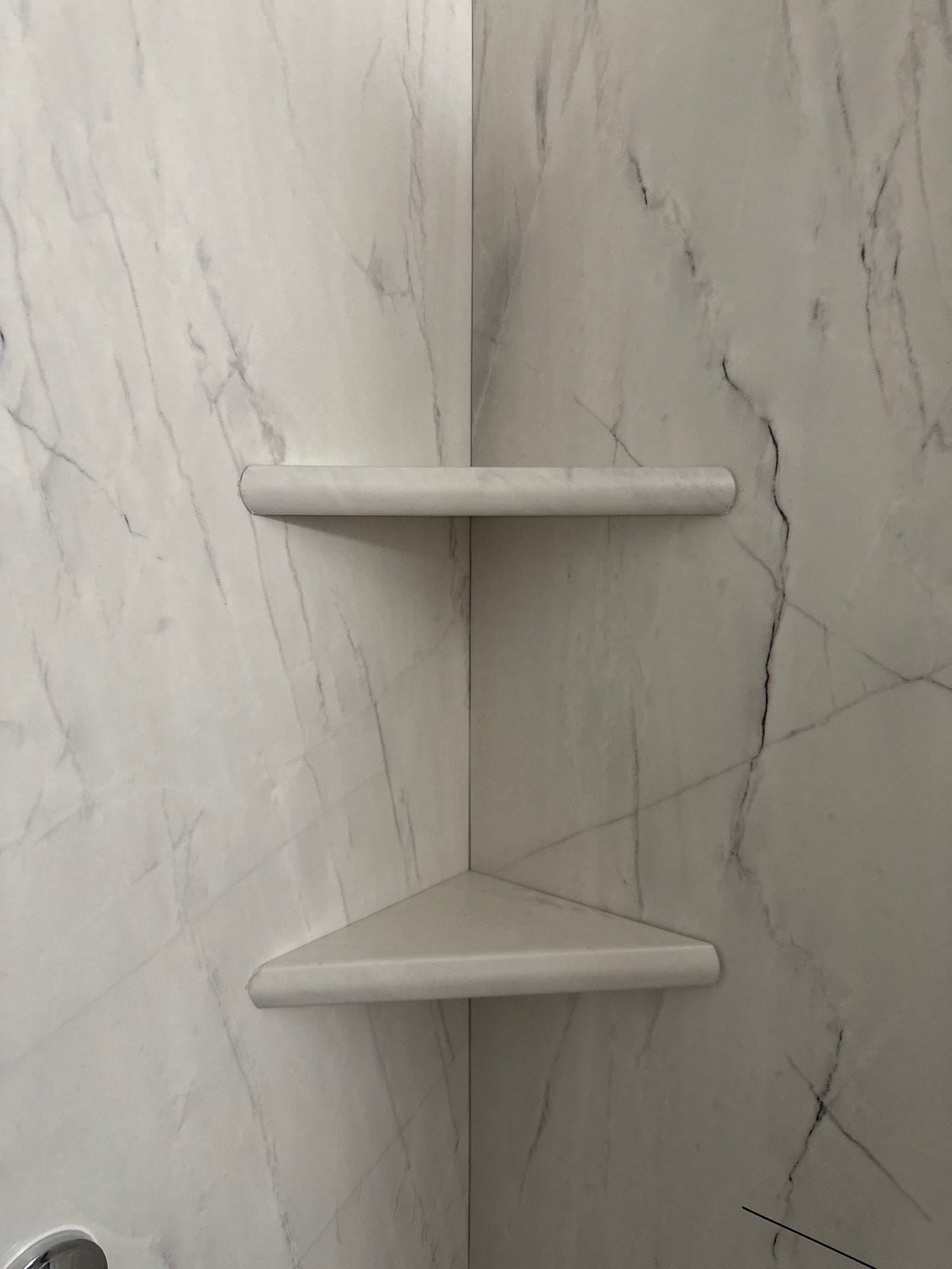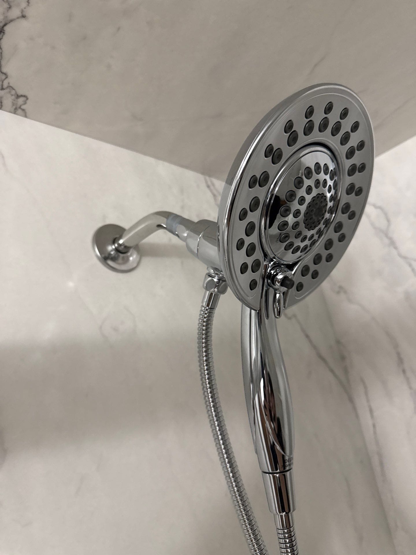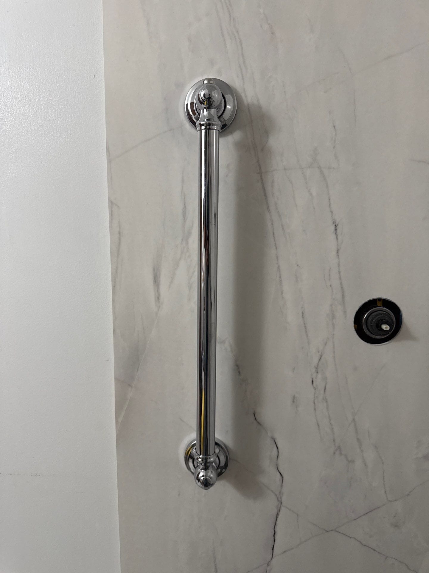 Installation required full demolition to the studs. Any structural weakness or moisture-damaged components were addressed before reconstruction. A new P-trap and water lines were installed, and the space was rebuilt with a custom-fitted, marble-look wall panel system. A frameless glass bypass door was used to replace the older framed unit, improving both visibility and accessibility. A folding teak bench was mounted to the wall for seated showering, and a multi-height, chrome-finished hand shower system was installed for enhanced utility. A straight grab bar added safety across the main wall, matching the hardware finish.