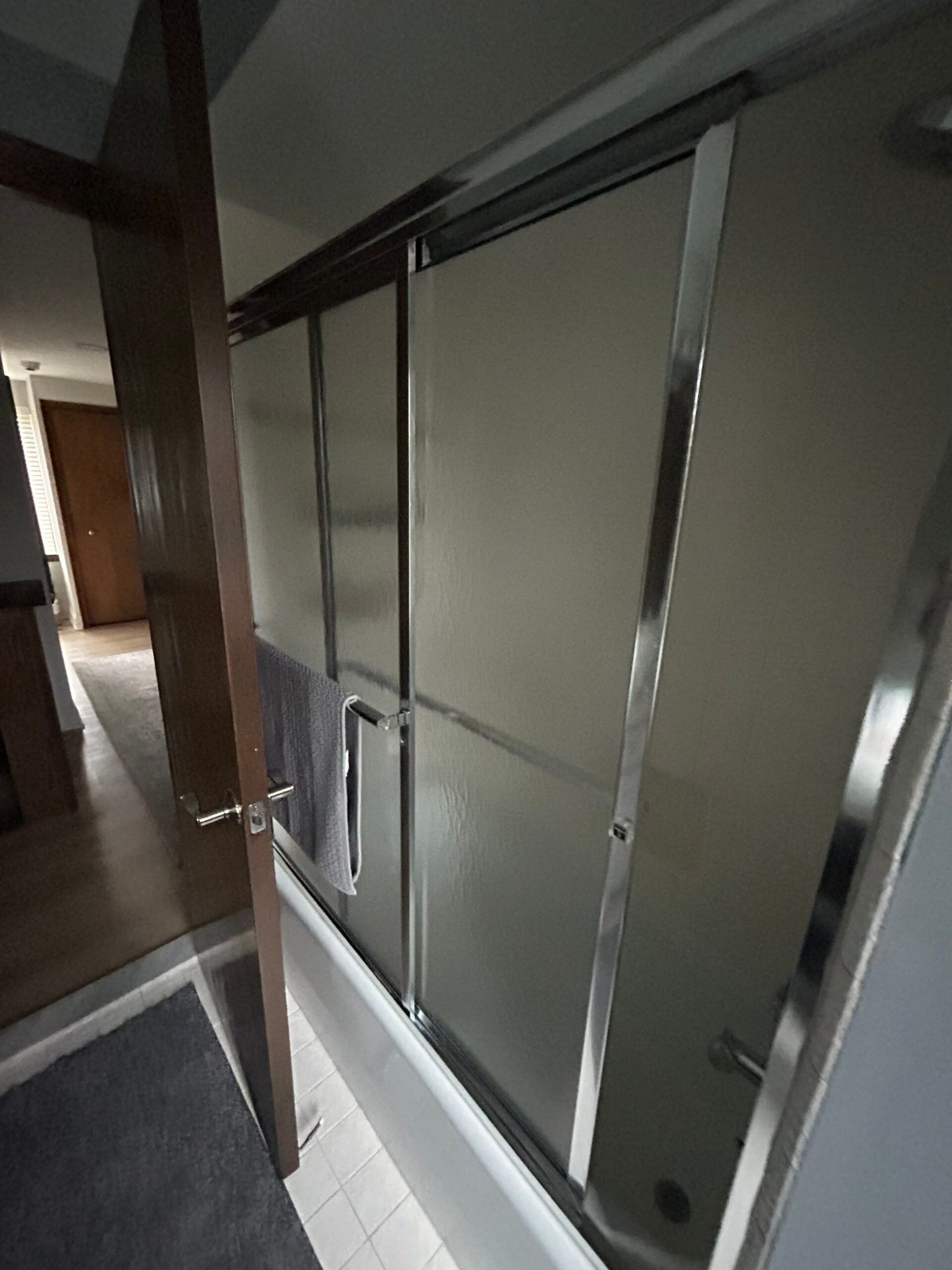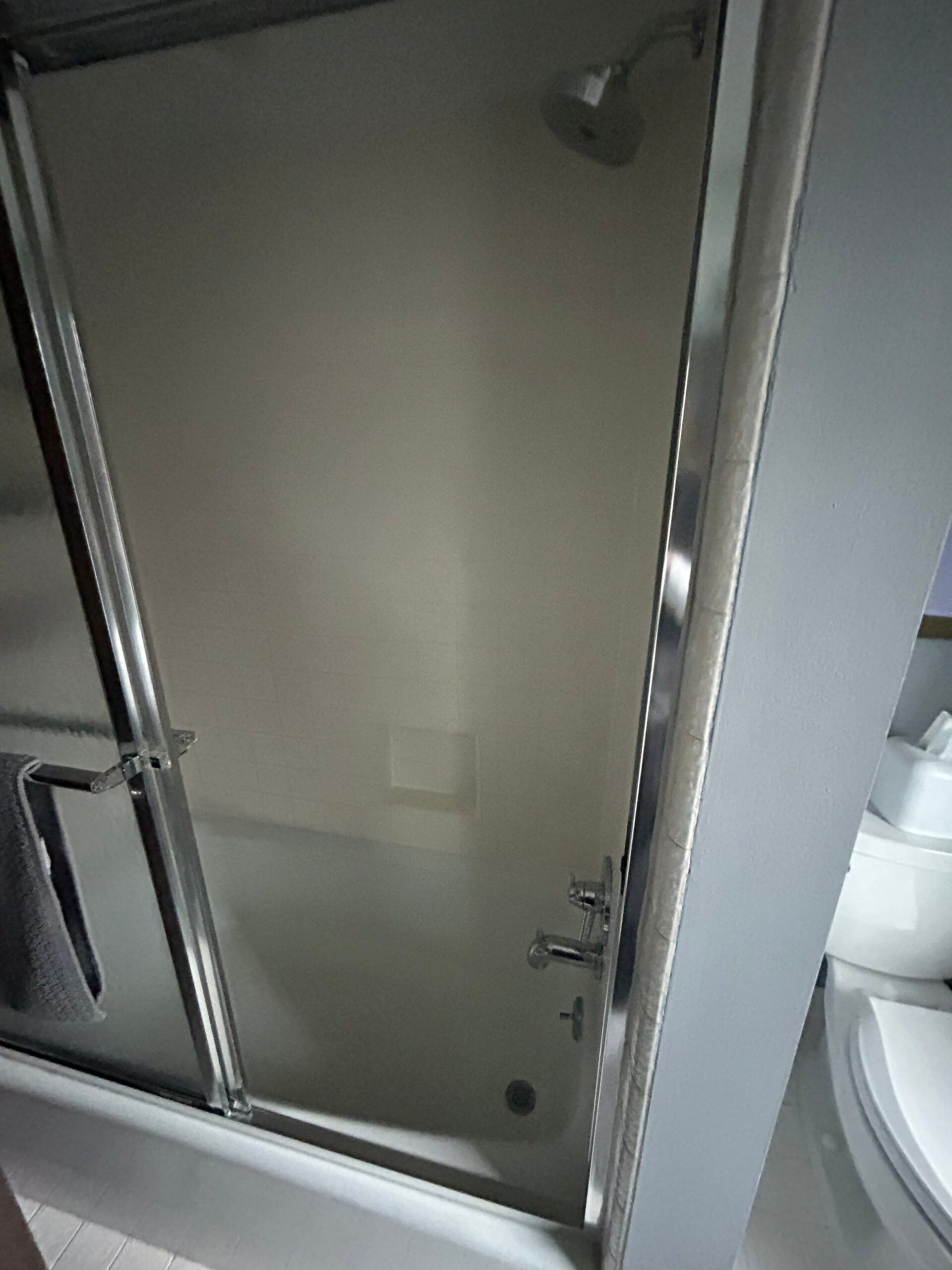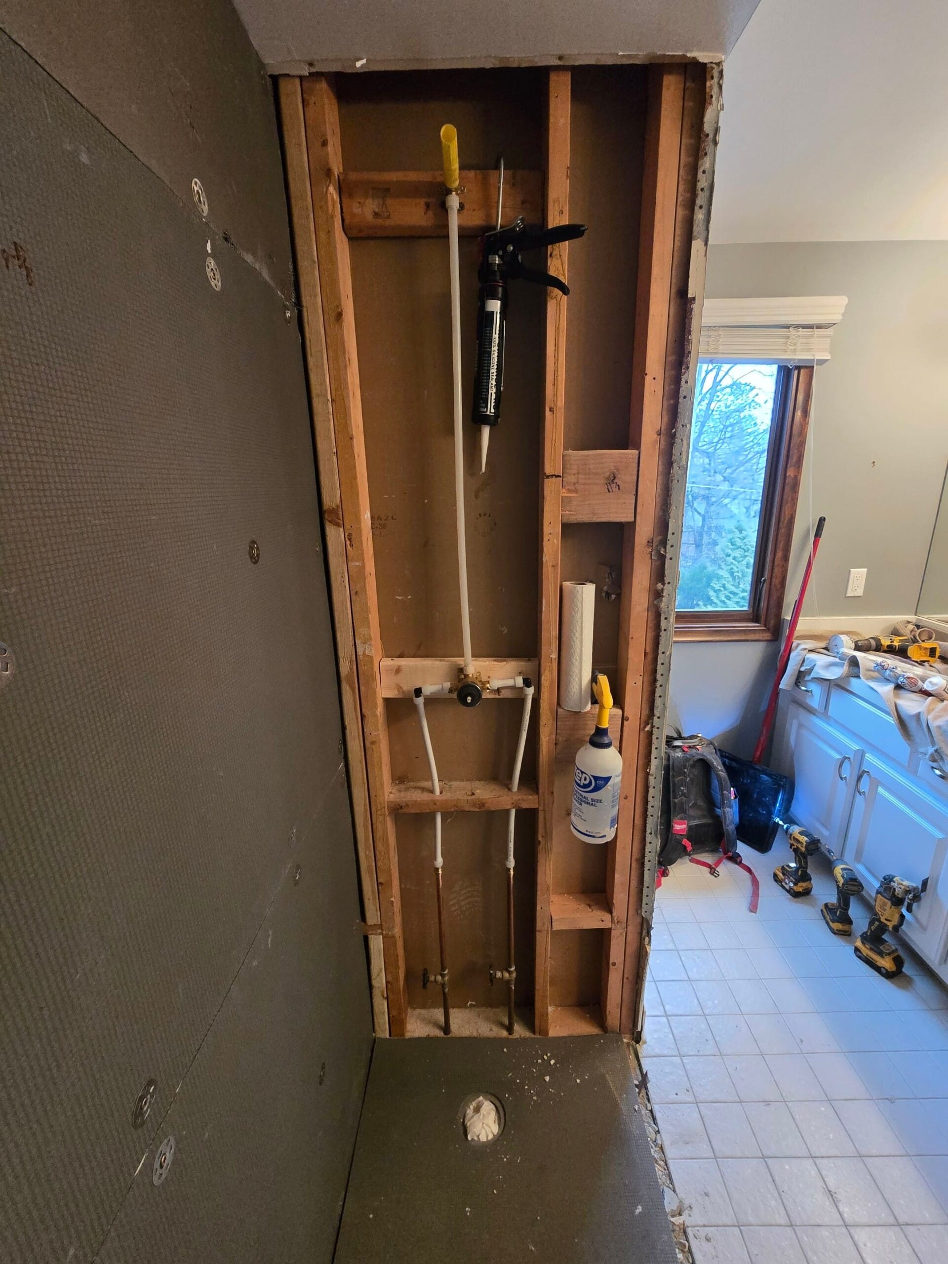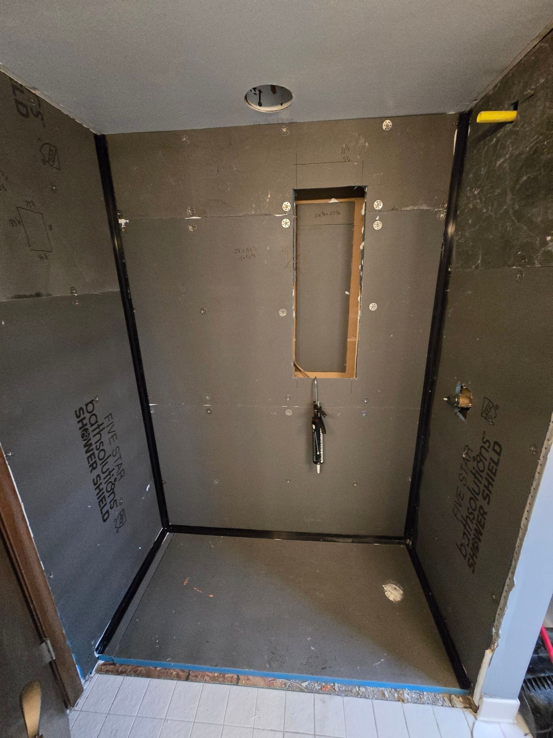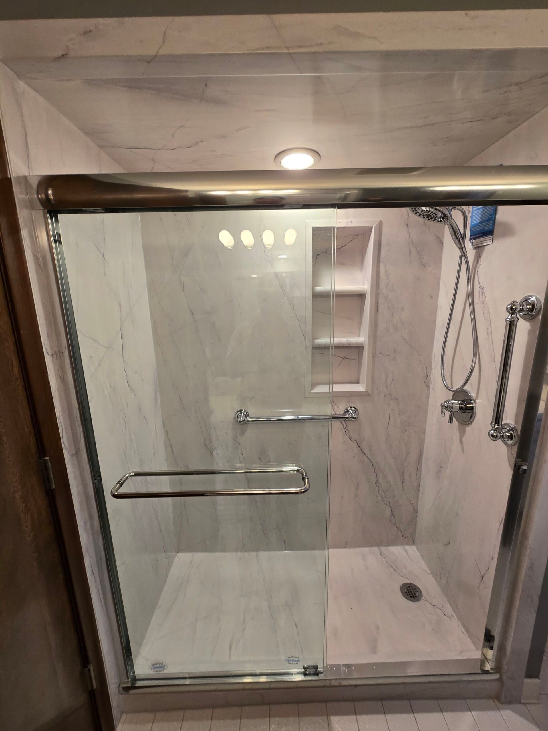 The installation process involved full removal of the existing tub and surrounding materials down to the studs to properly address moisture concerns. New plumbing components and a diverter system were installed, followed by waterproof backer board and custom-fit composite wall panels. The shower base was installed to align with the wall system for a watertight finish. Glass enclosure components, fixtures, and accessories were then secured, with attention to proper sealing and alignment. The full installation was completed within one to two days after materials were prepared, following a scheduled lead time for measurement and production.