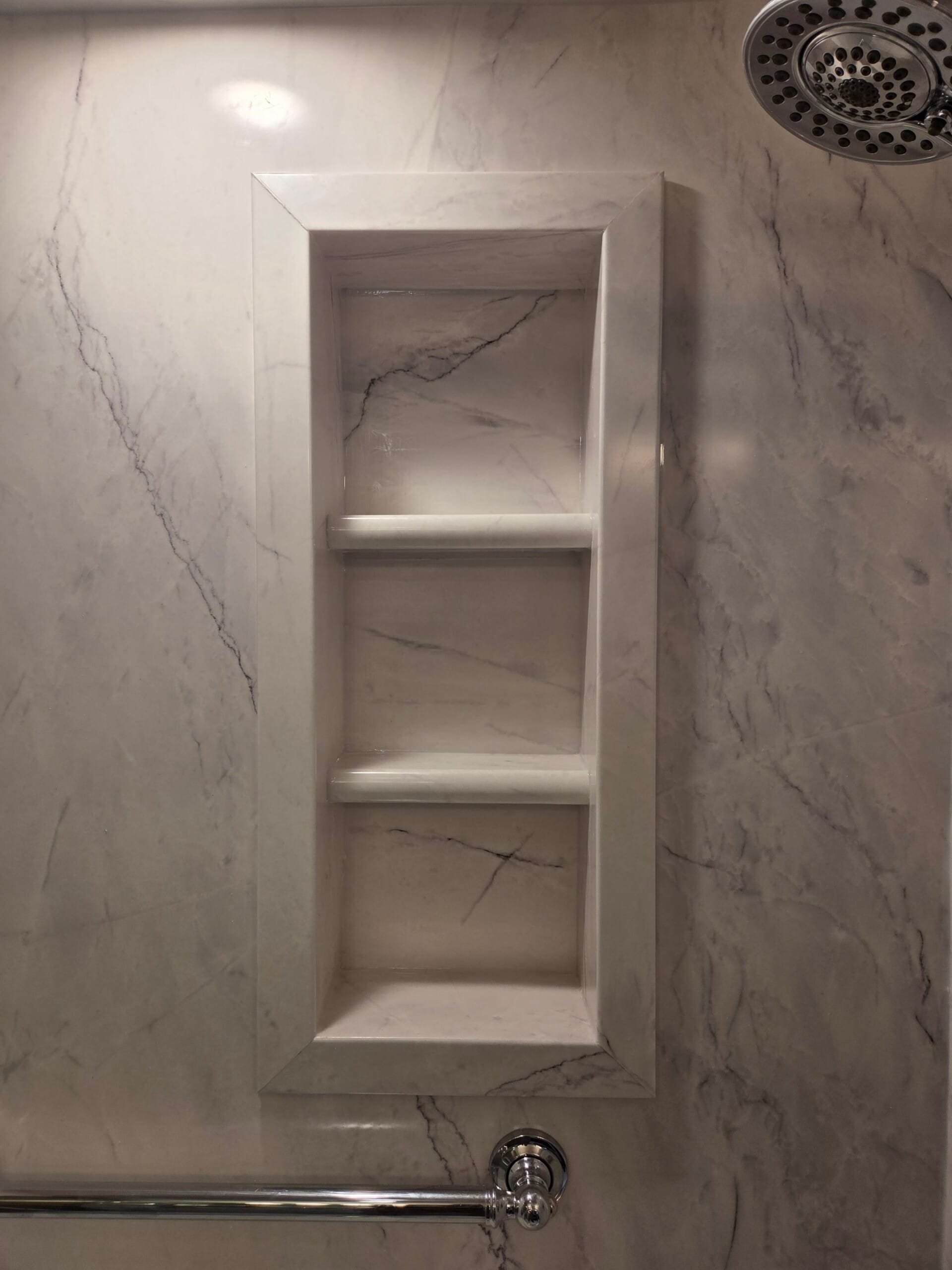 The Representative from Five Star Bath Solutions presented a grout-free composite wall system designed for long-term durability and ease of maintenance. The finished space features a marble-patterned wall surround with a cohesive matching shower base, creating a seamless and modern appearance. Polished chrome fixtures were installed throughout, including a Delta multi-function handheld shower system mounted on an adjustable slide bar. A recessed wall niche provides integrated storage, while a built-in bench offers a practical seating solution that aligns with the overall design. The company’s focus on bathroom-specific remodeling and use of licensed installers reinforced trust and confidence in the solution.
