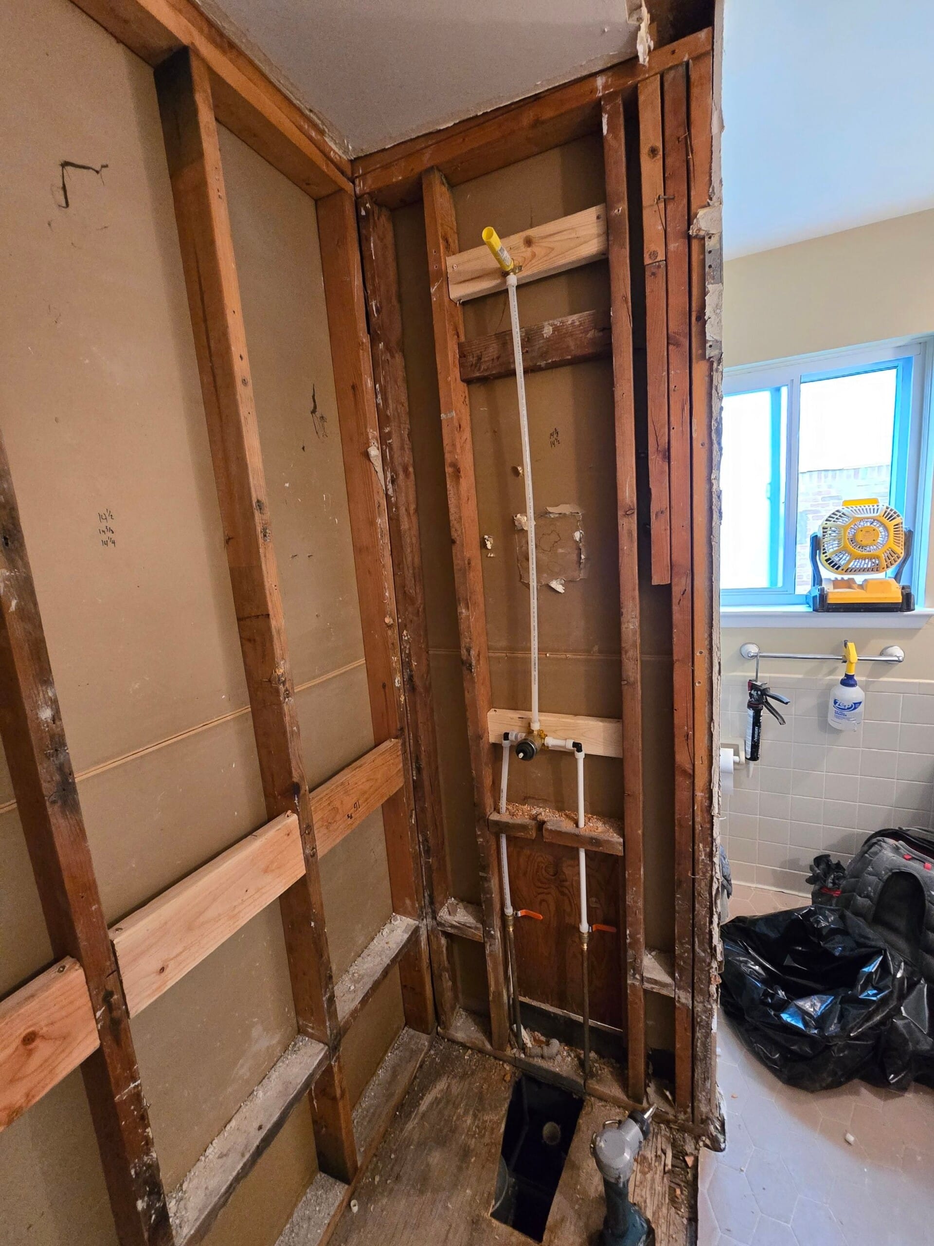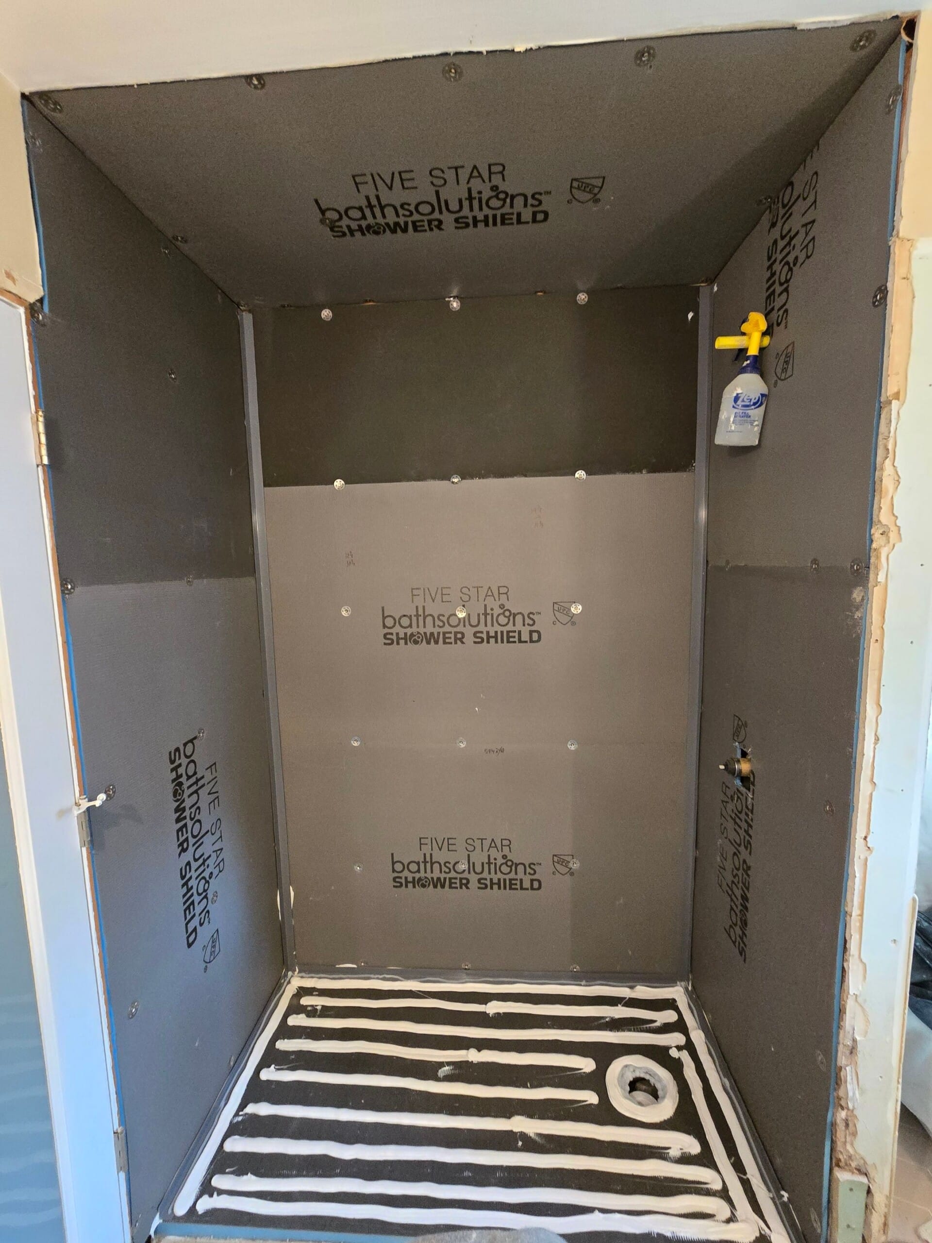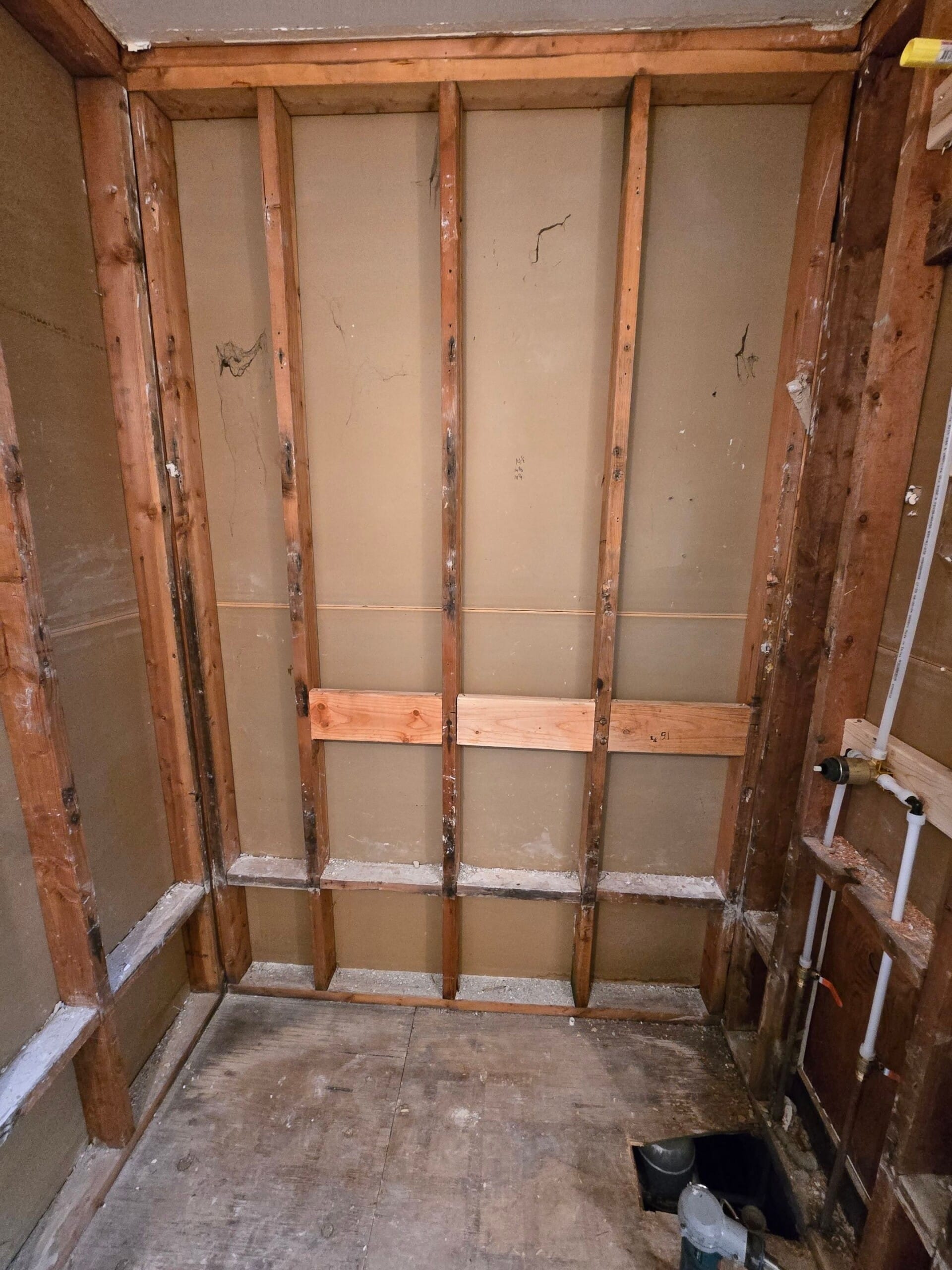 The installation included a full demo down to the studs, removal of tile and plumbing, and remediation of any discovered mold. New drain lines, valves, and support framing were installed, followed by wall panels, bench, shelving, base, and glass door system. Paint-ready walls and complete site cleanup were delivered upon completion. Installation was completed within the expected two-day timeline by an in-house crew without subcontracting.