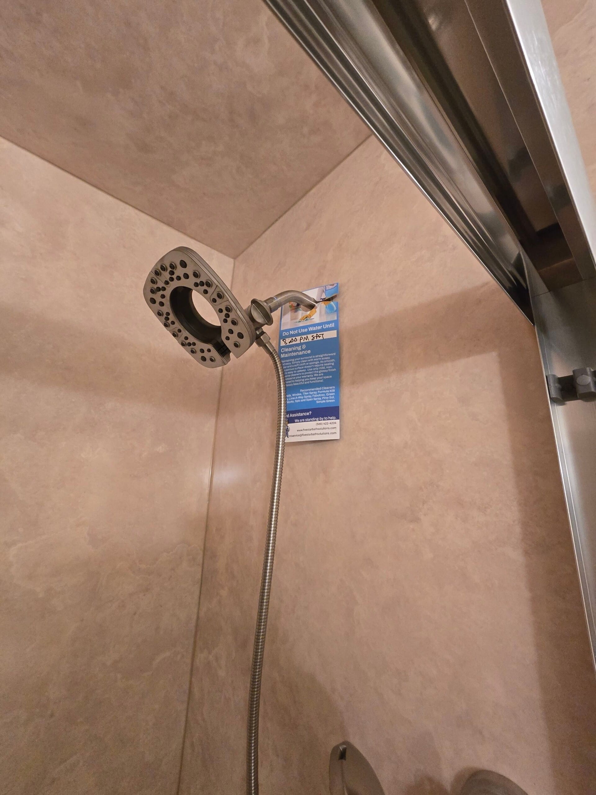 Ehsan, the Five Star Bath Solutions representative, explained the benefits of their composite wall system, emphasizing antimicrobial protection, a durable PVC structure, and ease of maintenance with no need for grout or caulking. The system was installed using 100% waterproof HydroBlock backer board and double-thickness wall panels, designed to resist mold and mildew. Fixtures were presented in brushed nickel to match the updated aesthetic. Although the company does not supply vanities or mirrors, the team confirmed full removal and installation of customer-provided components as part of the service.