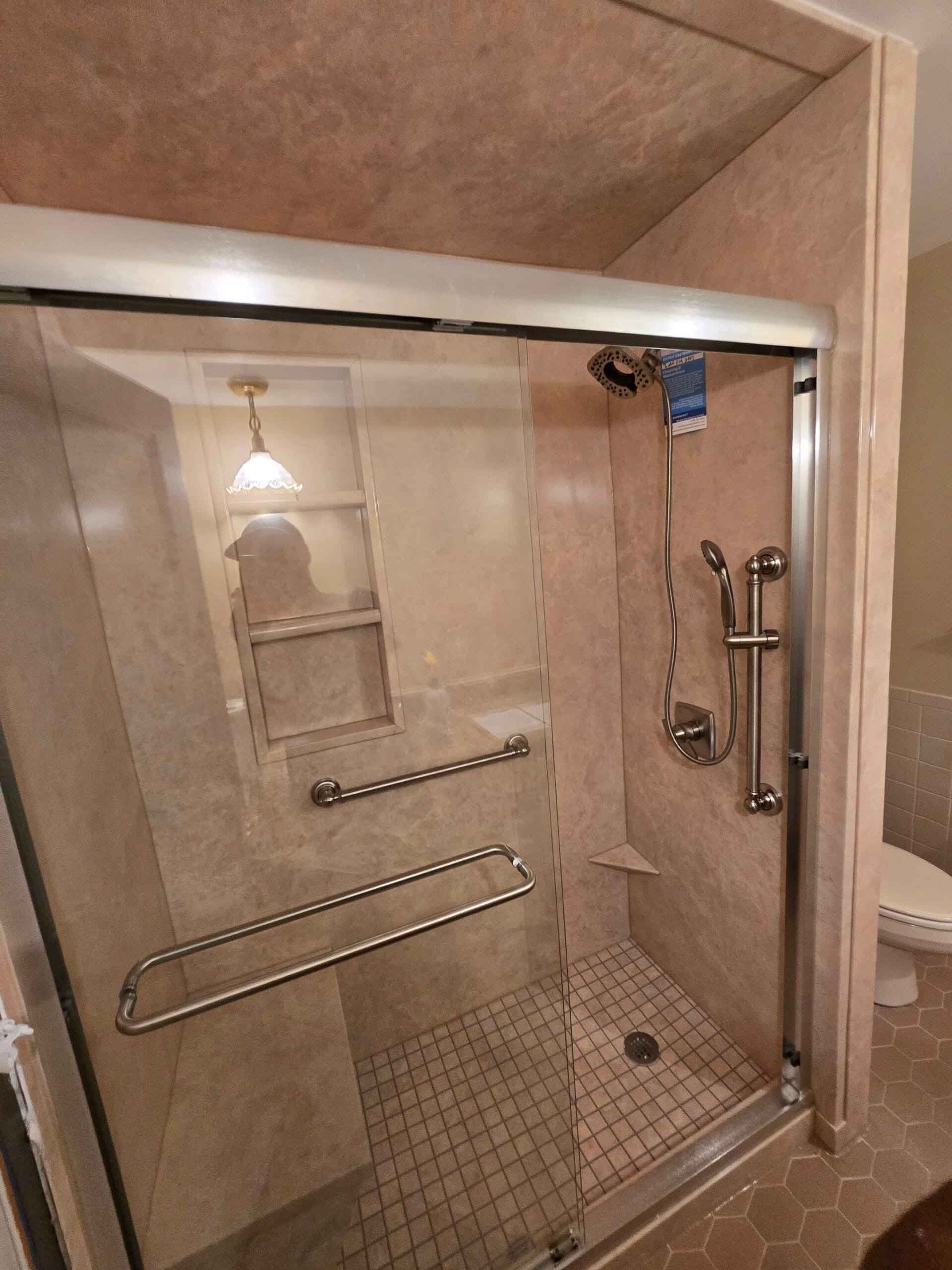 The remodel introduced a walk-in shower system with soft beige stone-patterned composite wall panels extending fully to the ceiling. The new layout includes a built-in corner bench and recessed wall shelving for storage, both seamlessly integrated into the panel system. A chrome framed double-sliding glass door system was added, featuring rain-resistant coating to minimize spotting. Fixtures were upgraded to brushed nickel, including a square multi-function handheld showerhead on a flexible hose and an integrated safety grab bar anchored to the back wall. The base was replaced with a square-patterned low-threshold floor and new central drainage, enhancing accessibility and safety.
