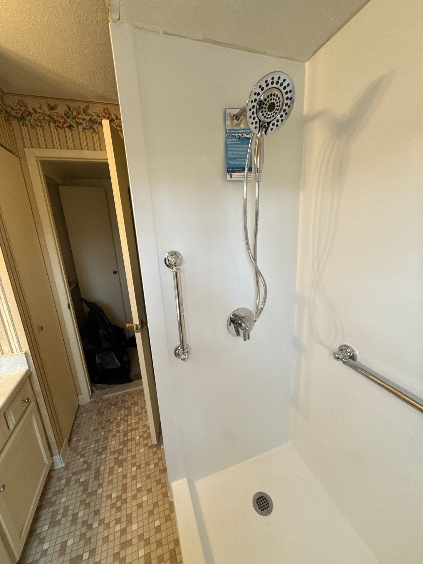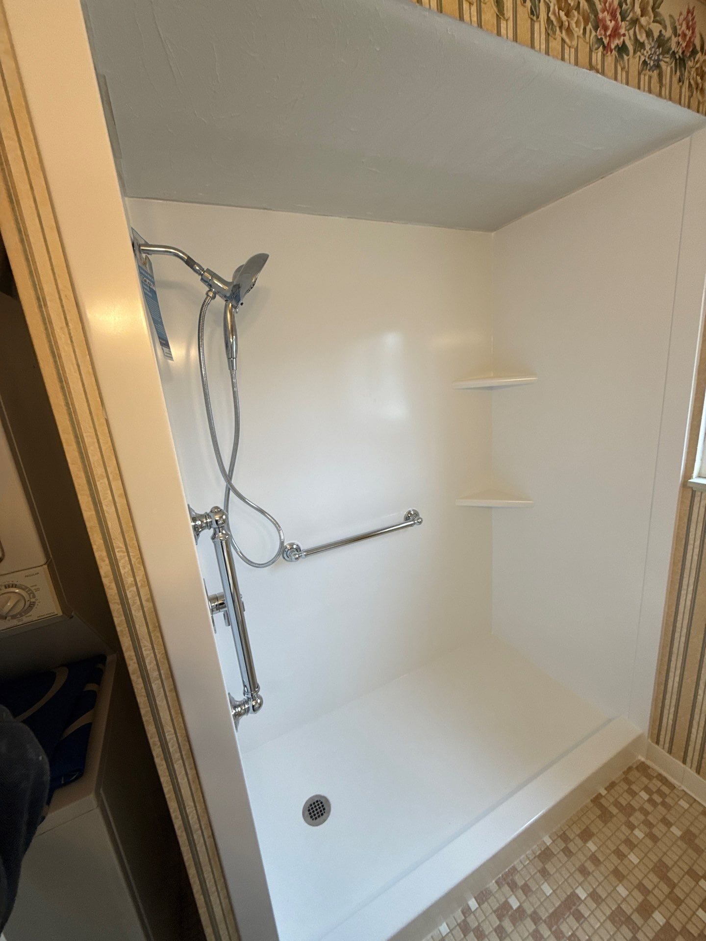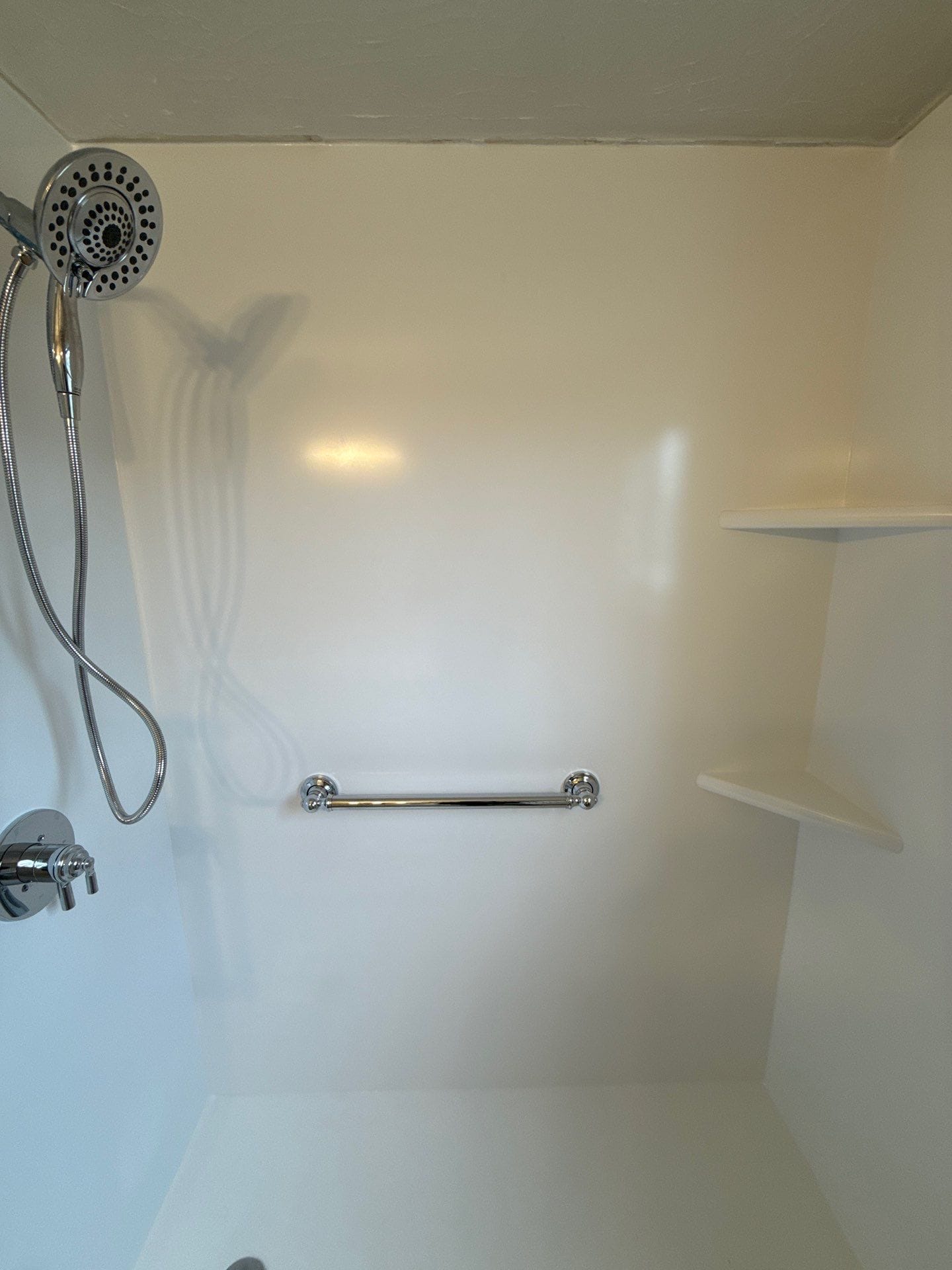 * Chrome handheld shower fixture and controls
