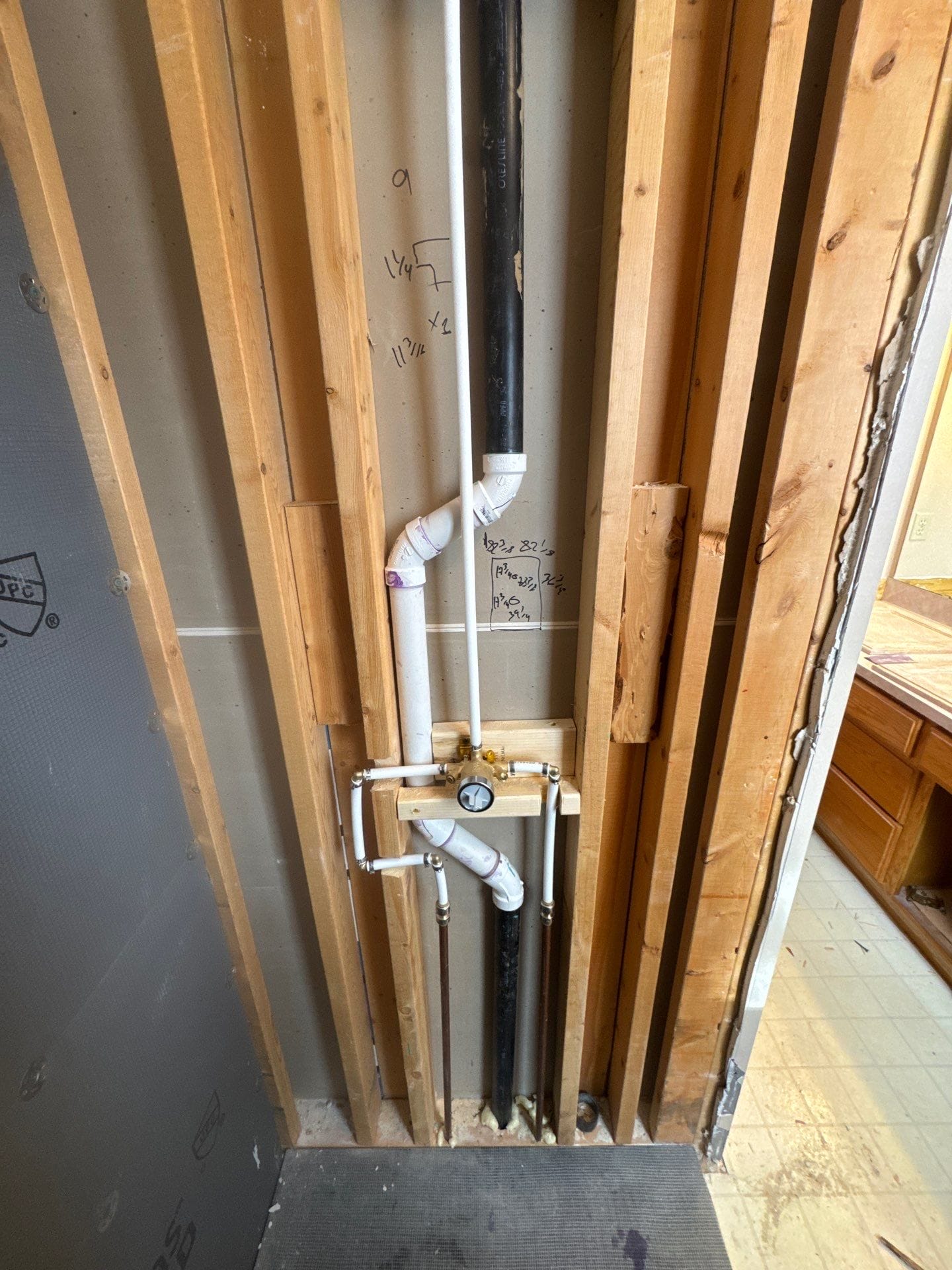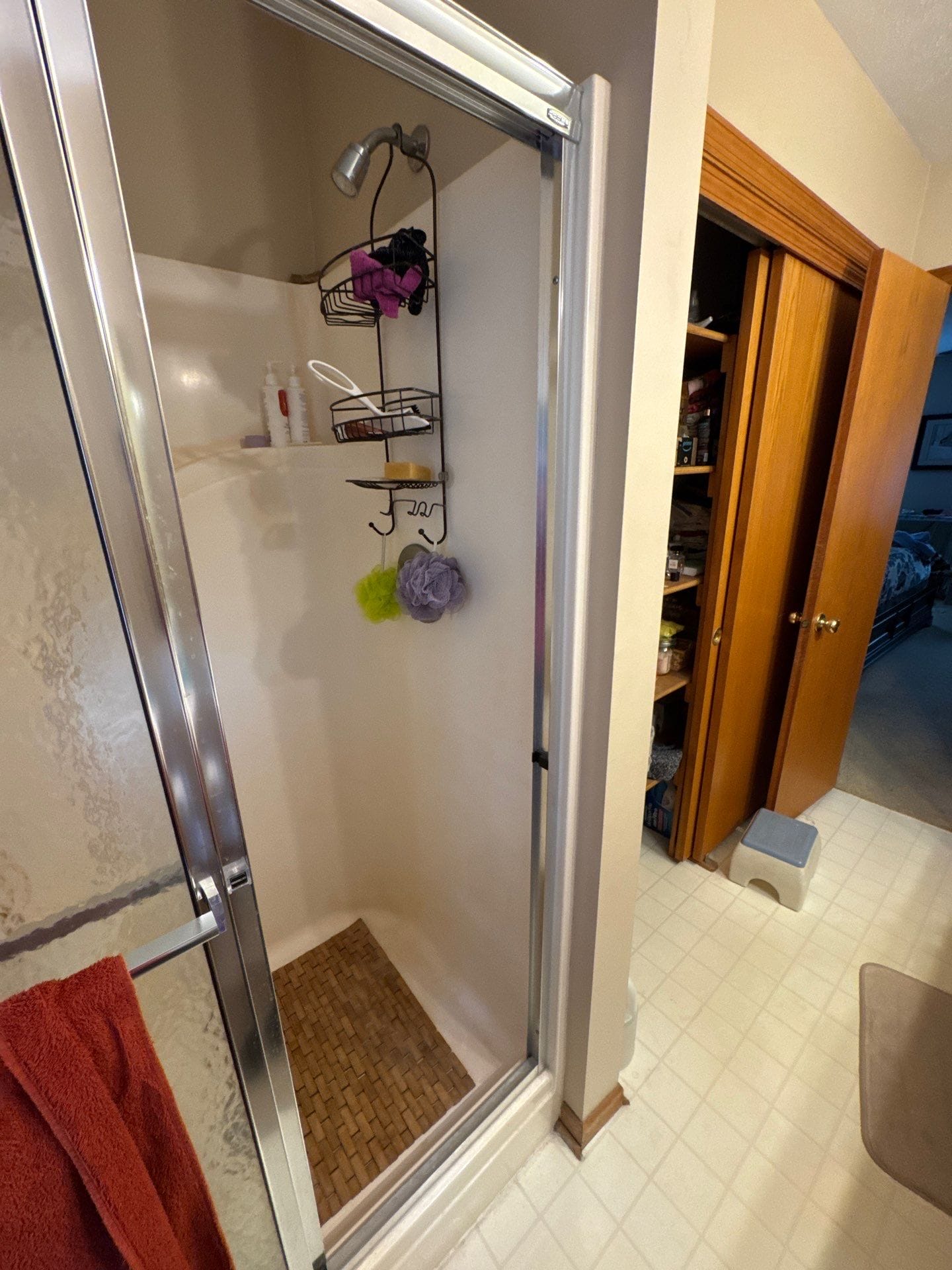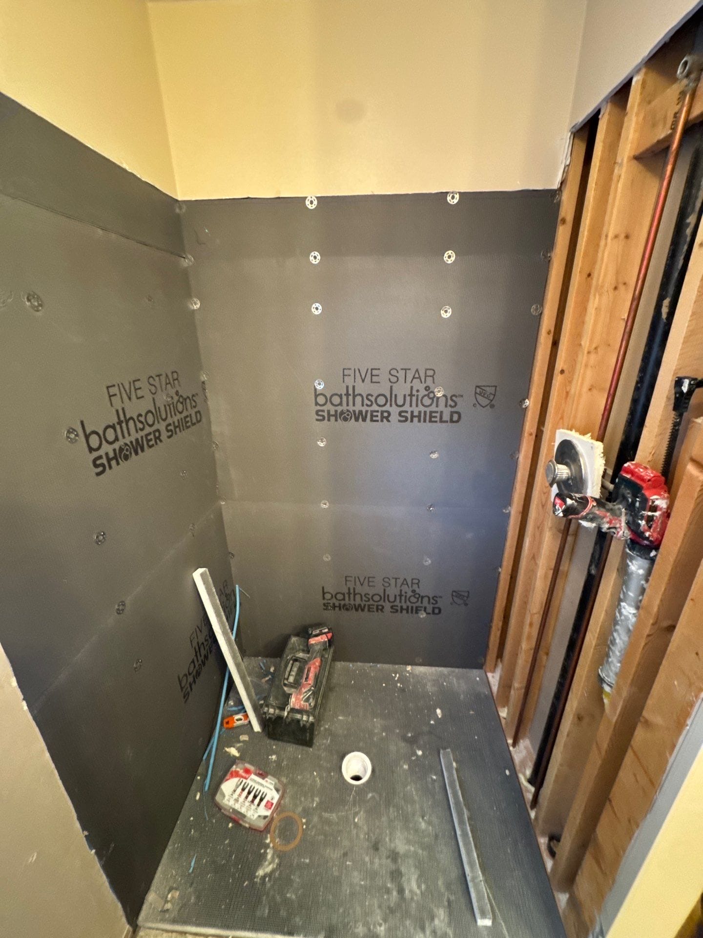Installation included full demolition to the studs, application of waterproof backer board, and secure placement of new composite panels. A custom-fit glass enclosure was installed instead of a curtain rod, paired with a chrome Delta control and fixture. A triangular corner bench was integrated into the new design, with two matching corner shelves for basic storage. The remodel was completed within the expected two-day timeline after materials were finalized and delivered.