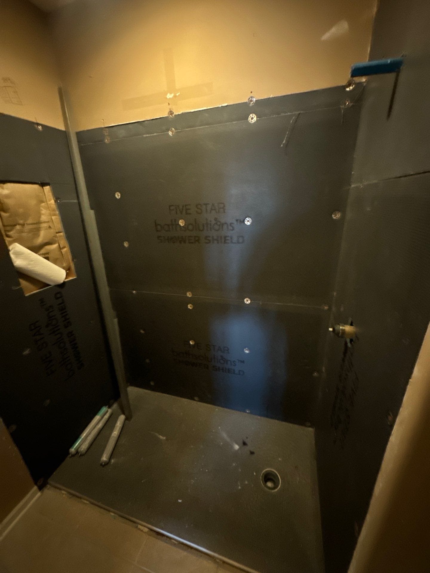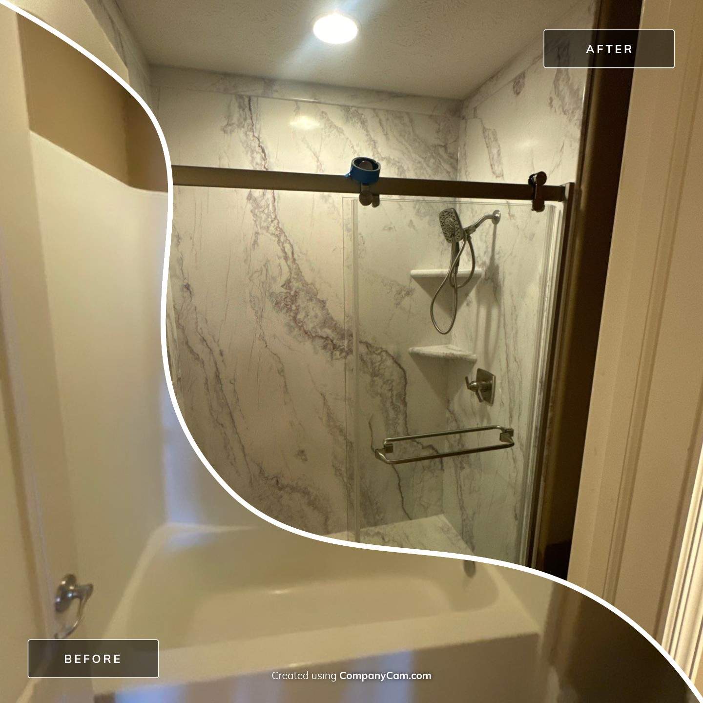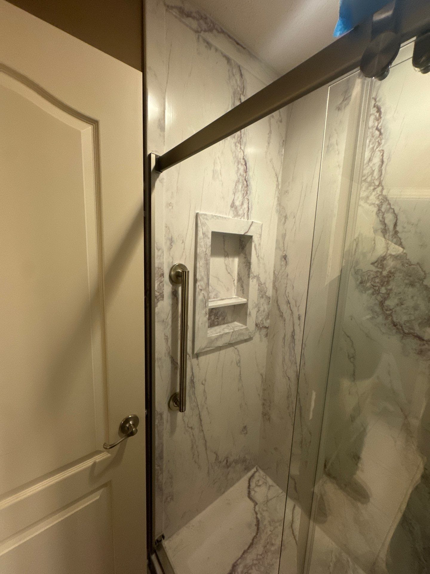 Installation was completed as a two-day process beginning with full demolition to the studs and inspection of subfloor conditions. Plumbing was upgraded to include a new Delta pressure-balanced valve, a two-inch drain, and updated PEX lines. The custom panels were installed alongside a matching set of three shelves and a clear sliding glass door system. A shave step was incorporated for easier entry, and minor trim adjustments around the window opening were also performed. Although an oil-rubbed bronze fixture was initially considered, the installed finish matches the updated metallic tone seen in the after image. Five Star also offered future flexibility to swap the door for a curtain setup if preferred.