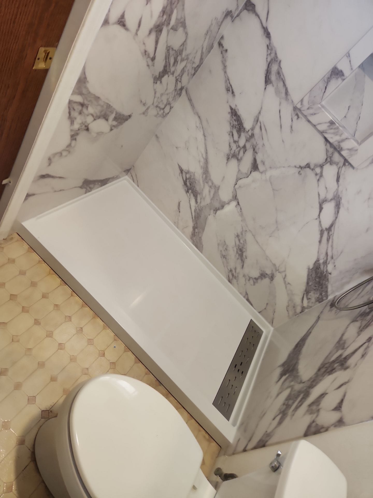 The installation process began with full demolition down to the studs, followed by inspection and replacement of older plumbing lines, including the valve, trap, and drain, upgraded with PEX piping. Although no seating or ceiling lighting upgrades were included in the final scope, the shower area was fully rebuilt for waterproofing, durability, and safety. All waste material was hauled off as part of the package. A second set of final measurements ensured fit precision, and all work was completed using Five Star’s licensed, bonded in-house team.