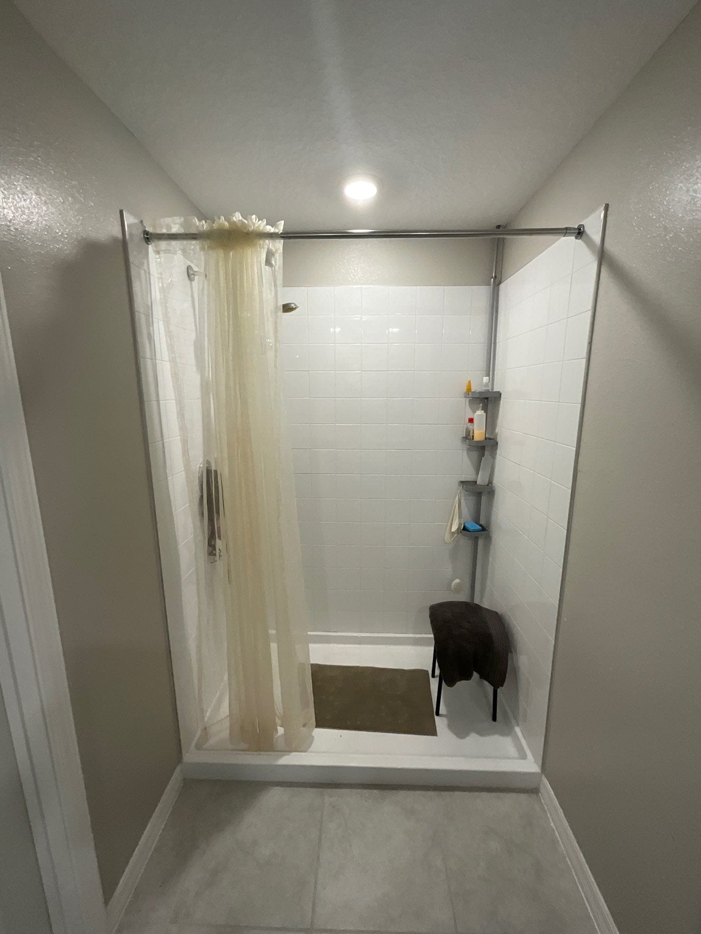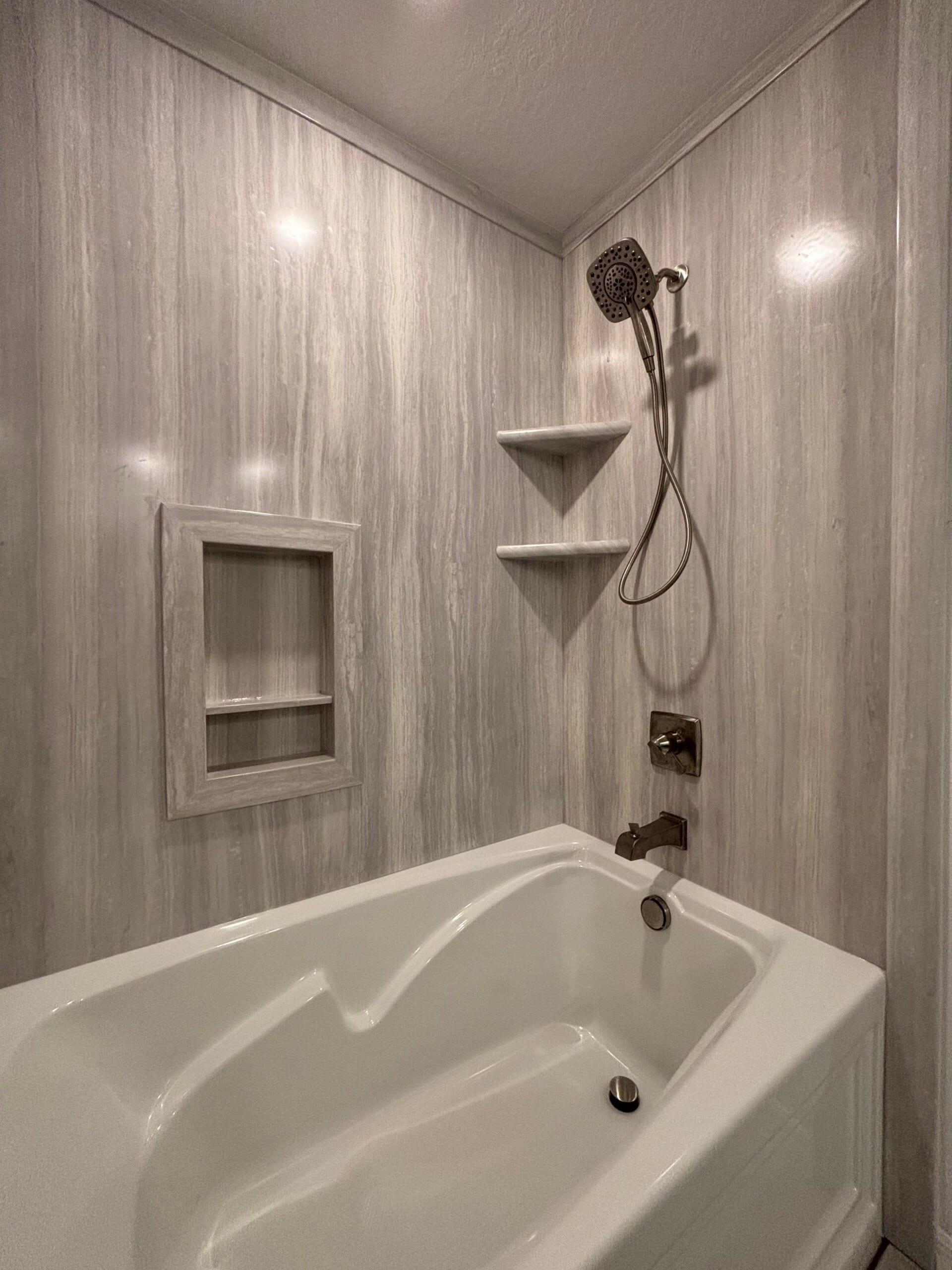 Installation began with full removal of the previous acrylic shower unit, followed by structural review and preparation of new plumbing. The soaking tub was reinforced and insulated for thermal retention, and pressure-balanced Delta plumbing was installed to regulate water temperature and flow. The Smart Choice walls were cut and placed precisely to align with the new configuration, with antimicrobial marine-grade sealant applied to all seams. A recessed wall niche was included in the rear wall for additional storage. The entire remodel was completed within a short on-site window following the manufacturing lead time.