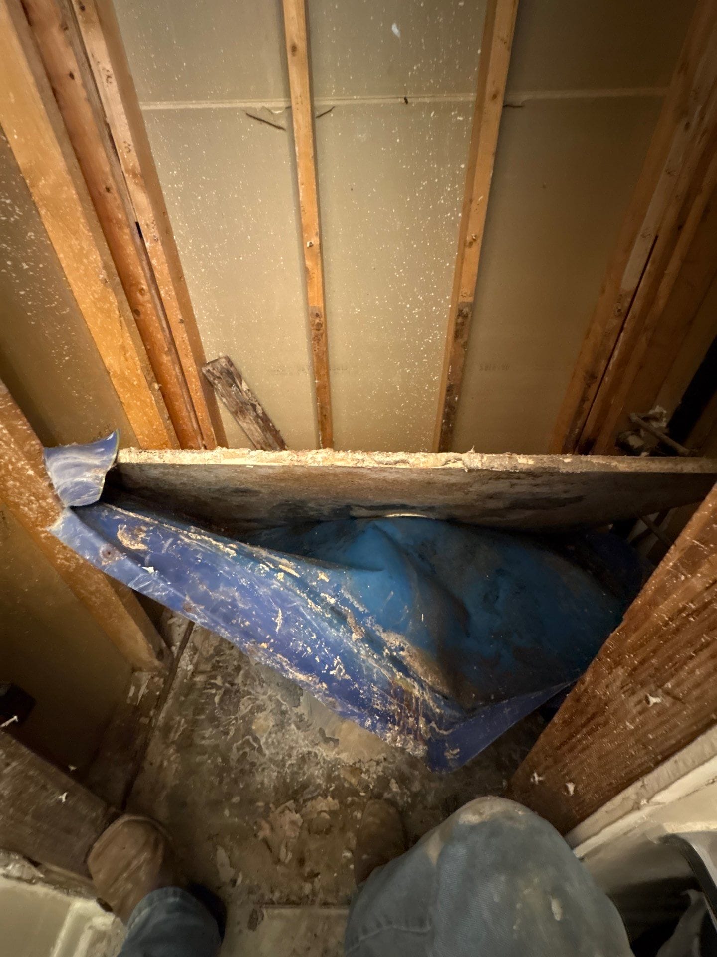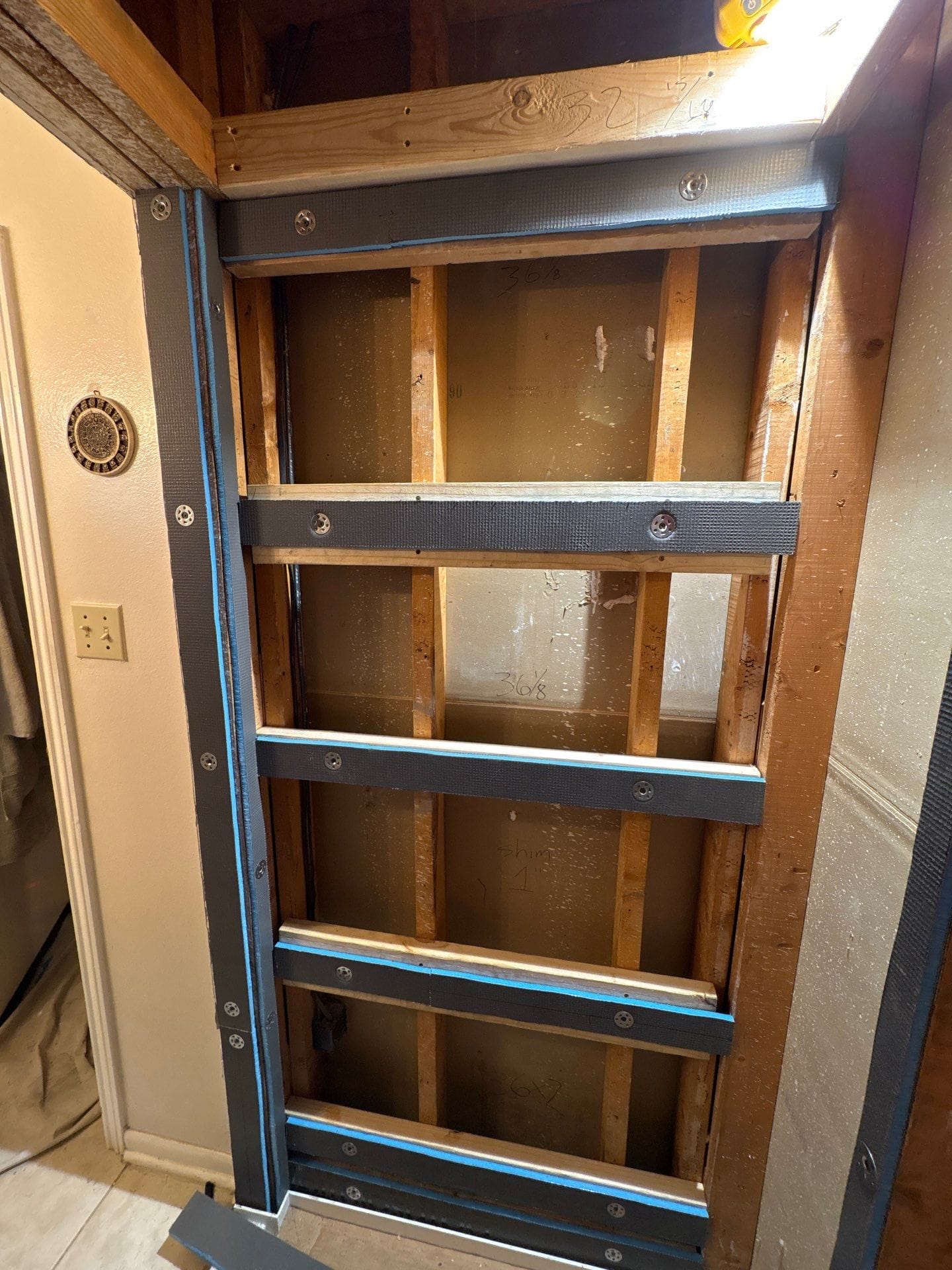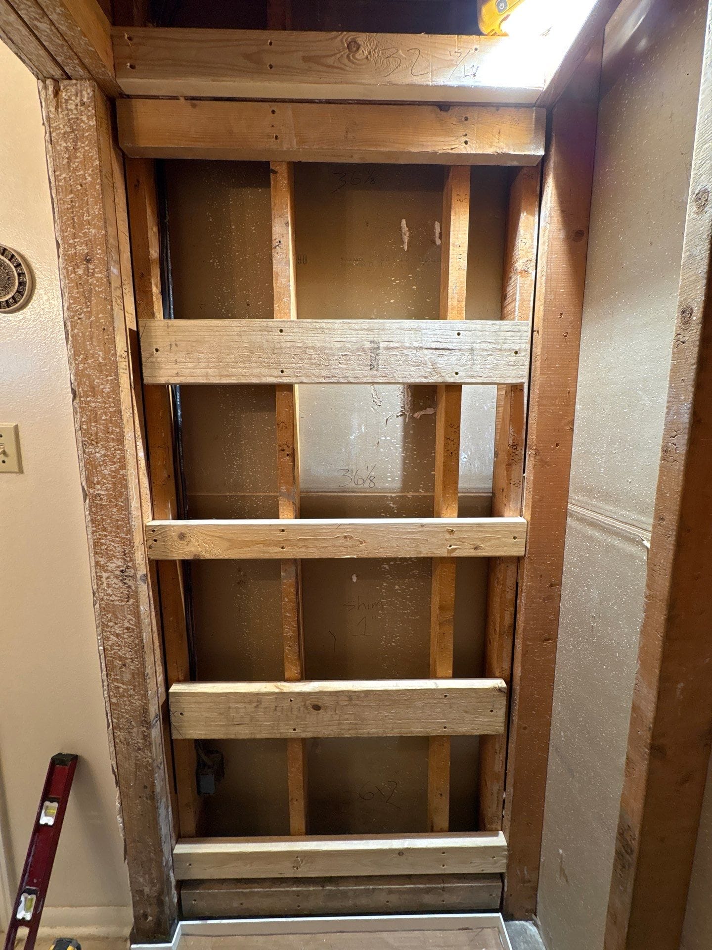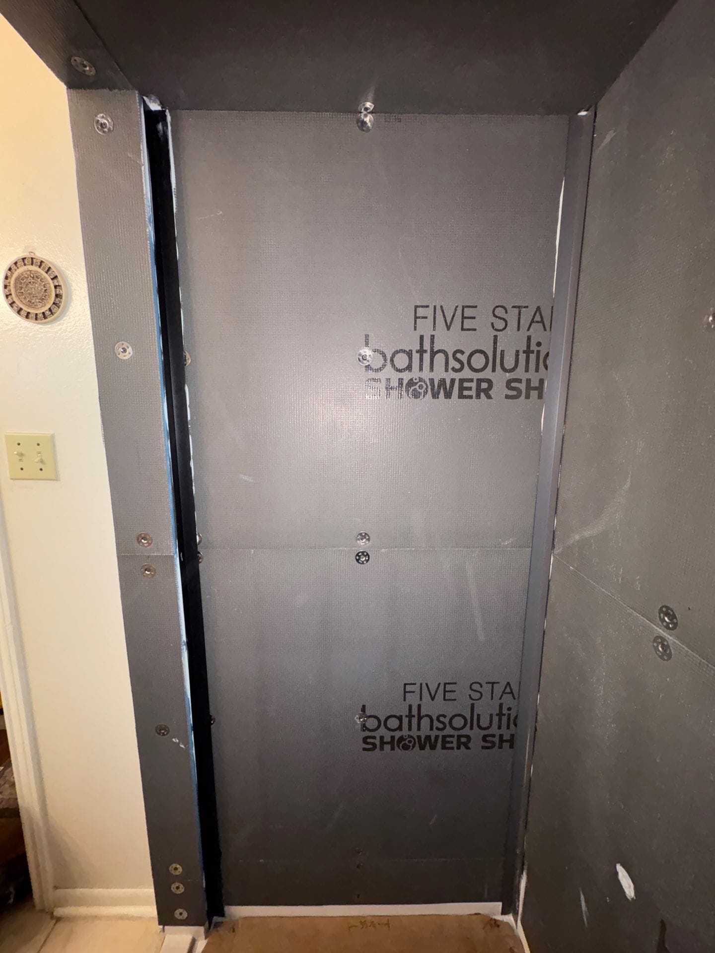 Installation scope covered full demolition, plumbing relocation, and layout adjustments to accommodate a centered drain and relocated showerhead. The enclosure was reframed for square alignment and finished with two corner shelves and a brushed nickel grab bar, per the customer's request. No bench was included. The final installation reflects a low-profile, slip-resistant shower base and a fully wrapped, tile-look wall system that blends seamlessly with surrounding surfaces.