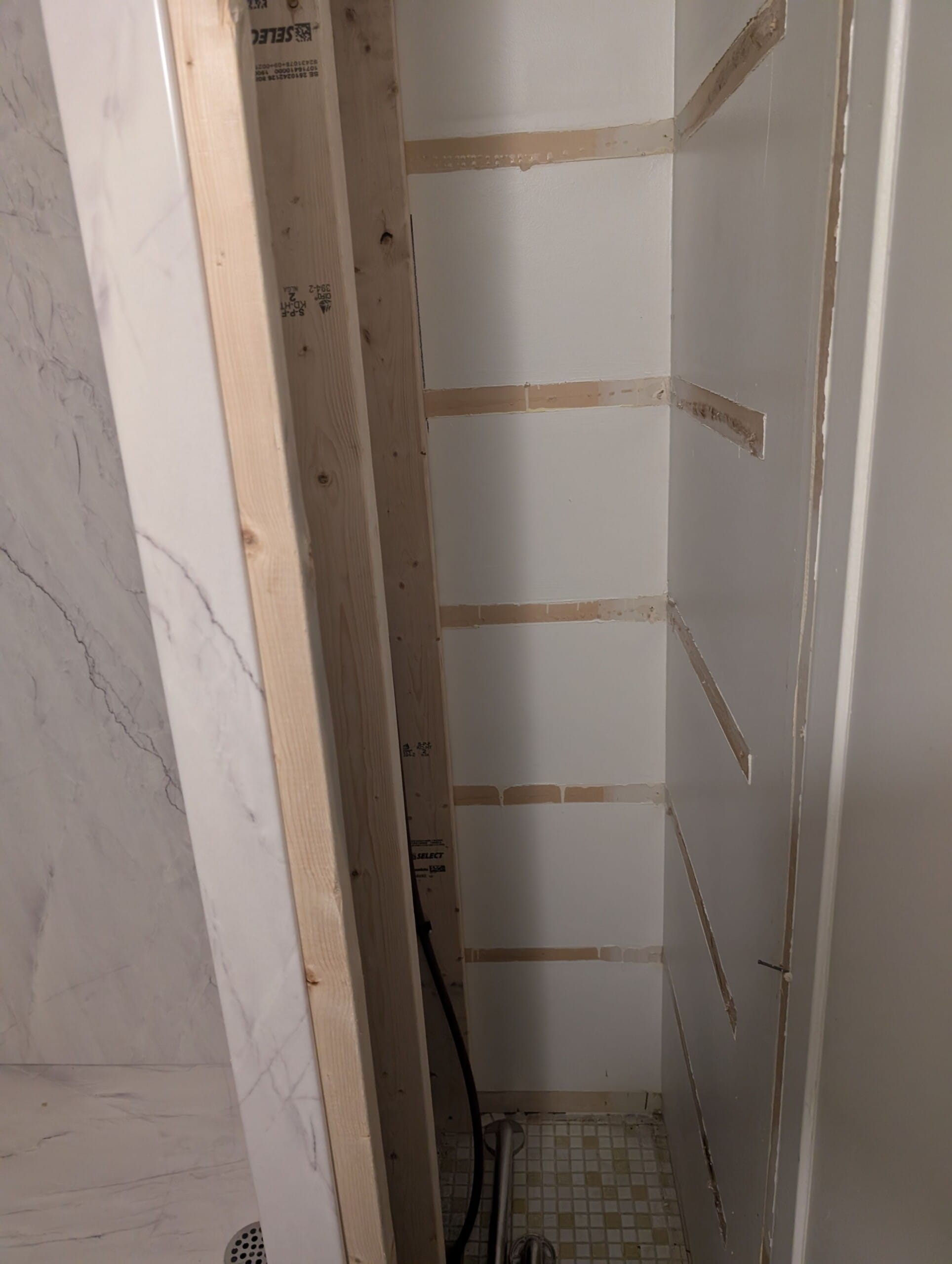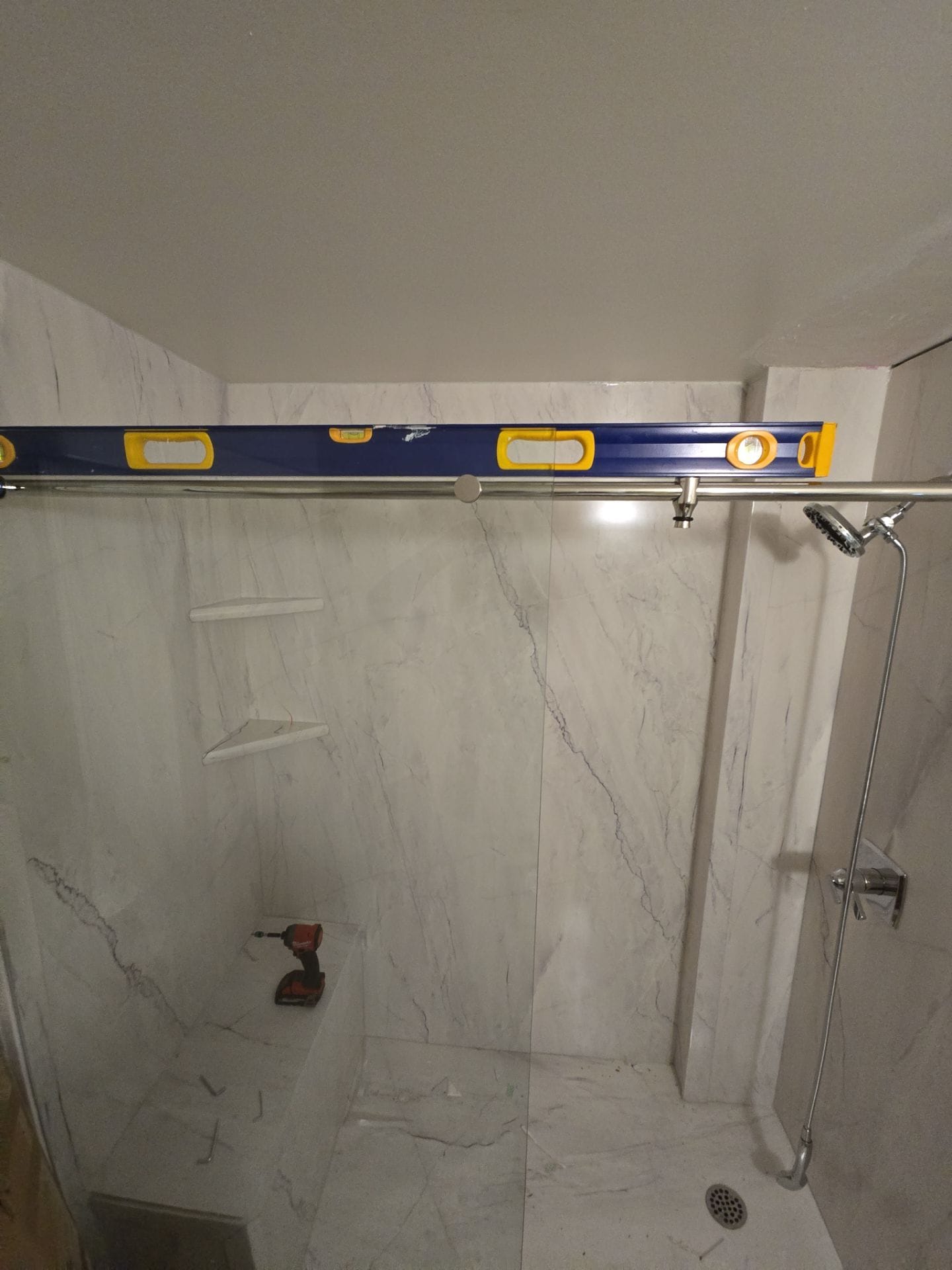 The remodel involved complete removal of the walk-in tub and old fixture surrounds, followed by the installation of a new low-threshold shower base and full-height marble-style wall panels. The new layout included a polished chrome handheld shower system, corner shelving, and a securely mounted grab bar placed at an ergonomic height for support. Frameless glass sliding doors on a barn-style track added visual openness and practical access to the space. The installation was performed by in-house technicians and completed within two days, including layout reconfiguration, drain adjustments, and haul-away of debris.