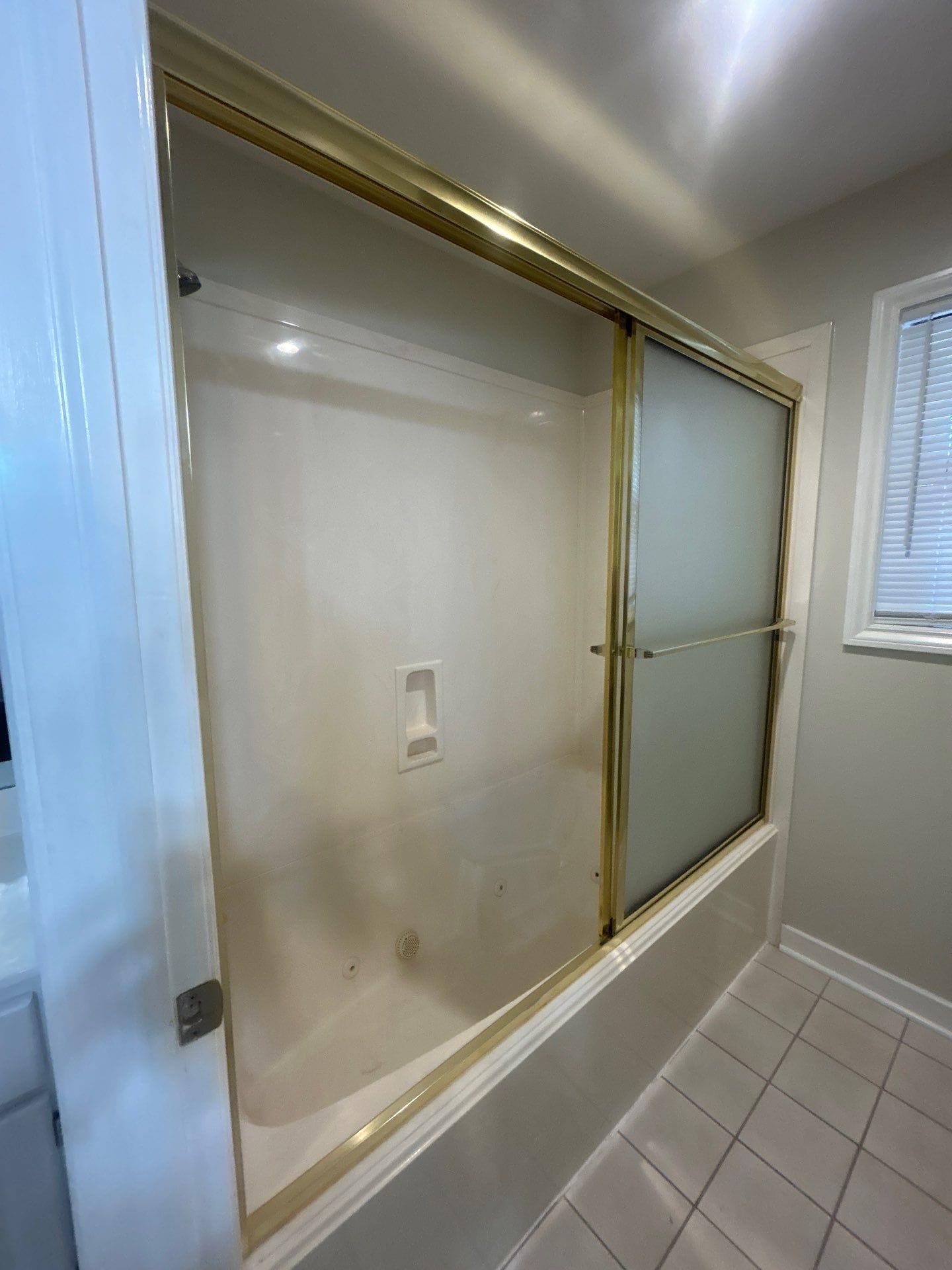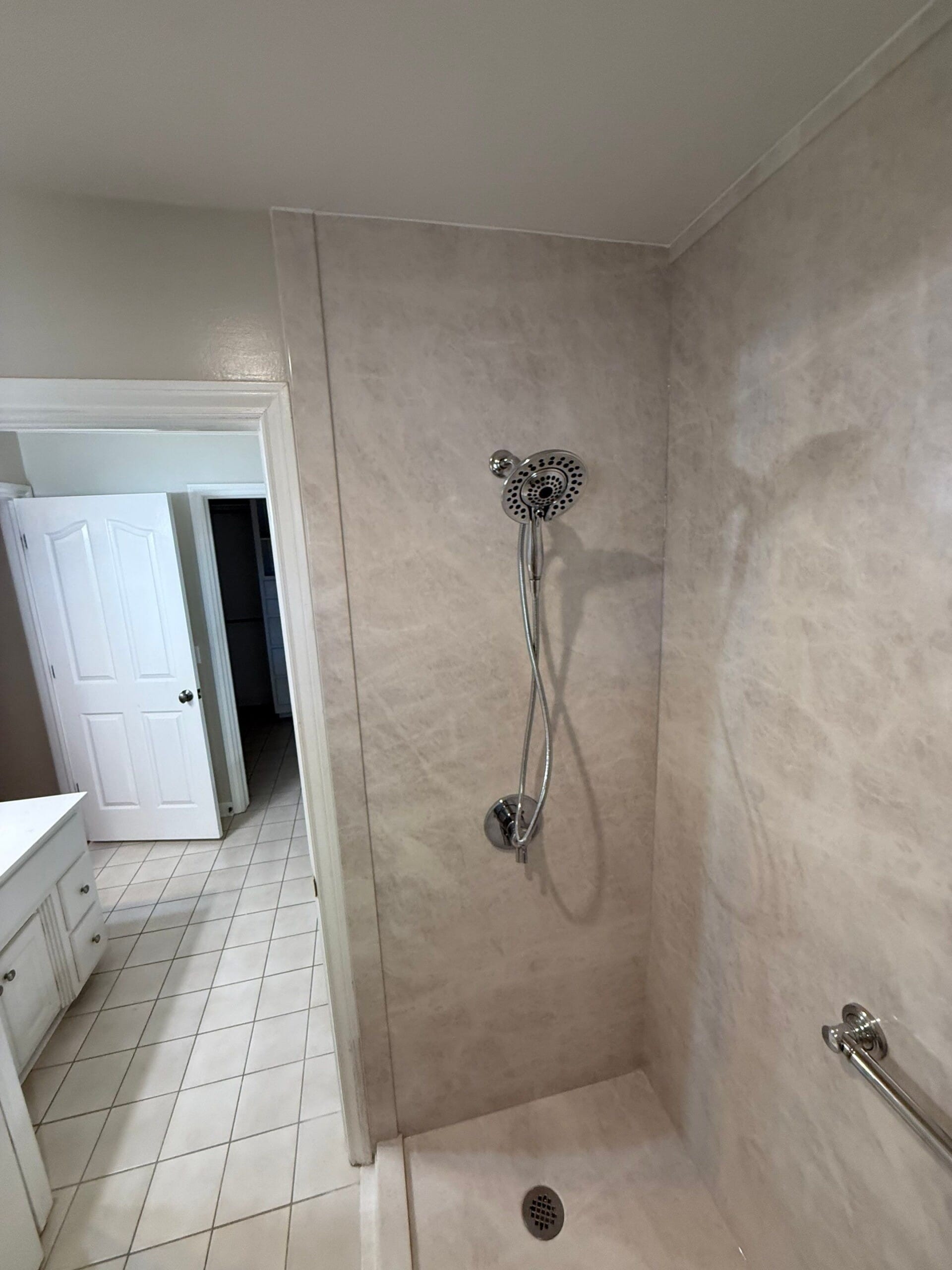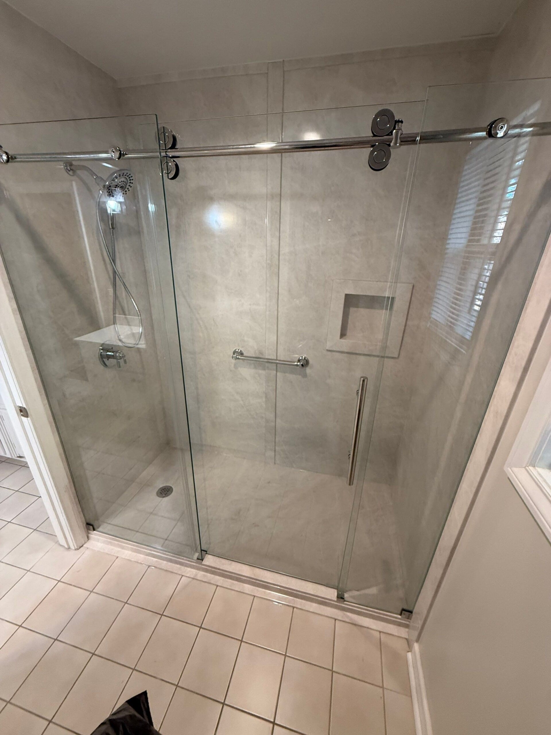 The remodeled space now features Calcutta White composite wall panels with subtle gray veining, paired with a low-threshold solid PVC shower base. The shower includes a handheld wand integrated into a brushed nickel Delta fixture set and a minimalist corner shelf. Safety was addressed with two ADA-compliant grab bars, while a recessed wall niche added storage without intruding on space. A frameless bypass glass door system with exposed rollers completed the look, emphasizing visibility and openness without visual clutter.