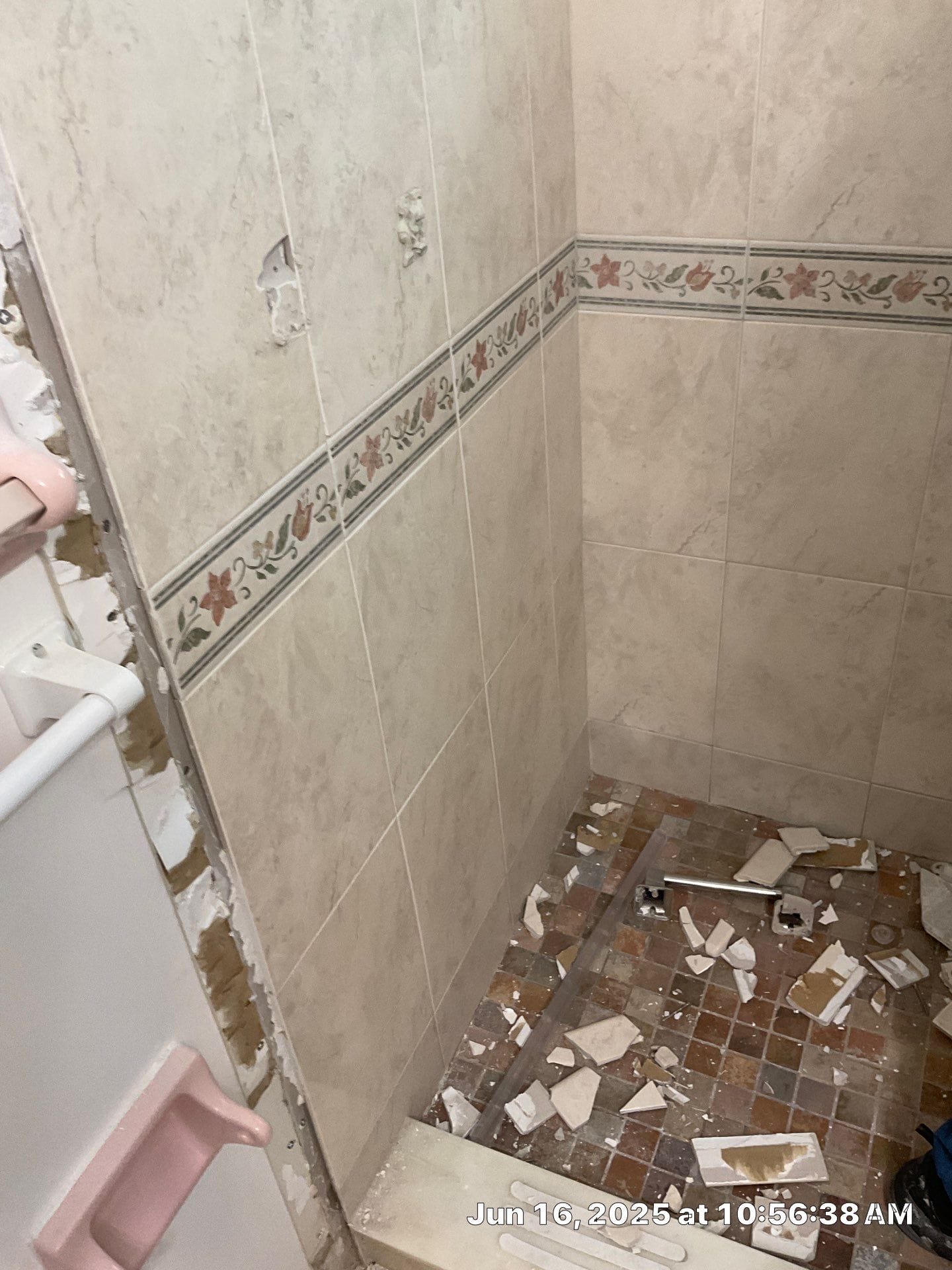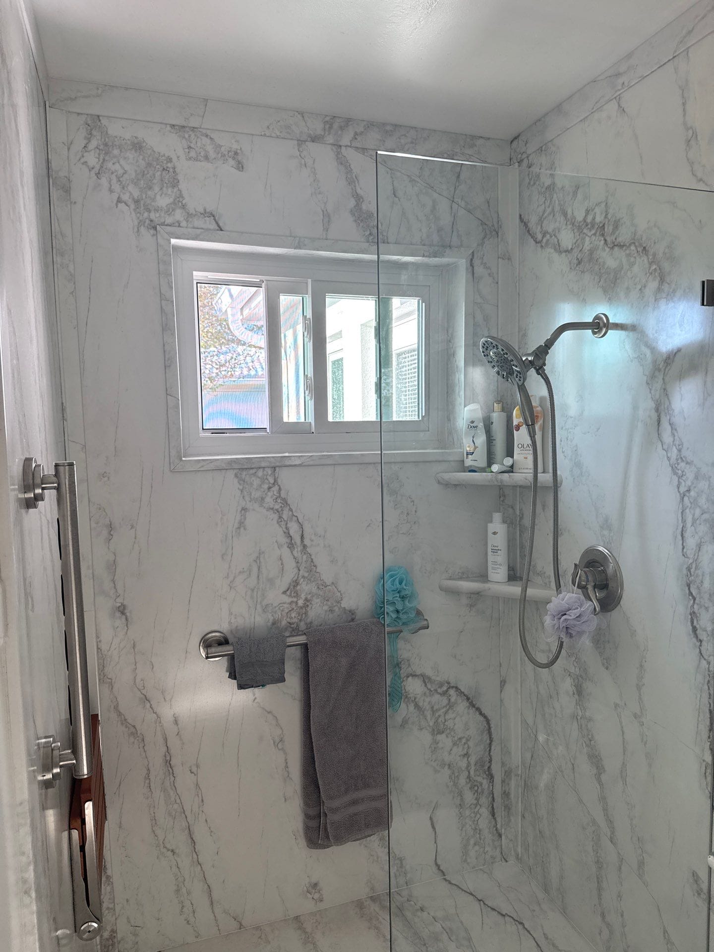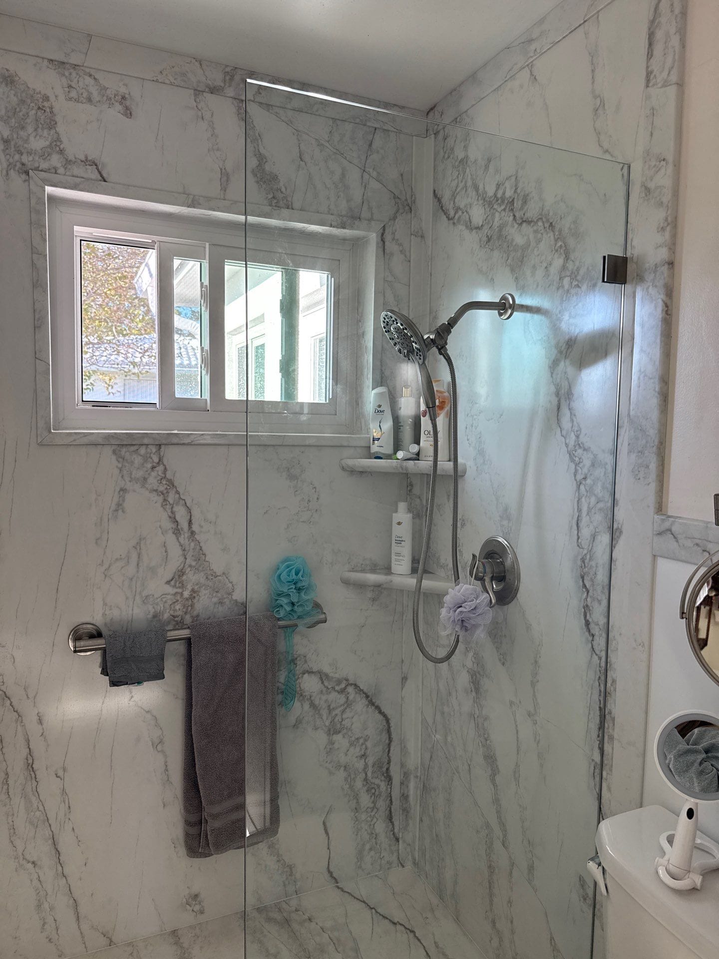 Installation began with full removal of tile walls and mosaic floor down to the studs. Moisture-exposed sections were addressed before placing Hydro Block and DuraShield inorganic backer boards. Composite Smart Choice panels were installed floor-to-ceiling, with precision cuts around the window opening. A modern low-threshold shower base was added, paired with chrome Delta fixtures and a glass splash panel. Quad-lock corner sealing and waterproof adhesive ensured no water penetration behind the walls. The job took two days to complete, with flooring protected throughout the home and debris fully removed the same day.