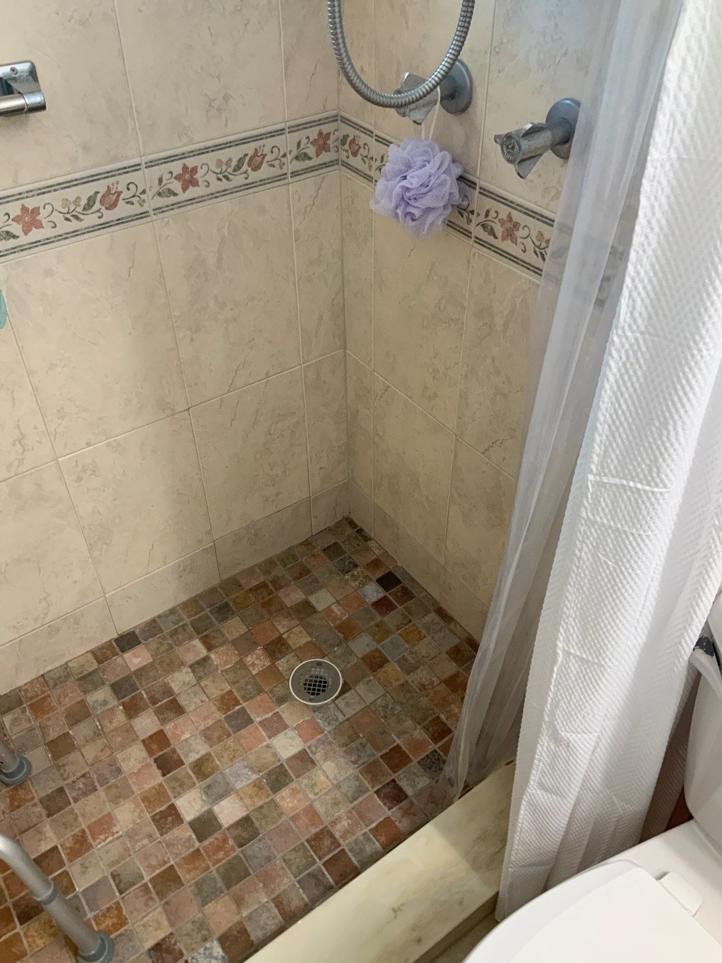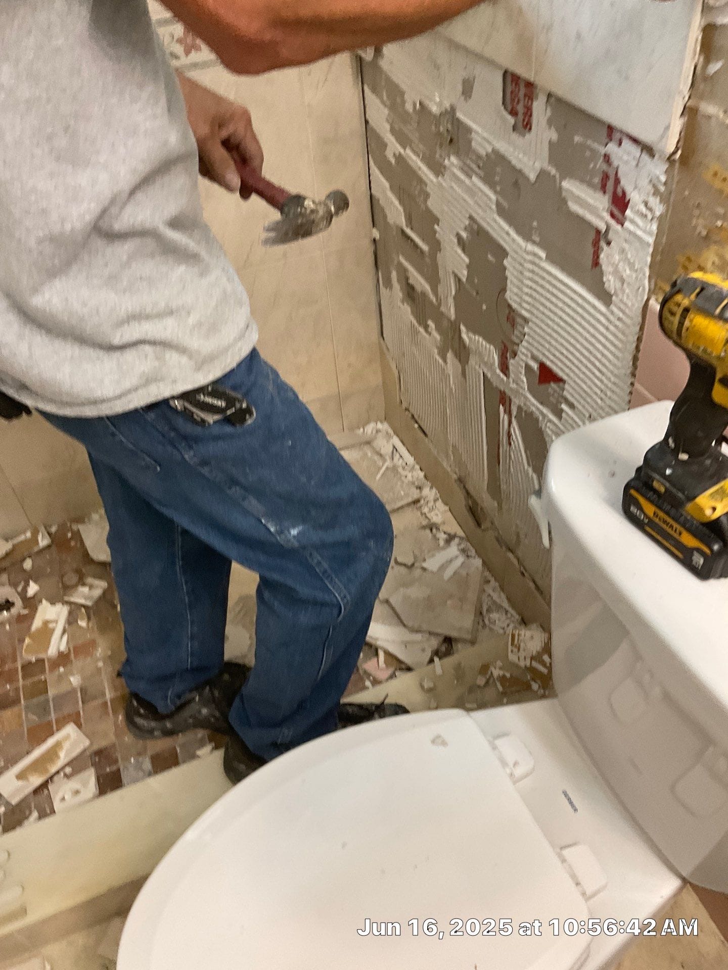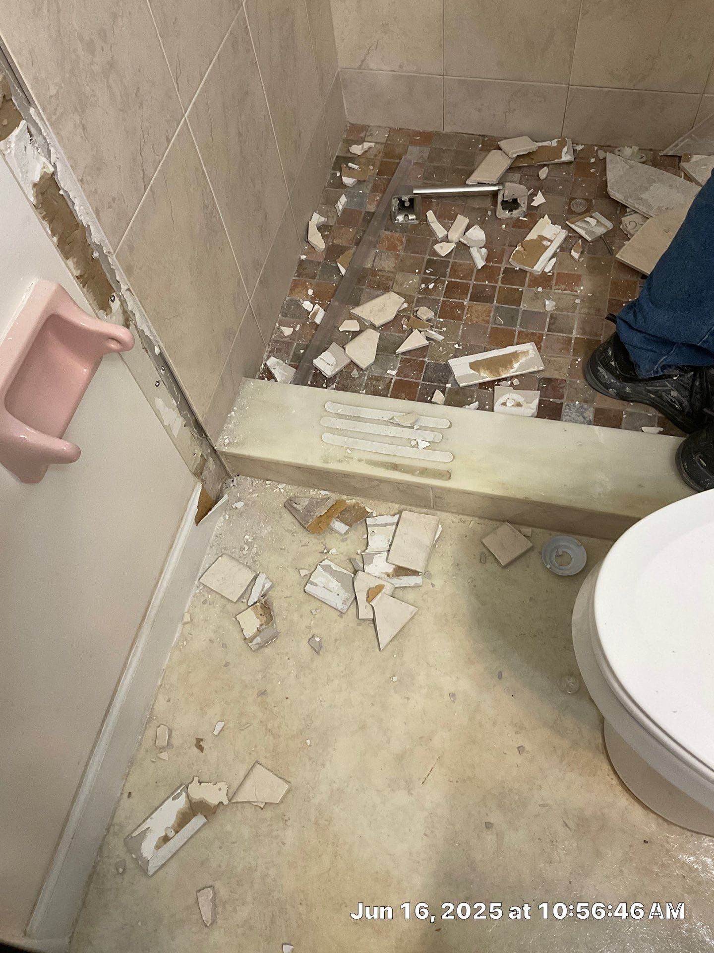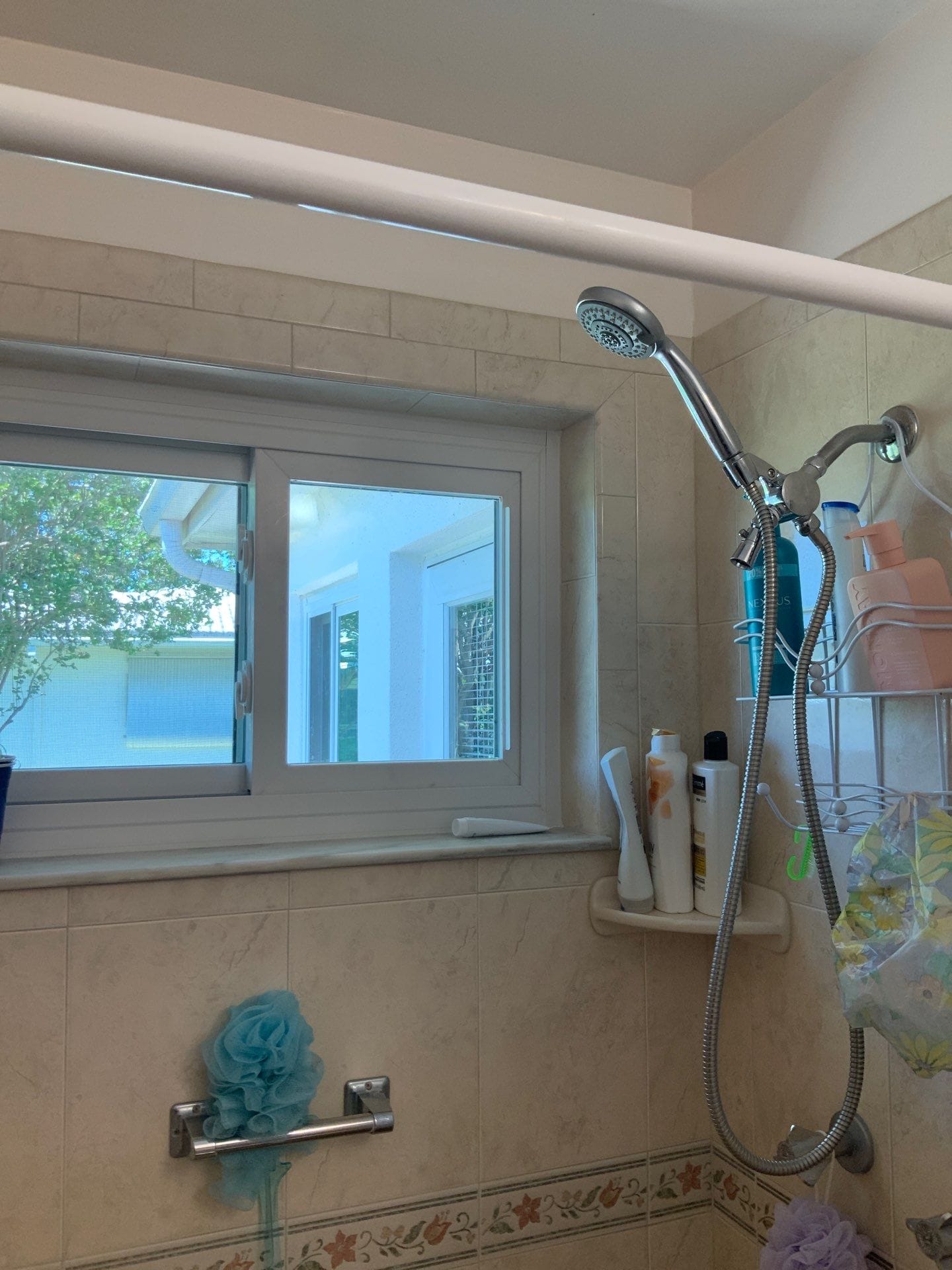 Installation began with full removal of tile walls and mosaic floor down to the studs. Moisture-exposed sections were addressed before placing Hydro Block and DuraShield inorganic backer boards. Composite Smart Choice panels were installed floor-to-ceiling, with precision cuts around the window opening. A modern low-threshold shower base was added, paired with chrome Delta fixtures and a glass splash panel. Quad-lock corner sealing and waterproof adhesive ensured no water penetration behind the walls. The job took two days to complete, with flooring protected throughout the home and debris fully removed the same day.