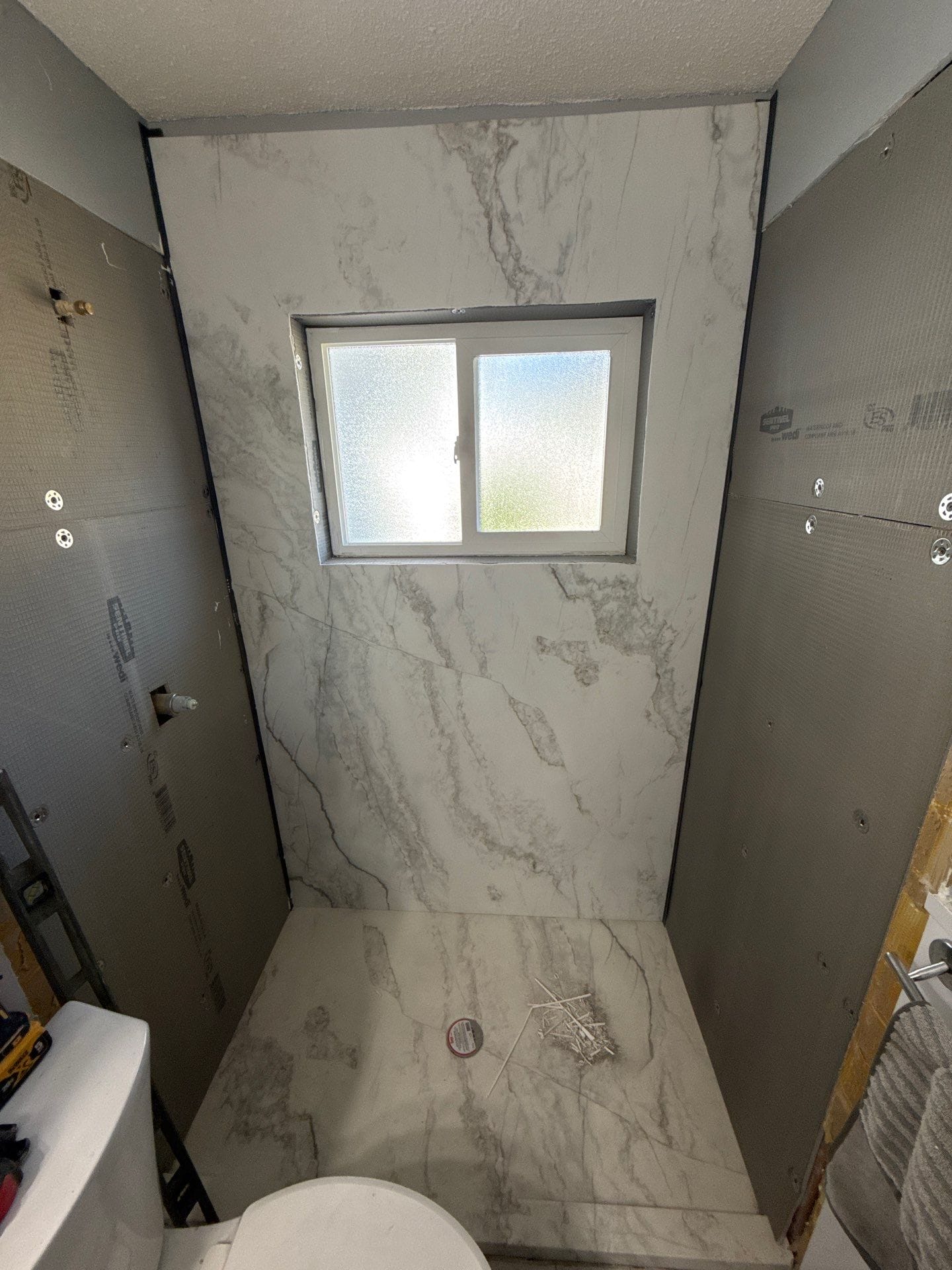 * Multi-layer composite wall panels in Calacatta or marble finishes