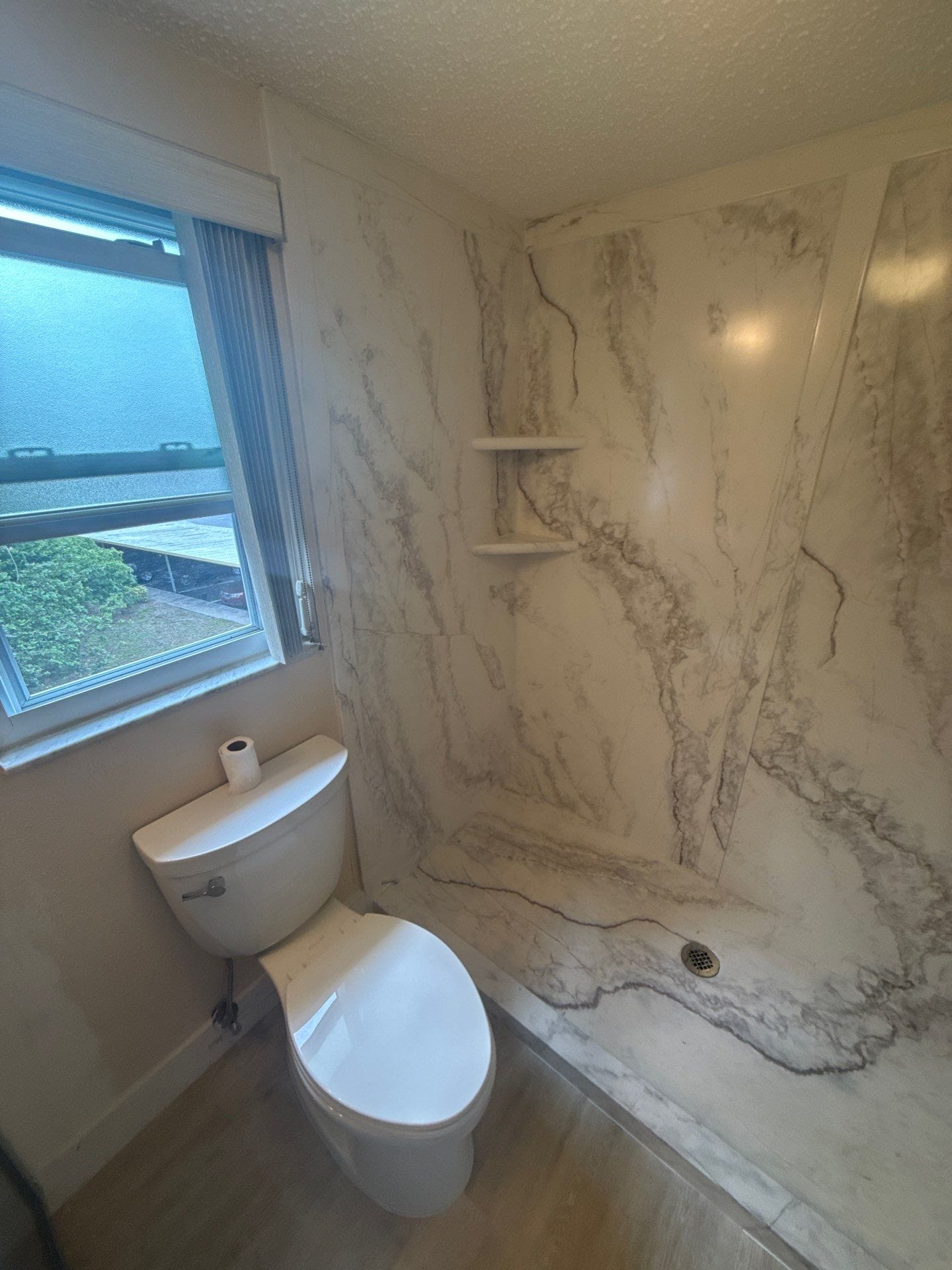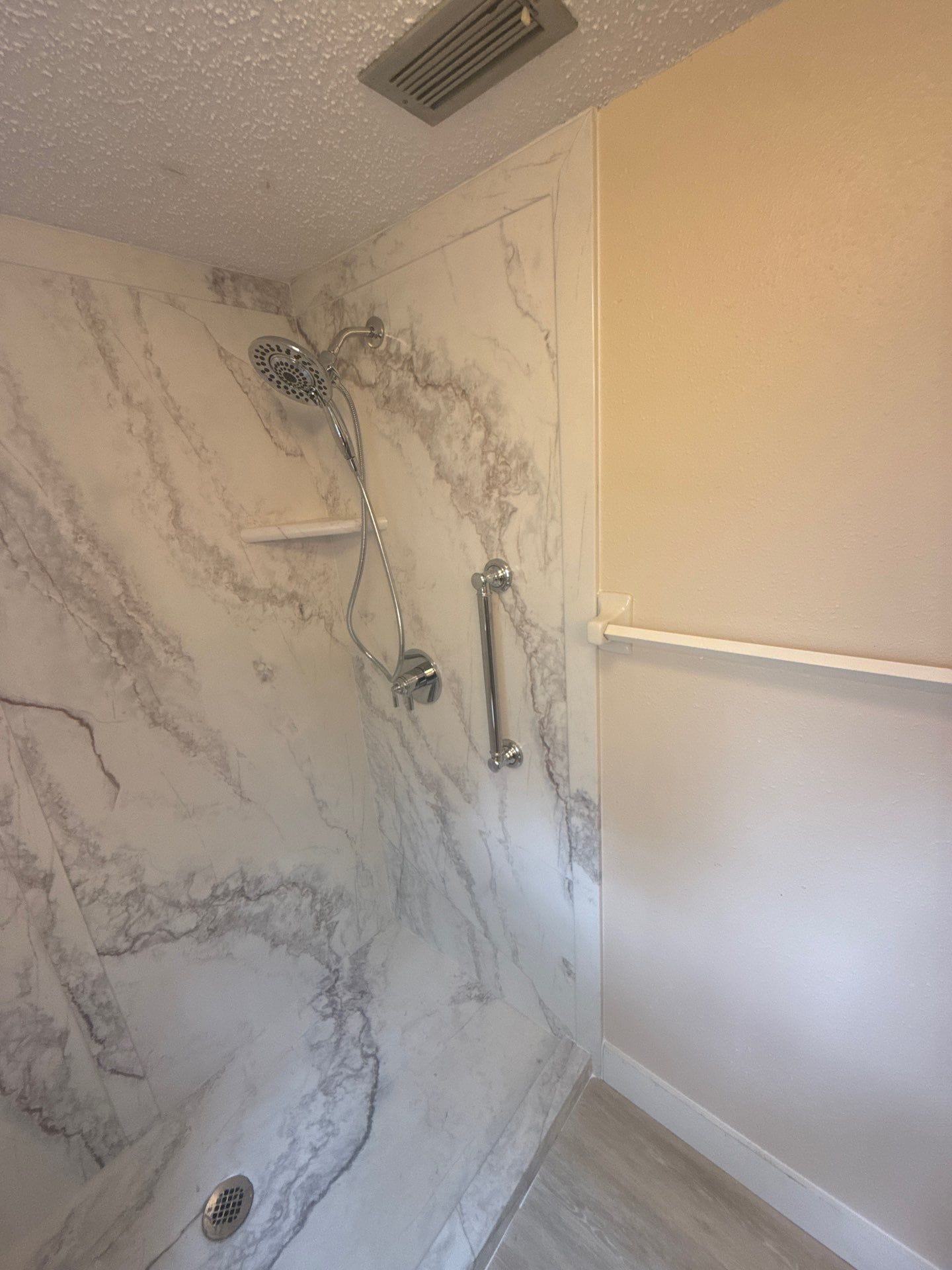 Five Star Bath Solutions, represented by the Representative, introduced a grout-free composite wall system in a white marble-style finish that aligns with the desired modern aesthetic shown in the completed images. The system provides a seamless, low-maintenance surface with antimicrobial and mold-resistant properties. The Representative emphasized the durability of the materials and the realistic stone appearance, along with upgraded brushed metal fixtures visible in the finished shower. The inclusion of integrated corner shelves and a strategically placed grab bar enhances both functionality and safety while maintaining a clean, cohesive design.