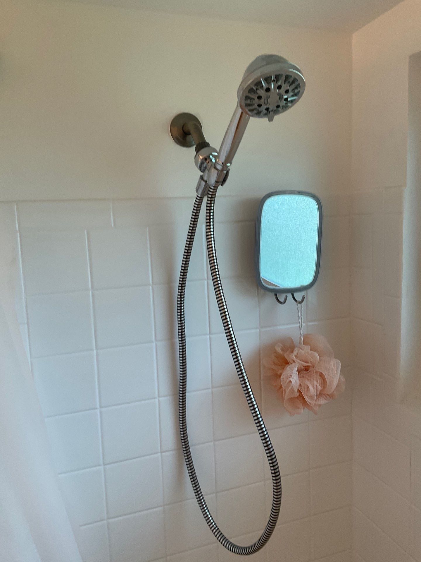 Shelby, the Five Star Bath Solutions representative, explained their grout-free composite system, offering realistic stone visuals without the upkeep of traditional tile. Panels and base were matched in a Calacatta-style matte marble finish, providing a seamless aesthetic. Shelby presented various color samples to coordinate with the bathroom’s existing tile. The composite material is non-porous, resistant to mold, and built for long-term durability.