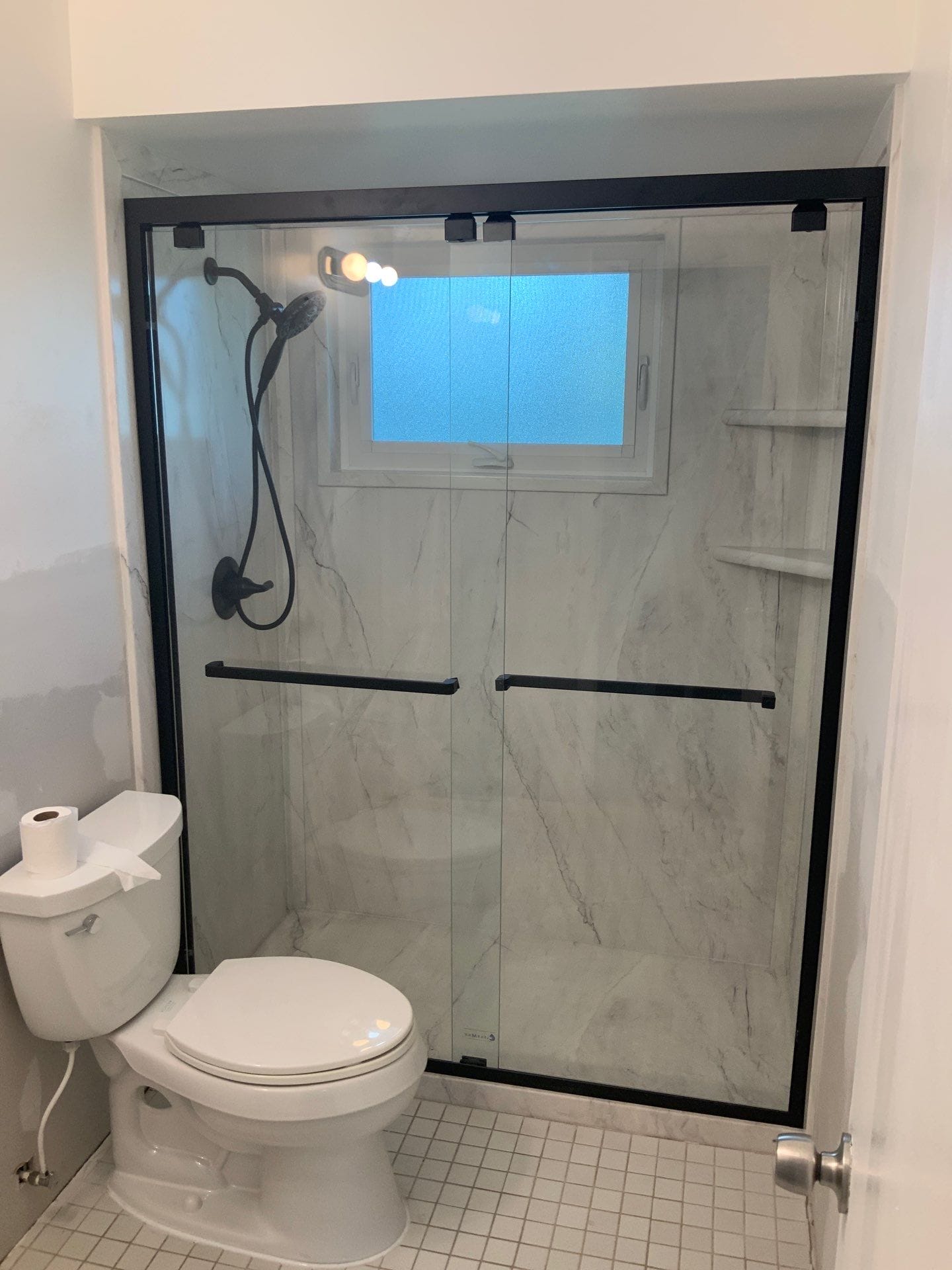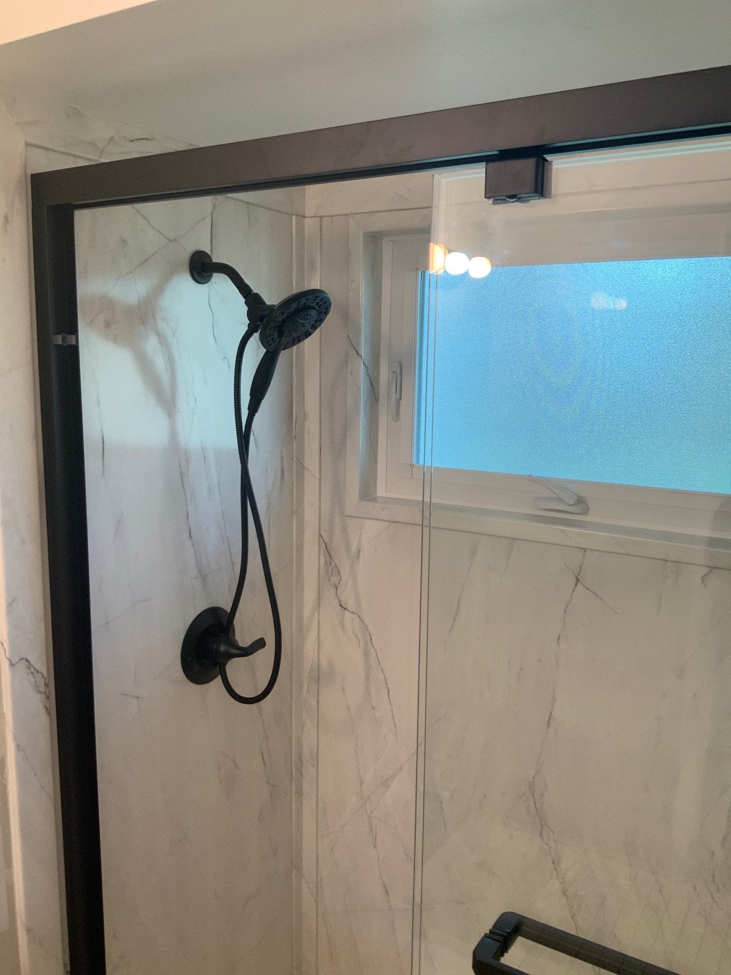 Installation was completed in two days by Five Star’s in-house crew. The process included full demolition to studs, waterproof backer installation, re-plumbing with commercial-grade Delta fixtures in a matte black finish, and panel mounting to ceiling height. A black-framed sliding glass door was installed along with two corner shelves. No reconfiguration of layout was needed, and the existing soffit remained in place. Site protection and cleanup were handled same day.