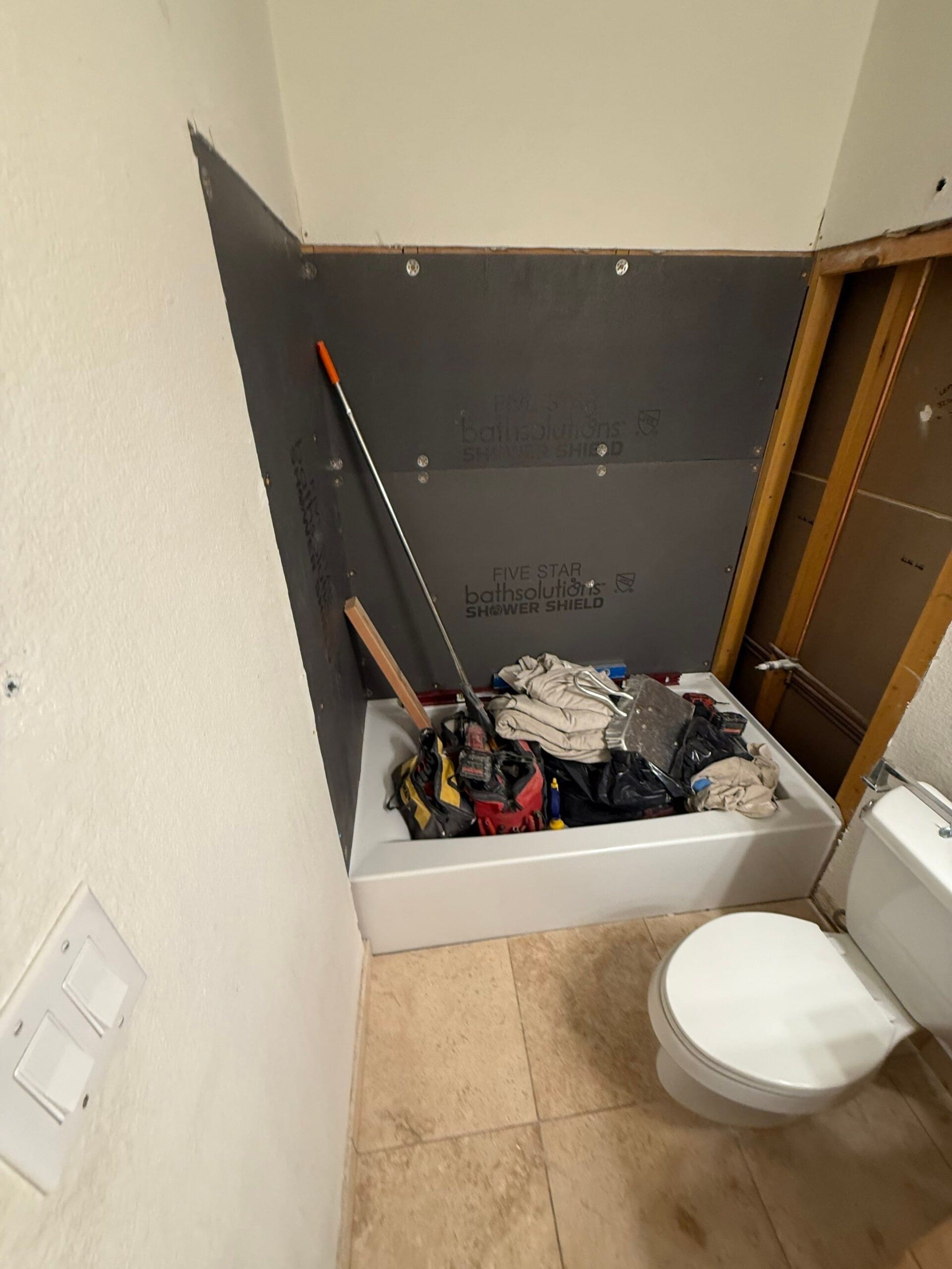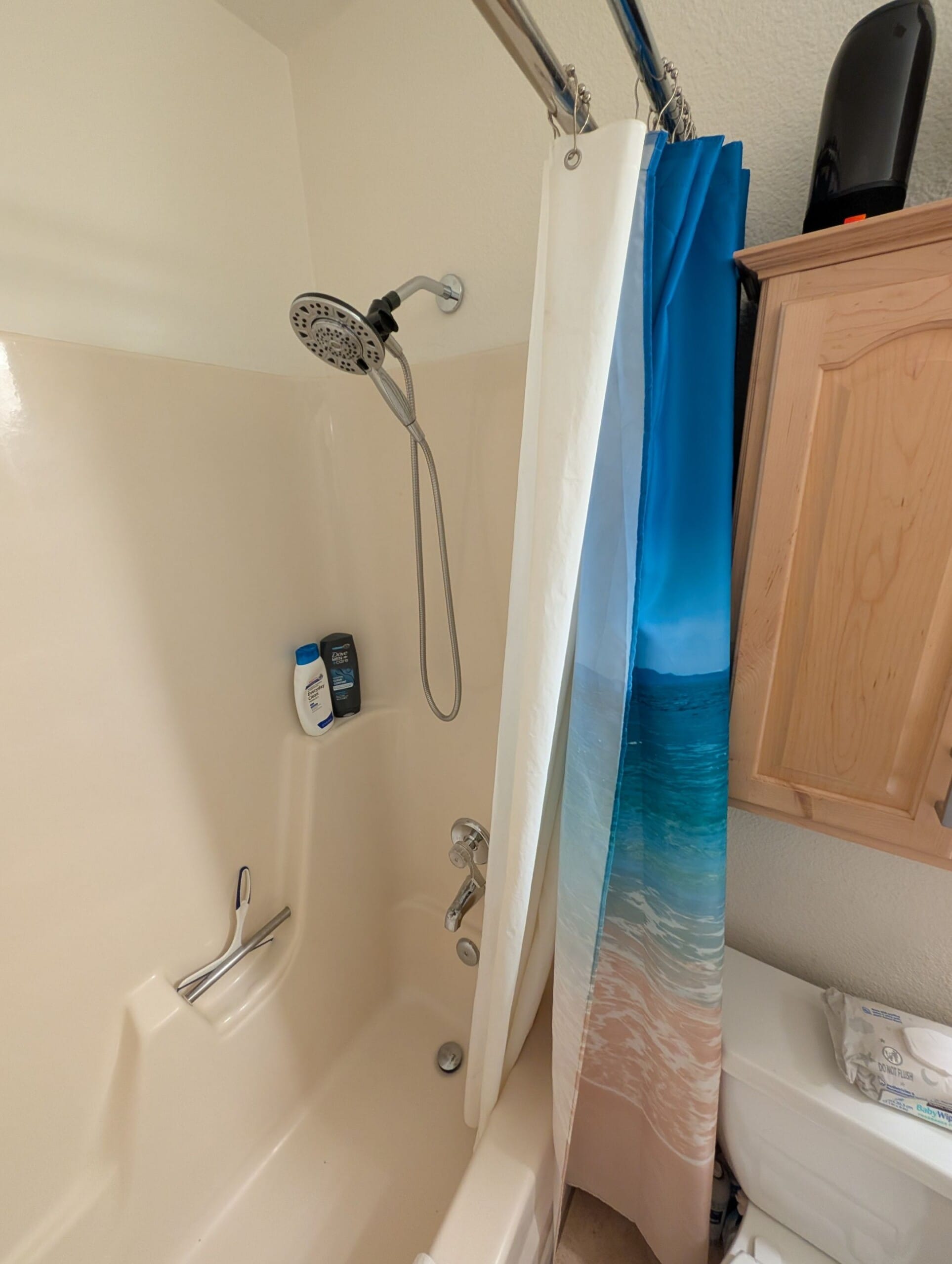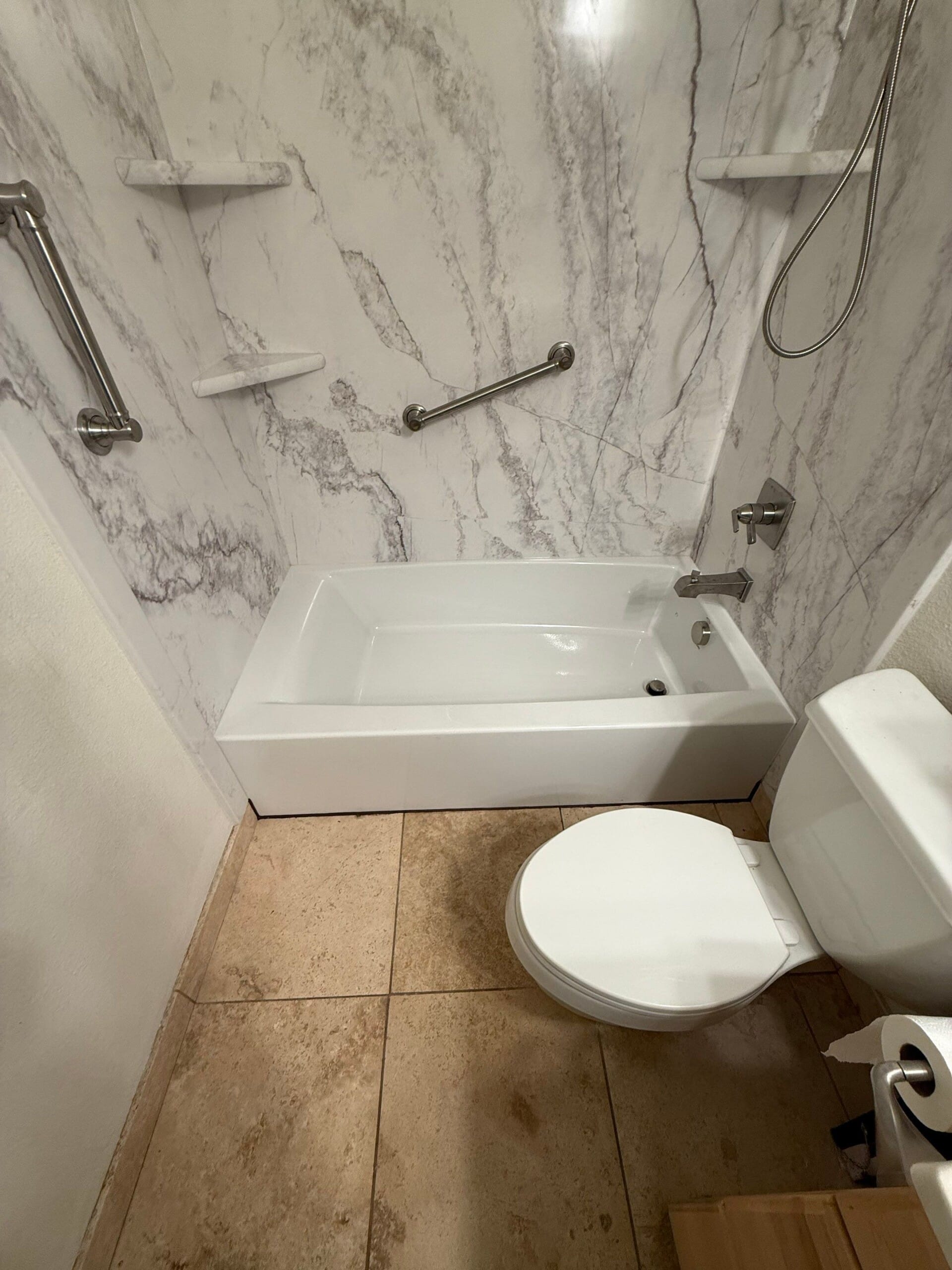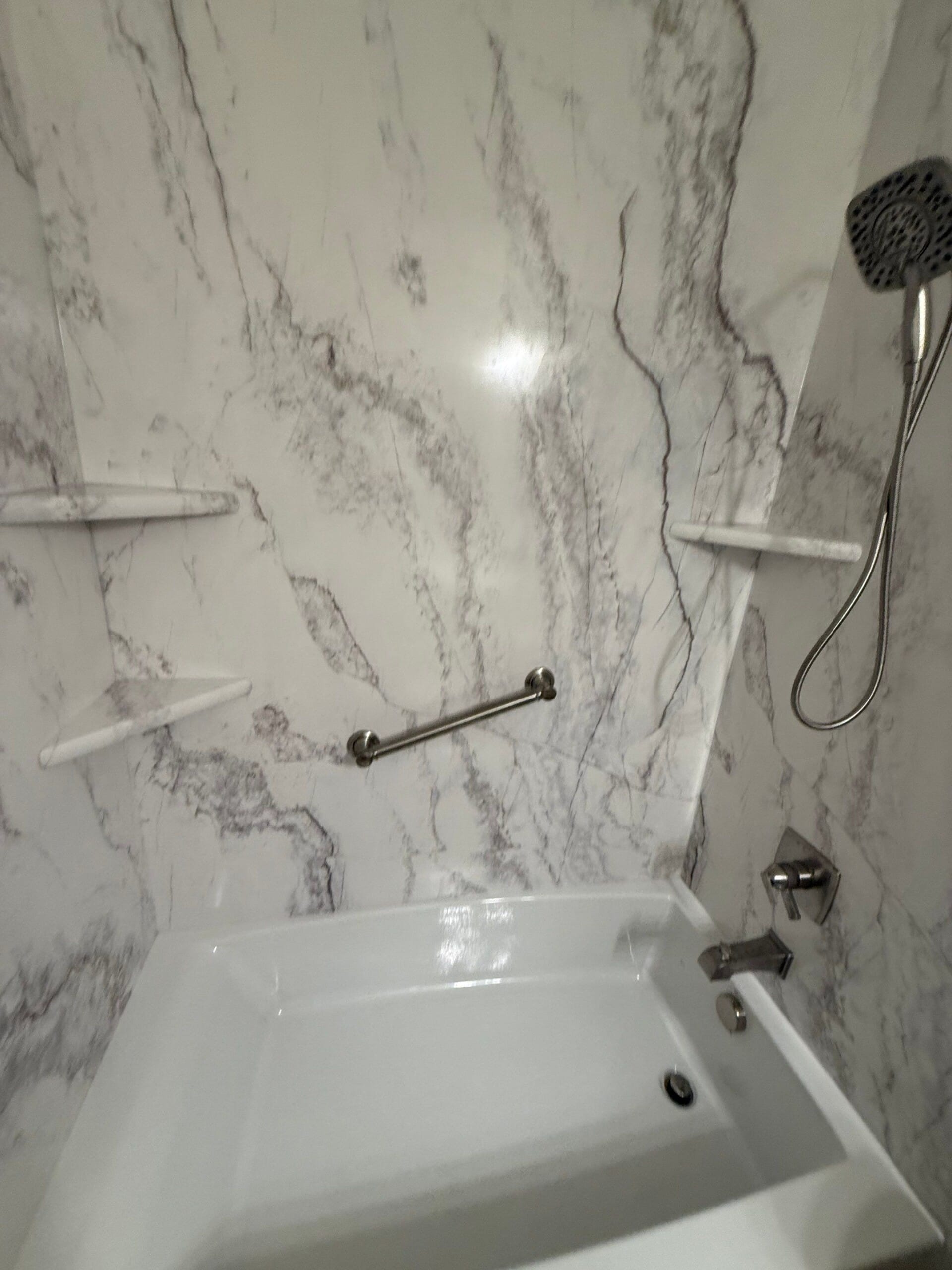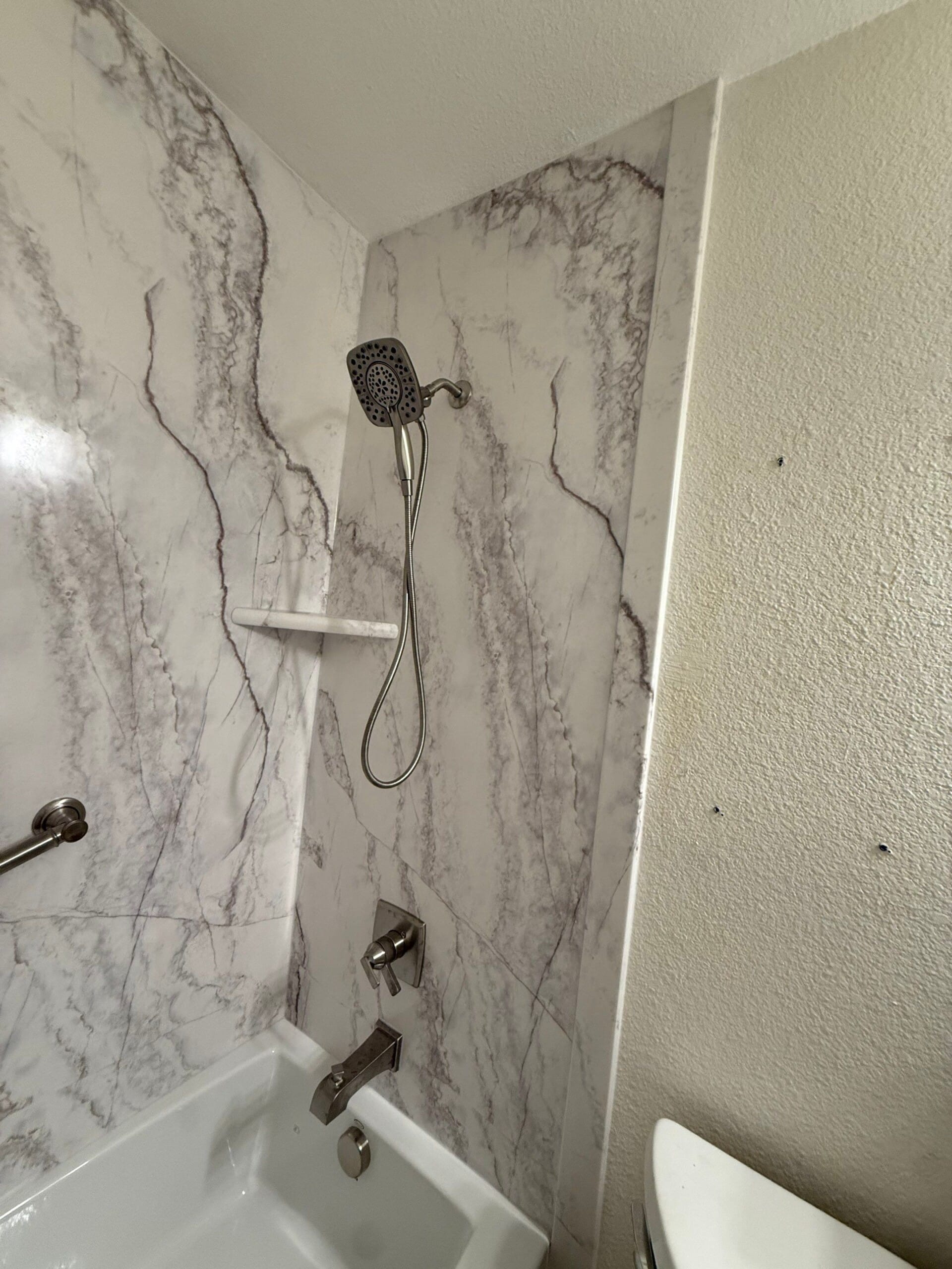 The installation included full tear-out of the previous surround and bathtub, with new plumbing and wall prep handled prior to fitting the upgraded composite panels and custom tub. Two grab bars were installed, one vertically and one horizontally positioned for safe transfers and in-tub balance. Four shelves were installed across both ends for convenient storage. A flexible handheld wand showerhead with multiple settings and a wide face completed the configuration. Although the review mentioned a possible glass door, the final install used a curtain rod instead, indicating the customer opted to delay or decline the optional door upgrade.