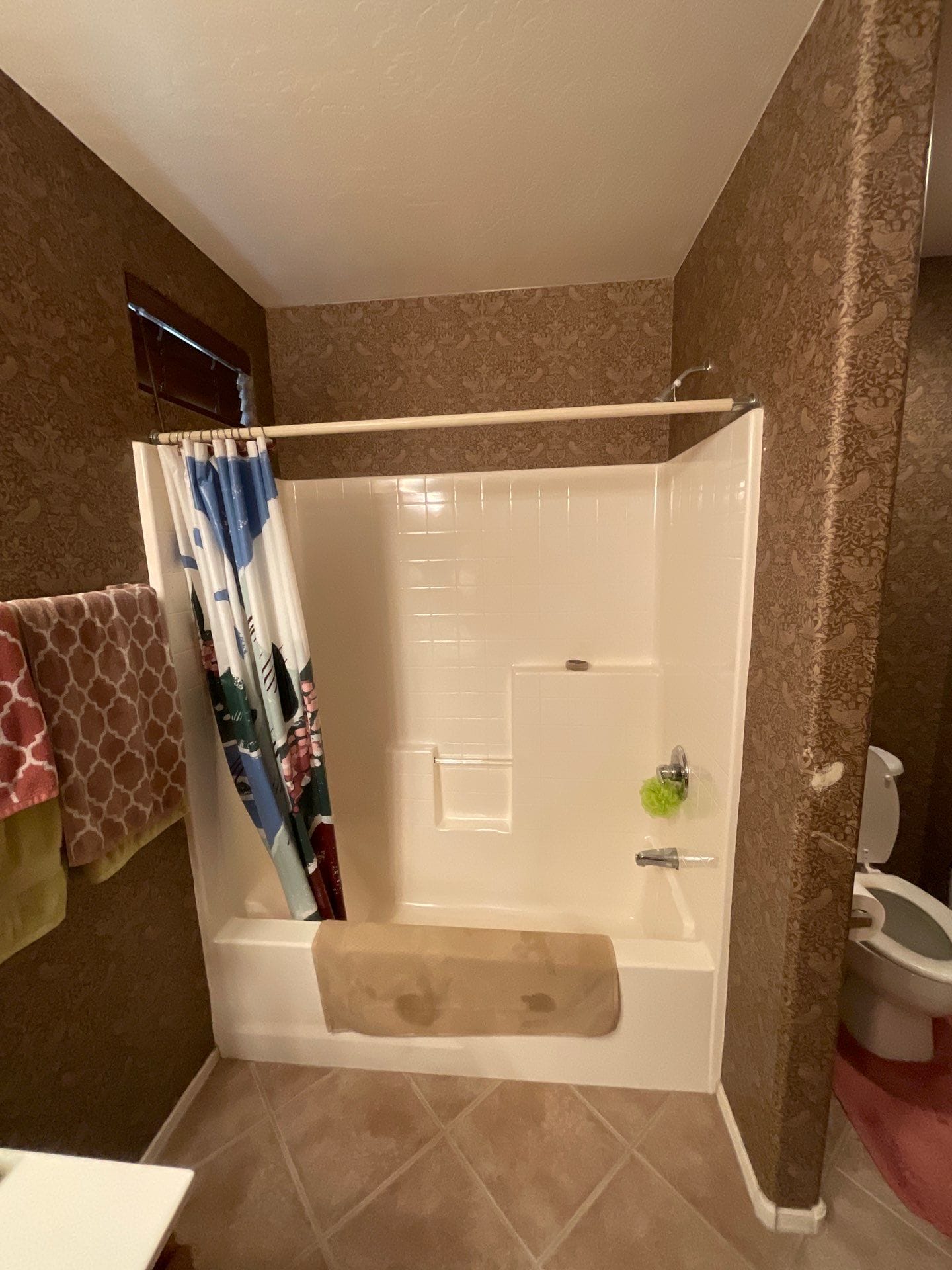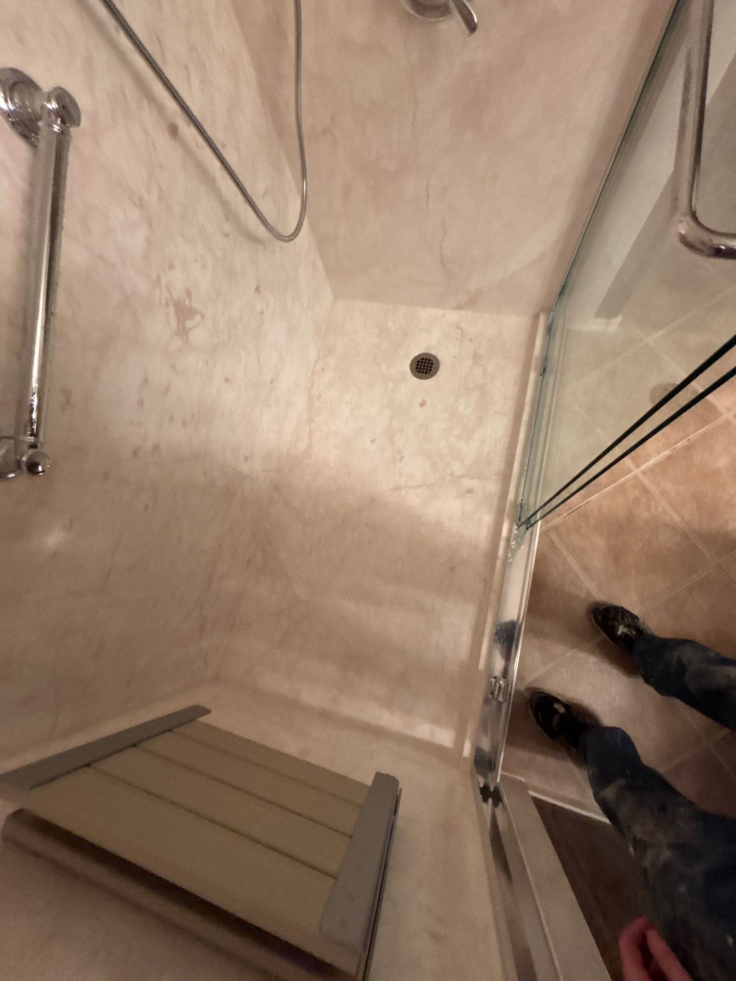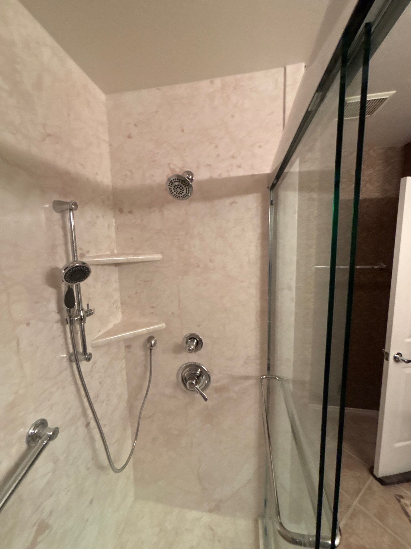 Installation involved a full tear-out down to the studs, followed by structural inspection and reinforcement behind all grab bars. The crew protected surrounding surfaces, removed plumbing and subflooring as needed, then installed a waterproof backer board system prior to placing the pan and full wall panels. Final installation included a chrome sliding door system, integrated grab bars on both key walls, and a flexible handheld wand. The project was completed within the stated 3–4 day window, following an exact measurement return visit for accuracy.