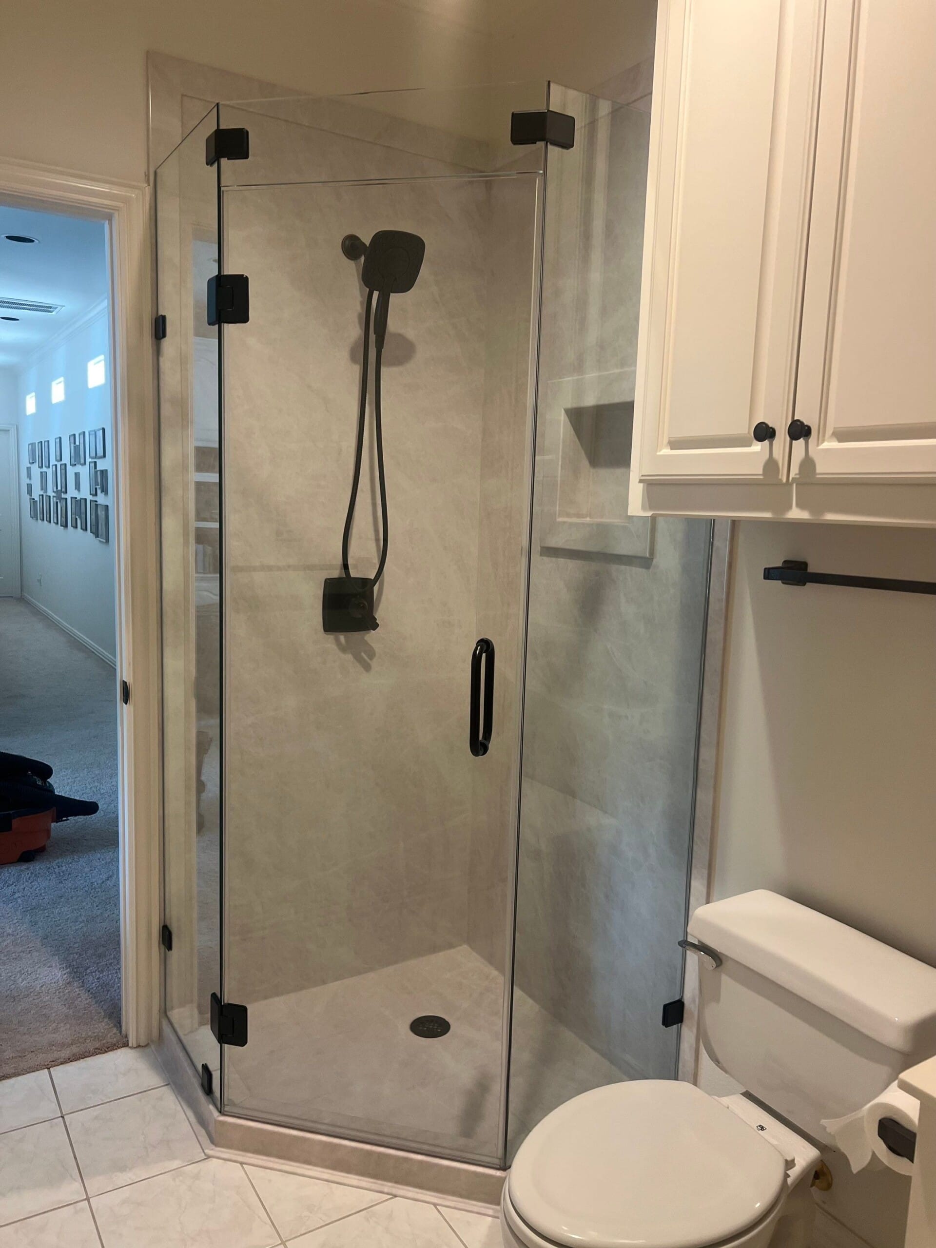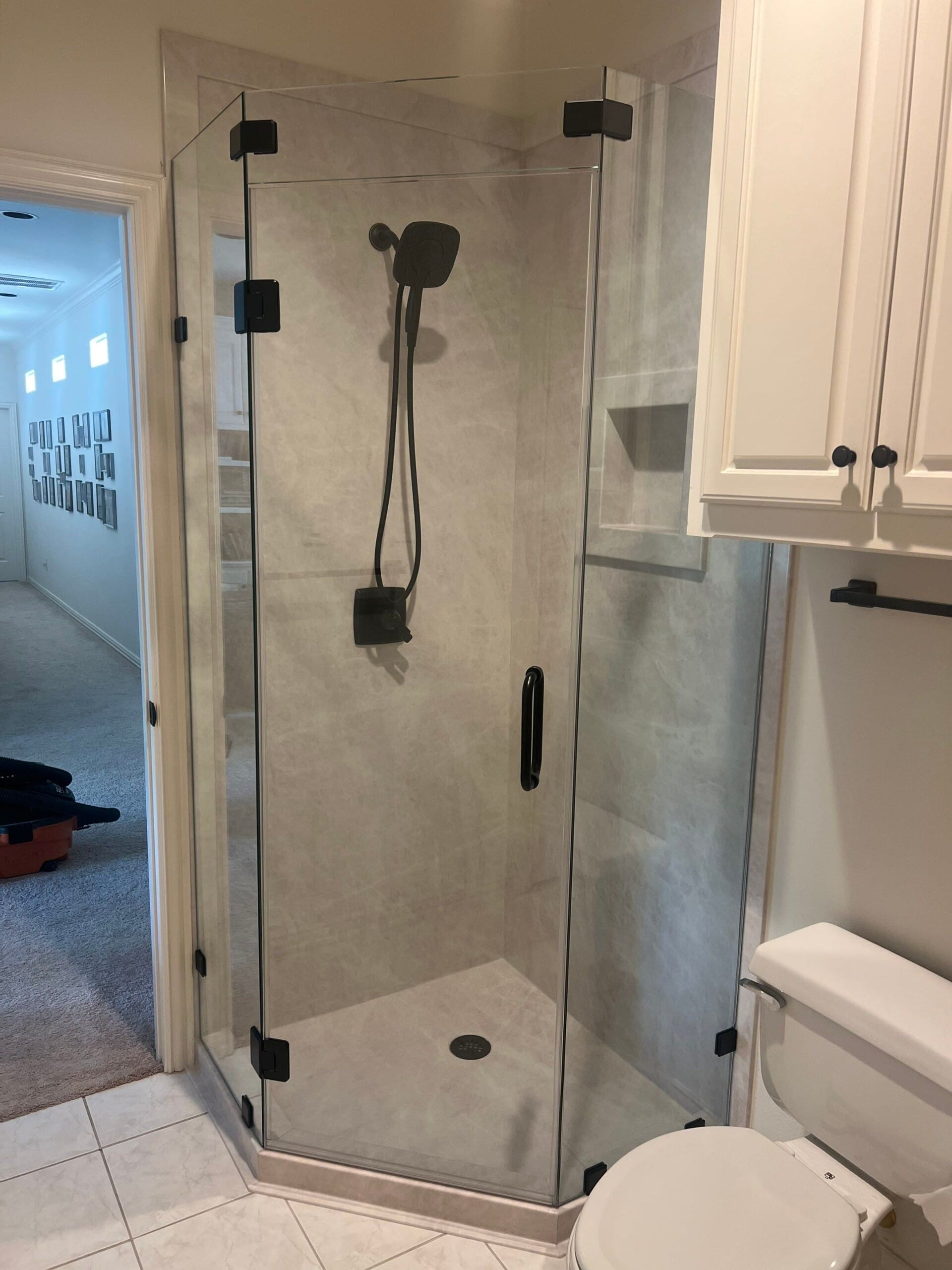 The remodel kept the existing footprint but replaced all visual and functional components. Composite panels in a soft pearl stone pattern were installed along all shower walls, offering a light-reflective and neutral appearance. The previous framed glass was replaced with a frameless neo-angle enclosure using thick, clear panels with matte black hardware. The fixture system was also upgraded to a matching black Delta handheld showerhead with a square rain-style mount and modern controls. A recessed square niche was built into the wall opposite the door for hidden storage. The angled curb and existing floor tile were preserved but re-sealed for continuity.