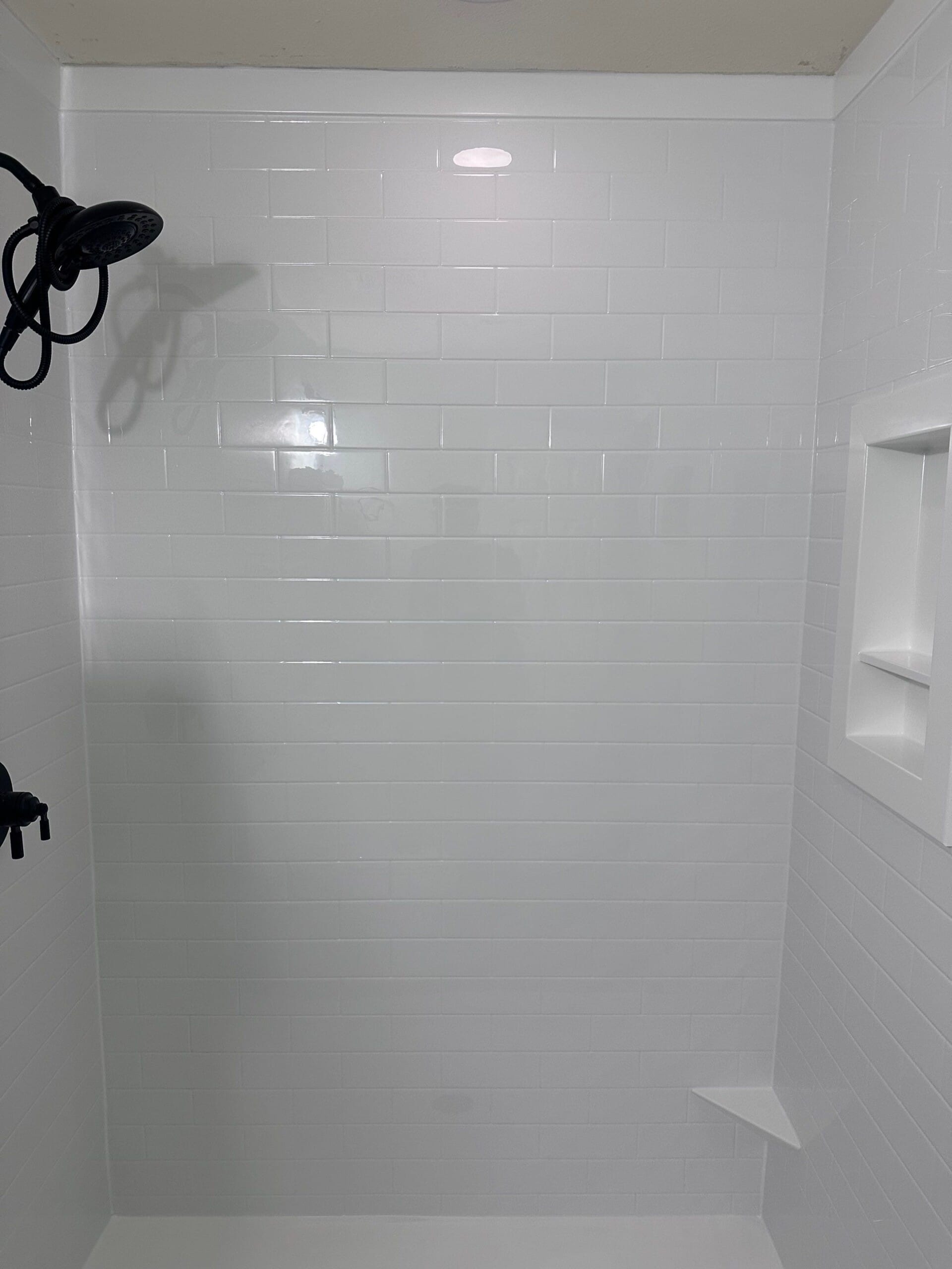* Smooth white wall panel finish with modern subway tile pattern