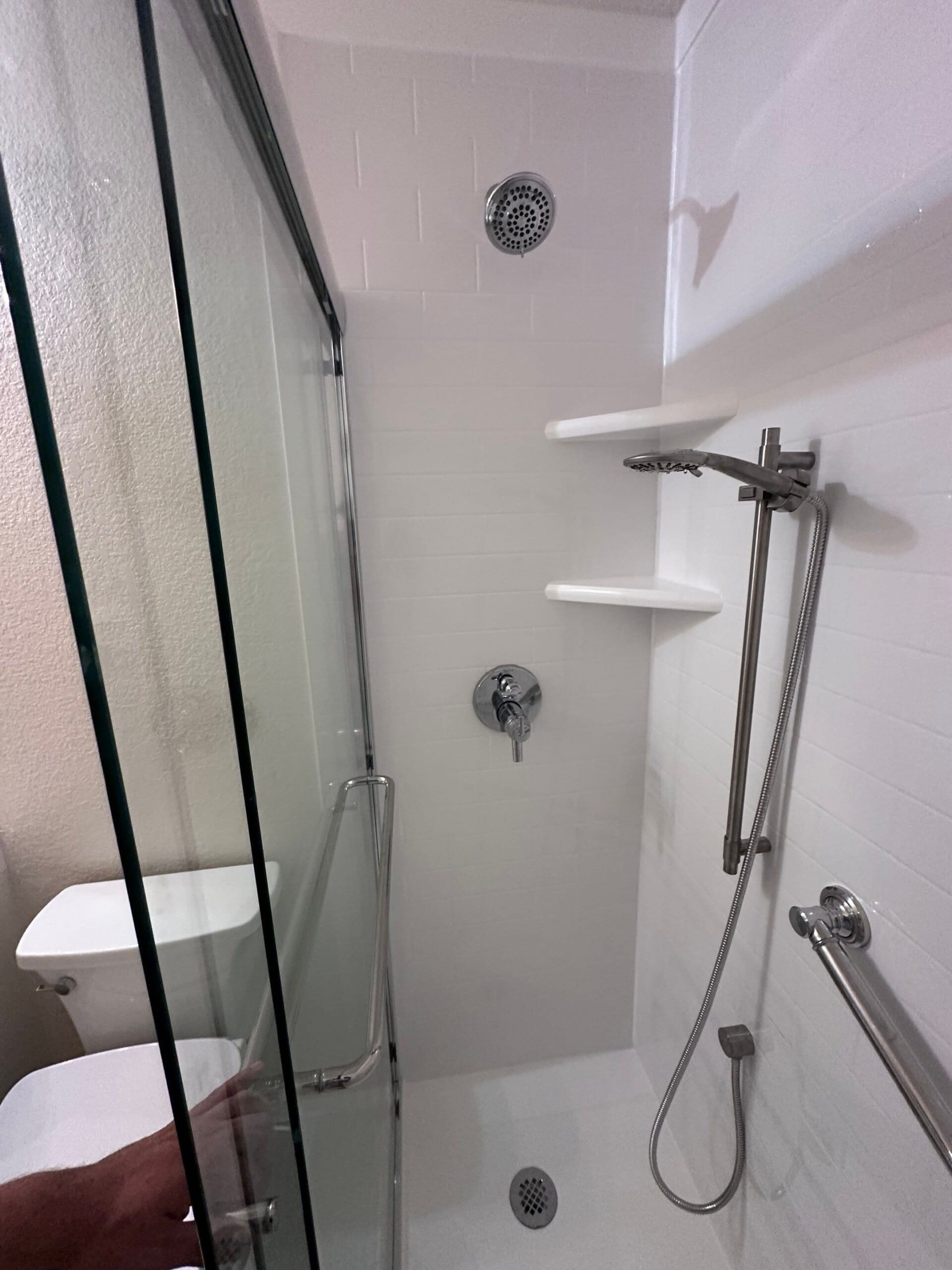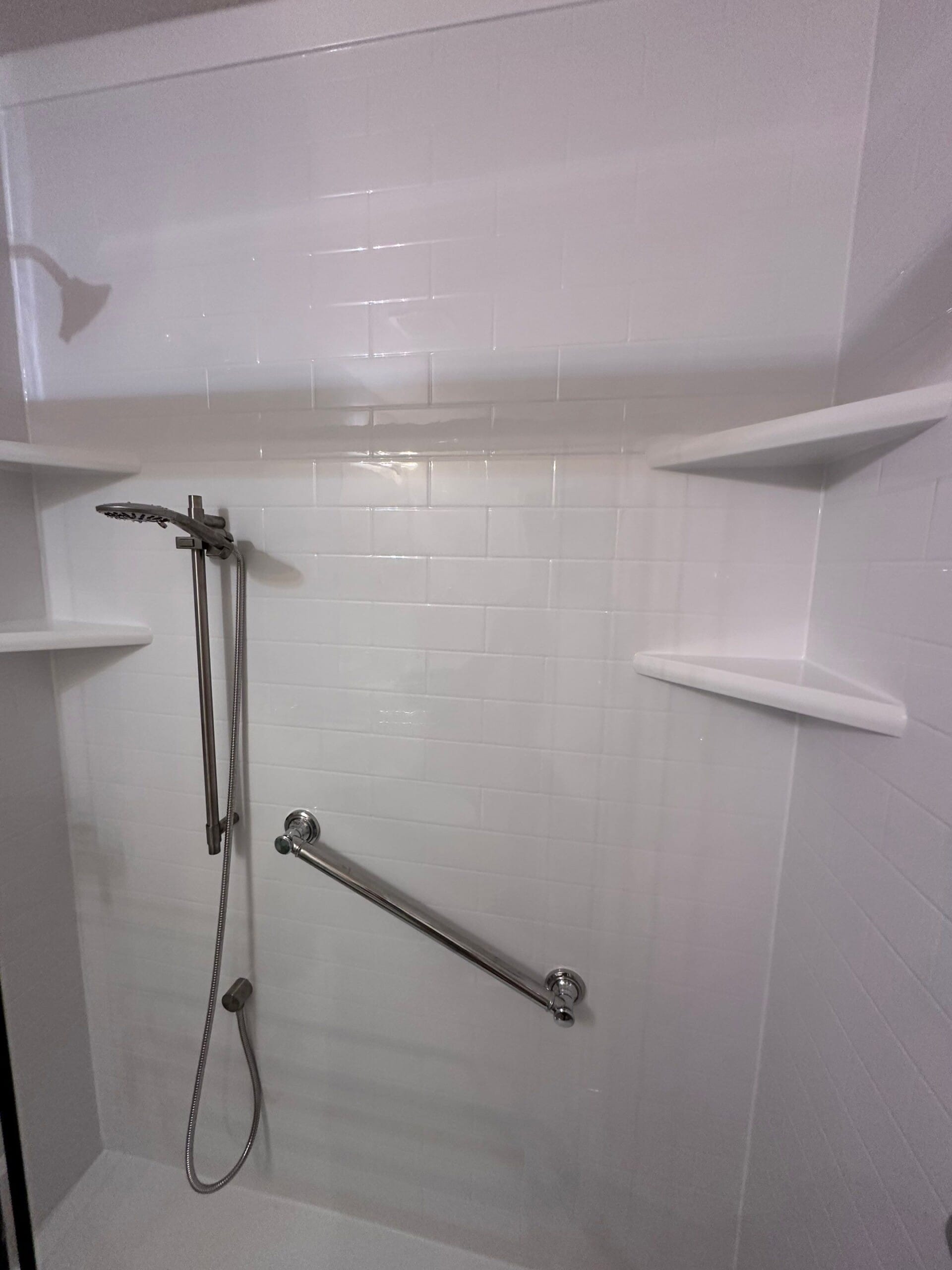 The Five Star Bath Solutions representative presented a grout-free wall system composed of antimicrobial, non-porous materials designed to resist mold and mildew while maintaining a clean finish over time. The system is fully waterproof and engineered specifically for bathroom environments, supporting long-term durability and low maintenance. Chrome-finish fixtures were selected to complement the clean white surround, including a handheld shower system and matching hardware. The company’s exclusive focus on bathroom remodeling, combined with a strong track record and long-standing presence in the local market, reinforced confidence in both product quality and installation expertise.