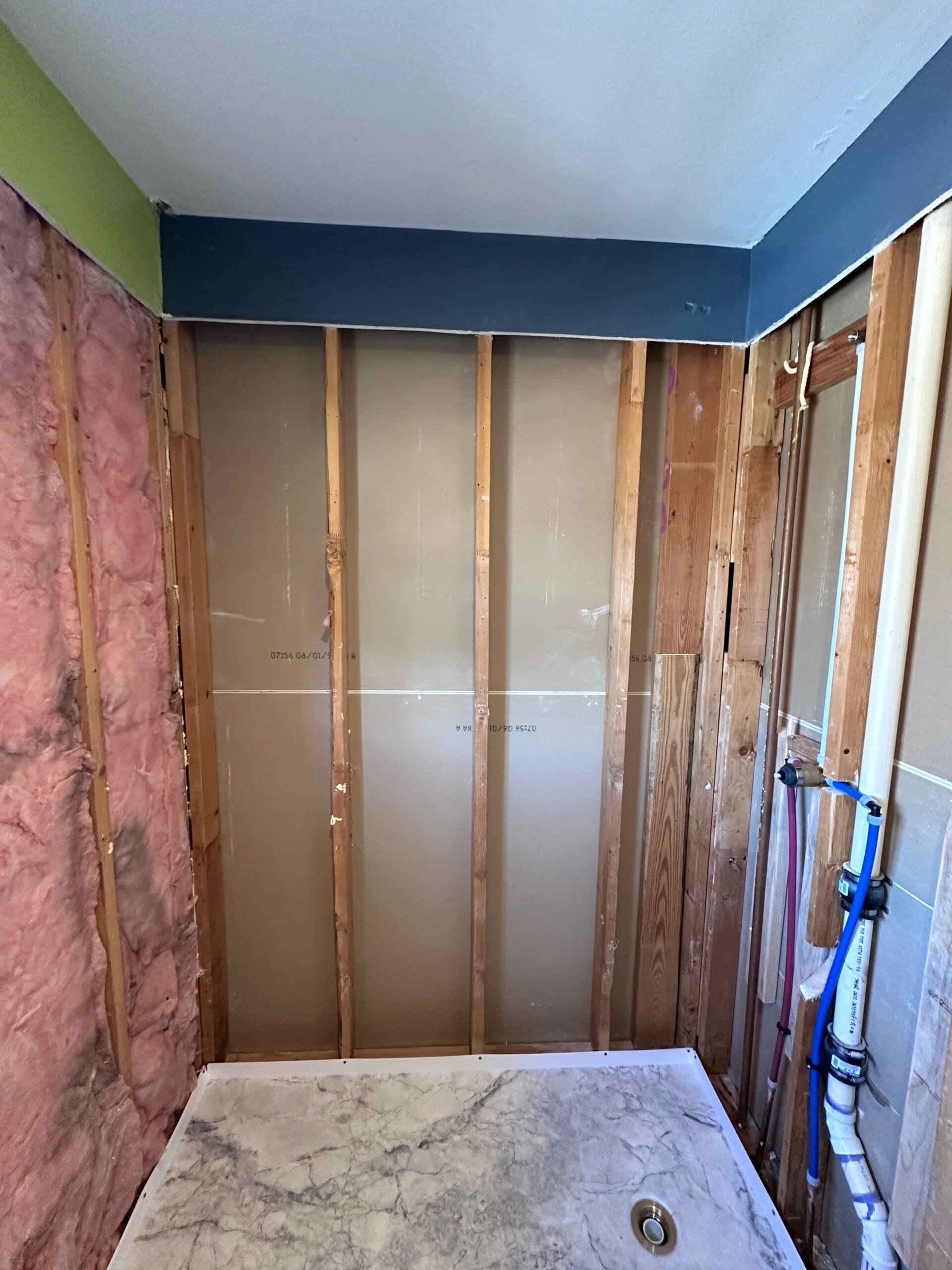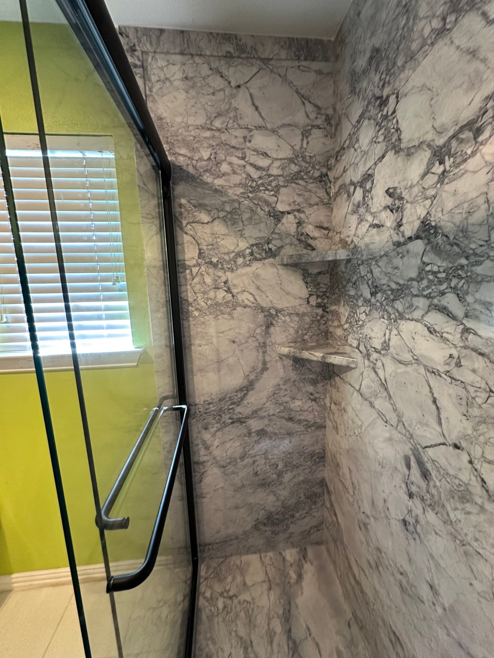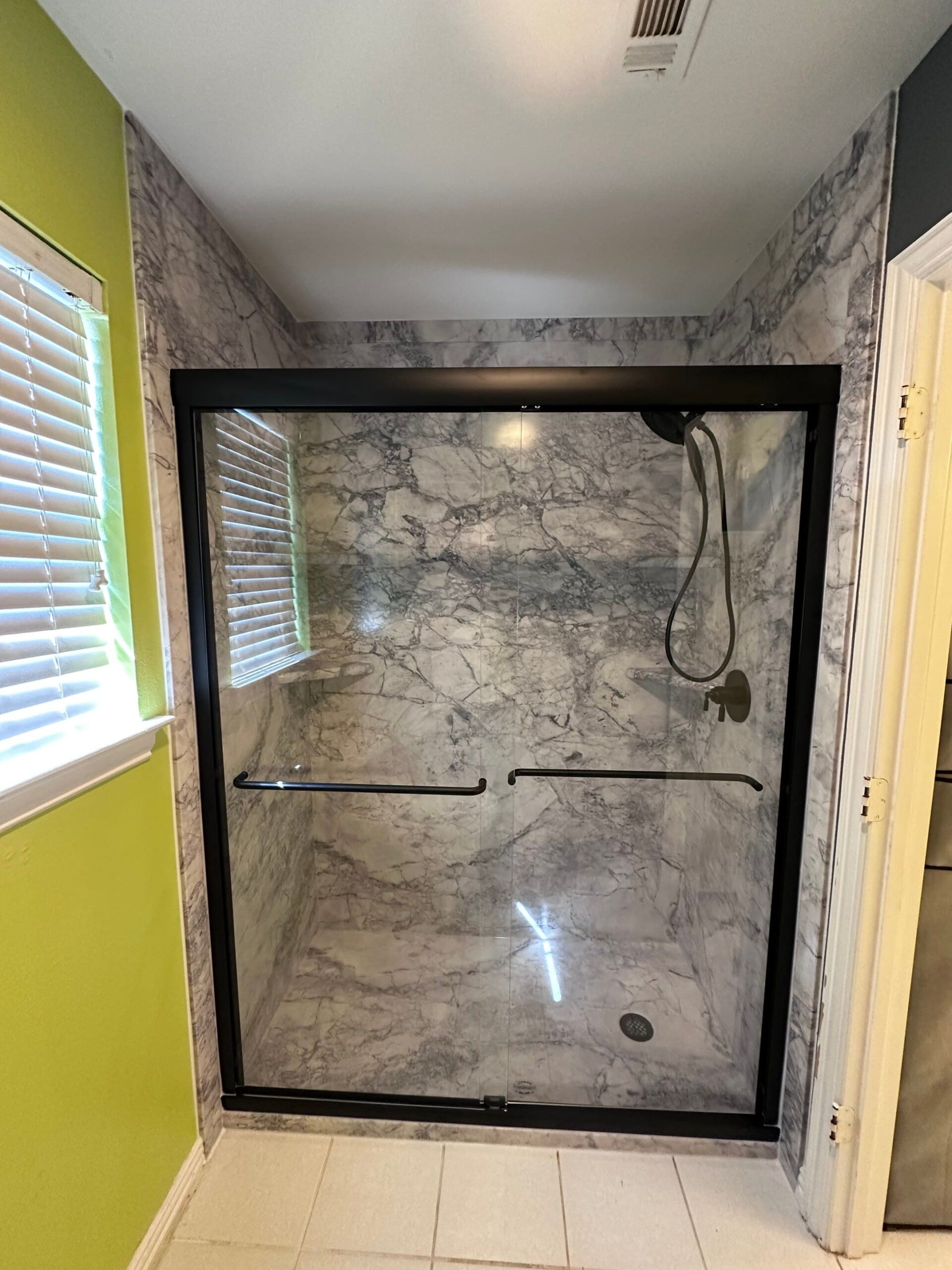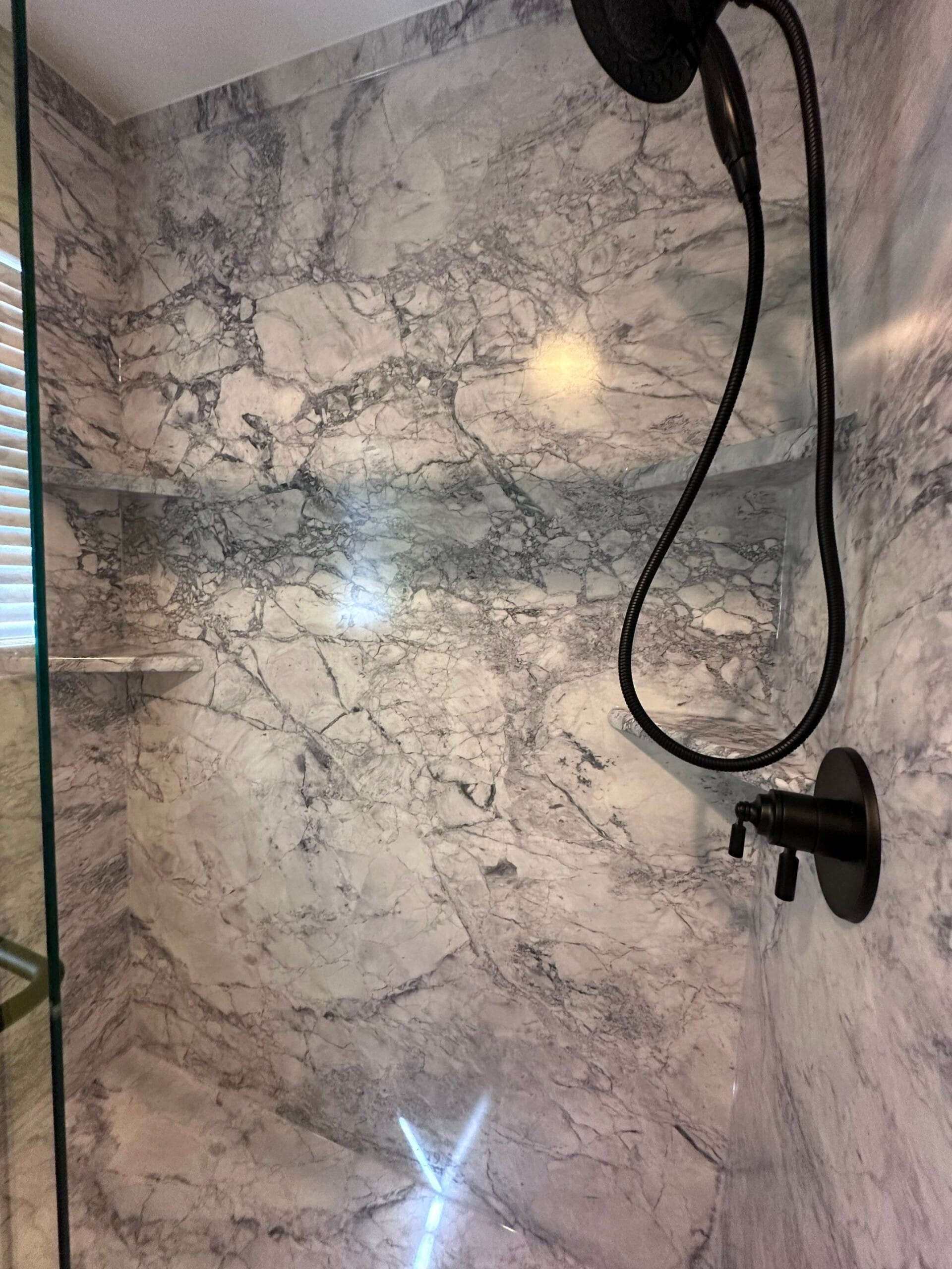The installation process includes a full demolition of the existing wet area down to the studs, moisture inspection, mold remediation if needed, and a custom-engineered shower pan designed to accommodate the existing drain. New plumbing valves and PEX lines are installed, and waterproof foam backer board is used in place of traditional plywood or green board. The new shower features full-height Calacatta-style composite wall panels with two matching corner shelves and a dark matte black fixture set. A sliding frameless glass enclosure with bold black framing was installed for clean function and visual contrast. Installation was completed in a multi-day process with detailed planning and full protection of surrounding areas.