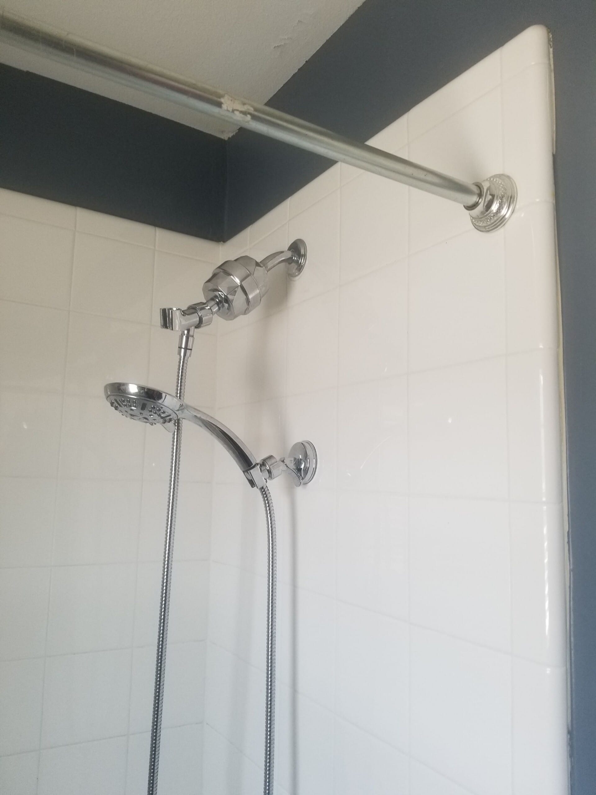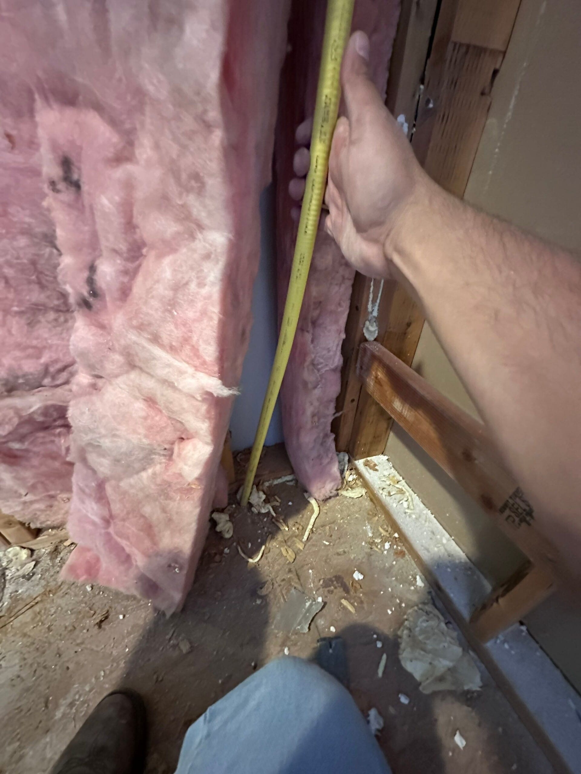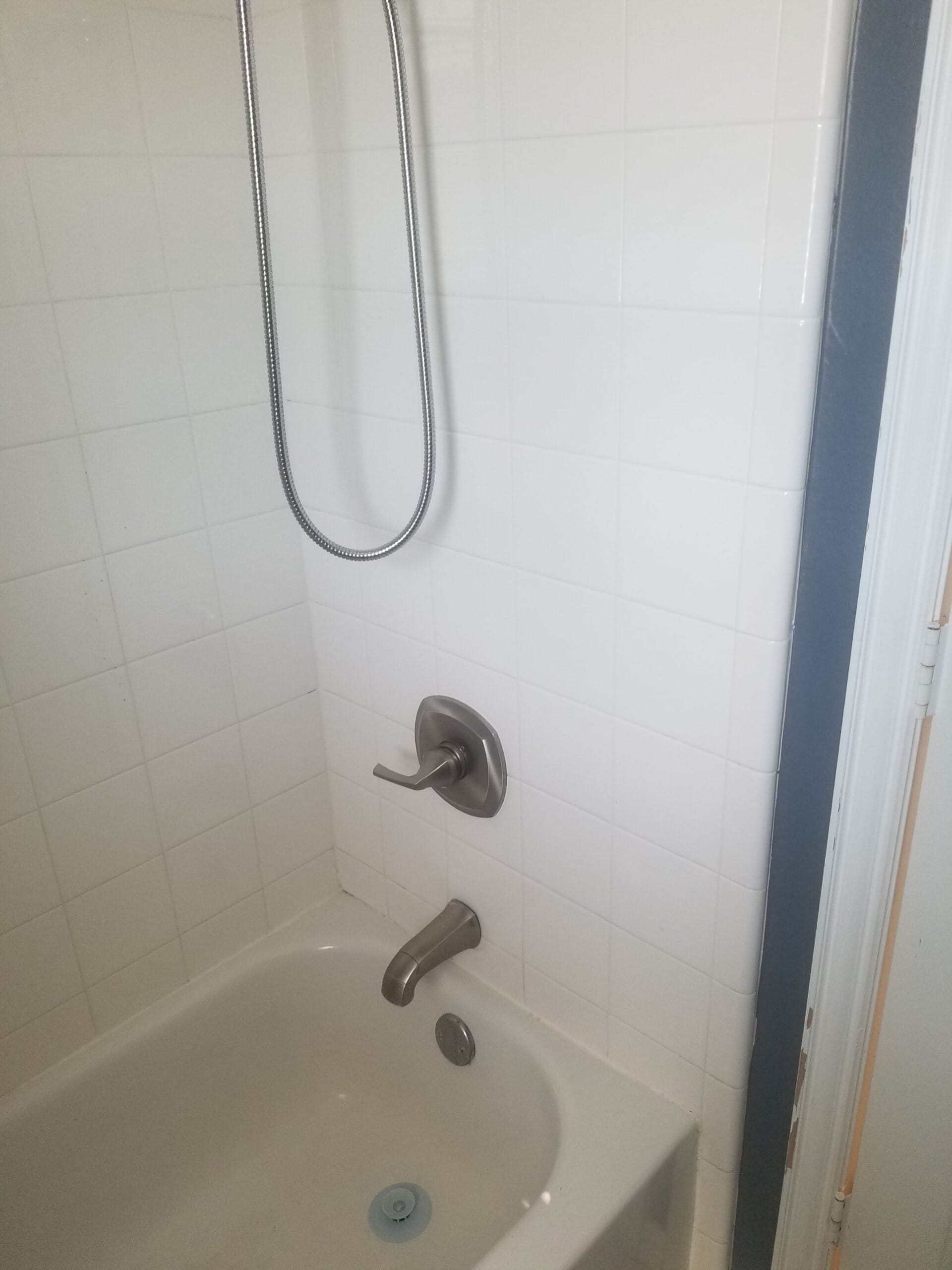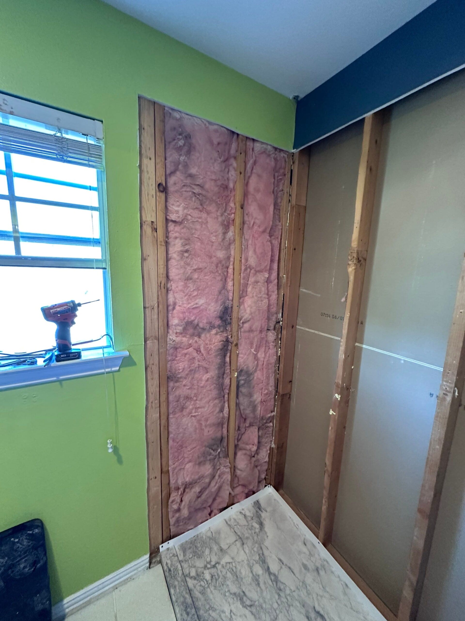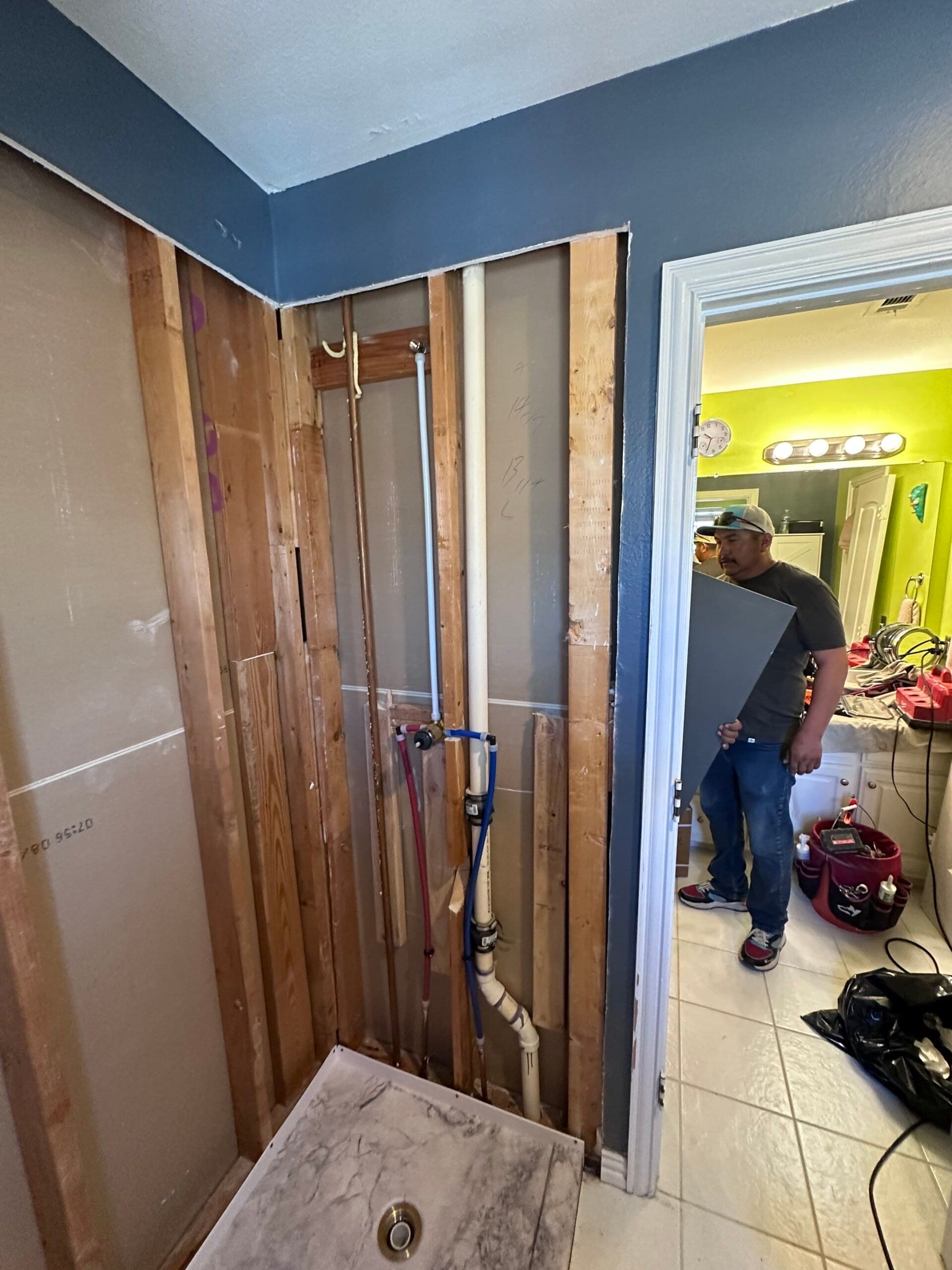 The installation process includes a full demolition of the existing wet area down to the studs, moisture inspection, mold remediation if needed, and a custom-engineered shower pan designed to accommodate the existing drain. New plumbing valves and PEX lines are installed, and waterproof foam backer board is used in place of traditional plywood or green board. The new shower features full-height Calacatta-style composite wall panels with two matching corner shelves and a dark matte black fixture set. A sliding frameless glass enclosure with bold black framing was installed for clean function and visual contrast. Installation was completed in a multi-day process with detailed planning and full protection of surrounding areas.