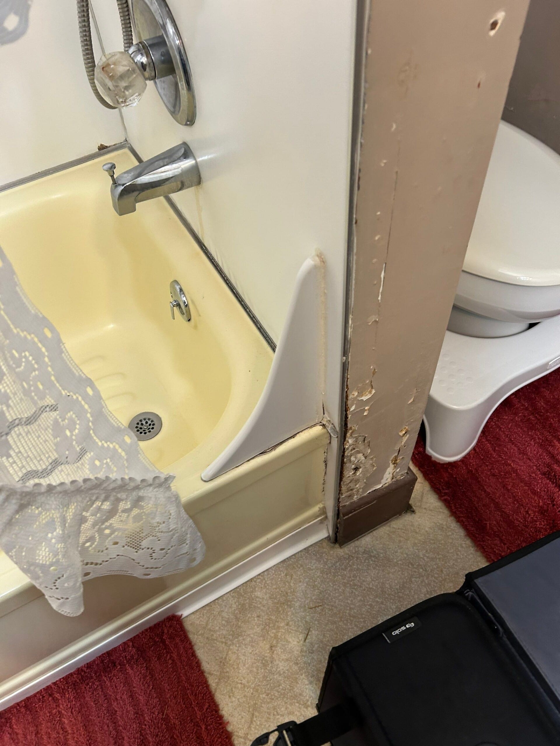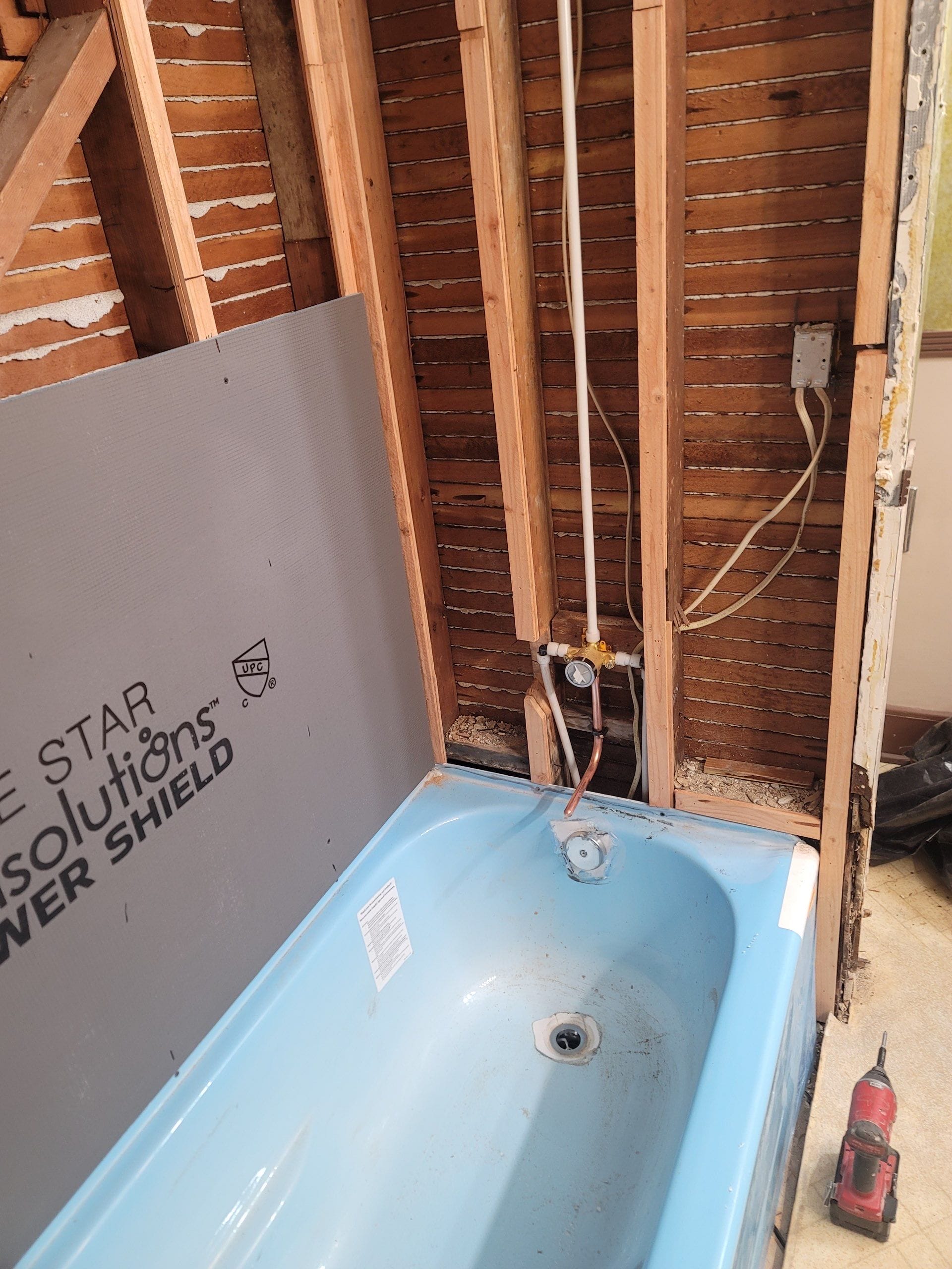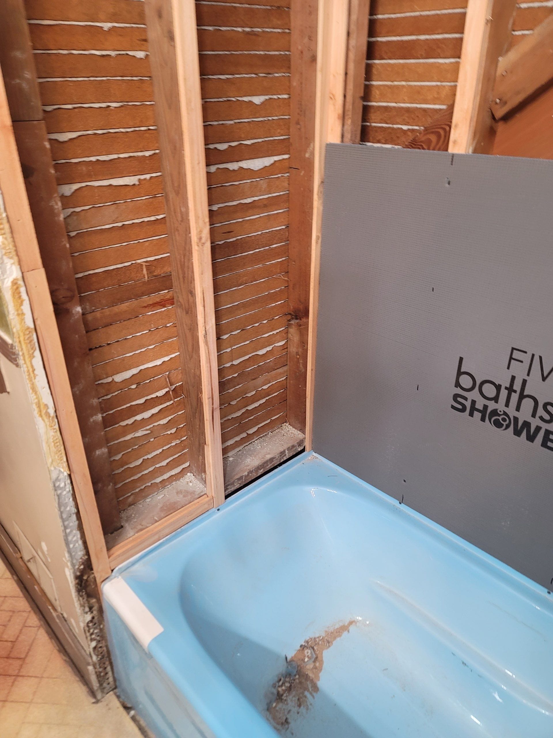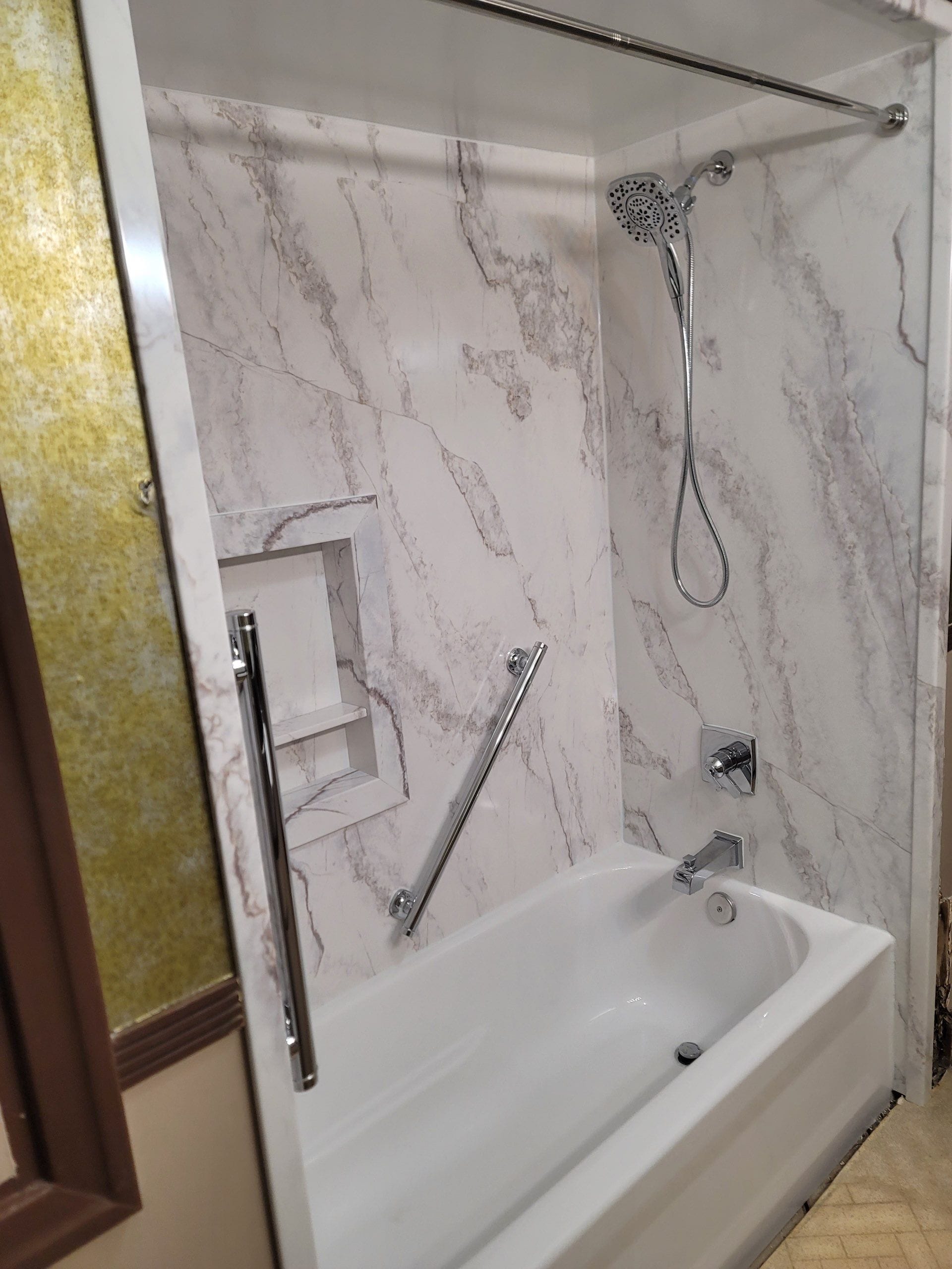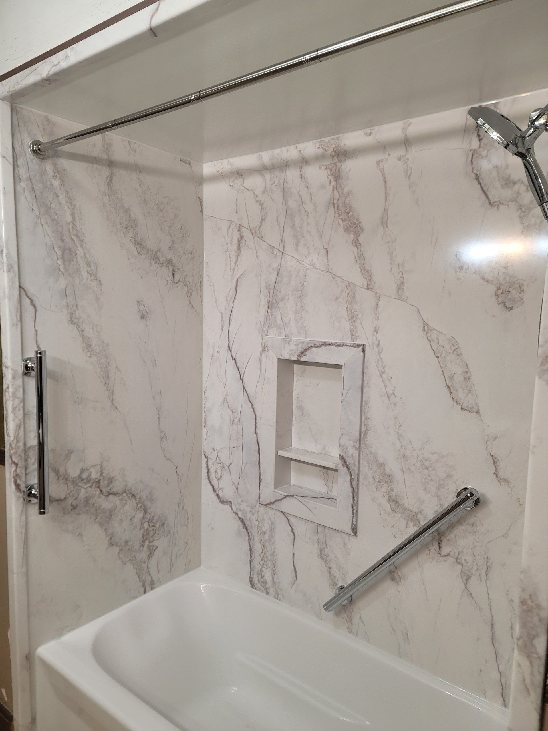 The remodel began with full removal of the previous tub walls, followed by an inspection of structural supports to ensure a clean foundation for the new system. New waterproof backer boards were installed behind the wall panels to provide a sealed base layer. A modern white tub replaced the older unit, paired with a chrome tub filler and handheld shower fixture for added utility. A recessed niche was installed for storing bathing products, and a diagonal grab bar was added to support safe movement within the tub space. The upgrade was completed in a short timeline, with design details finalized during a secondary consultation before ordering materials.