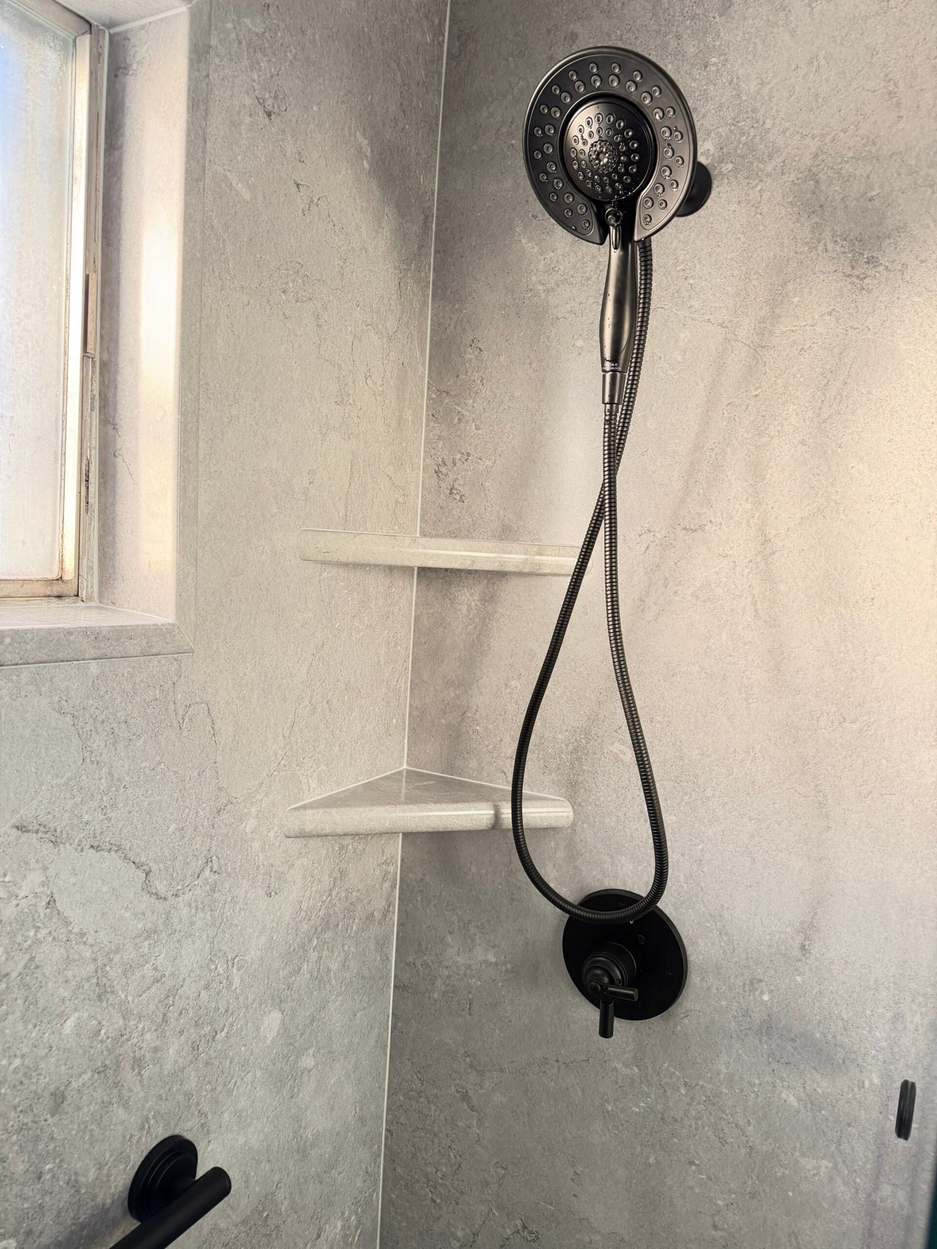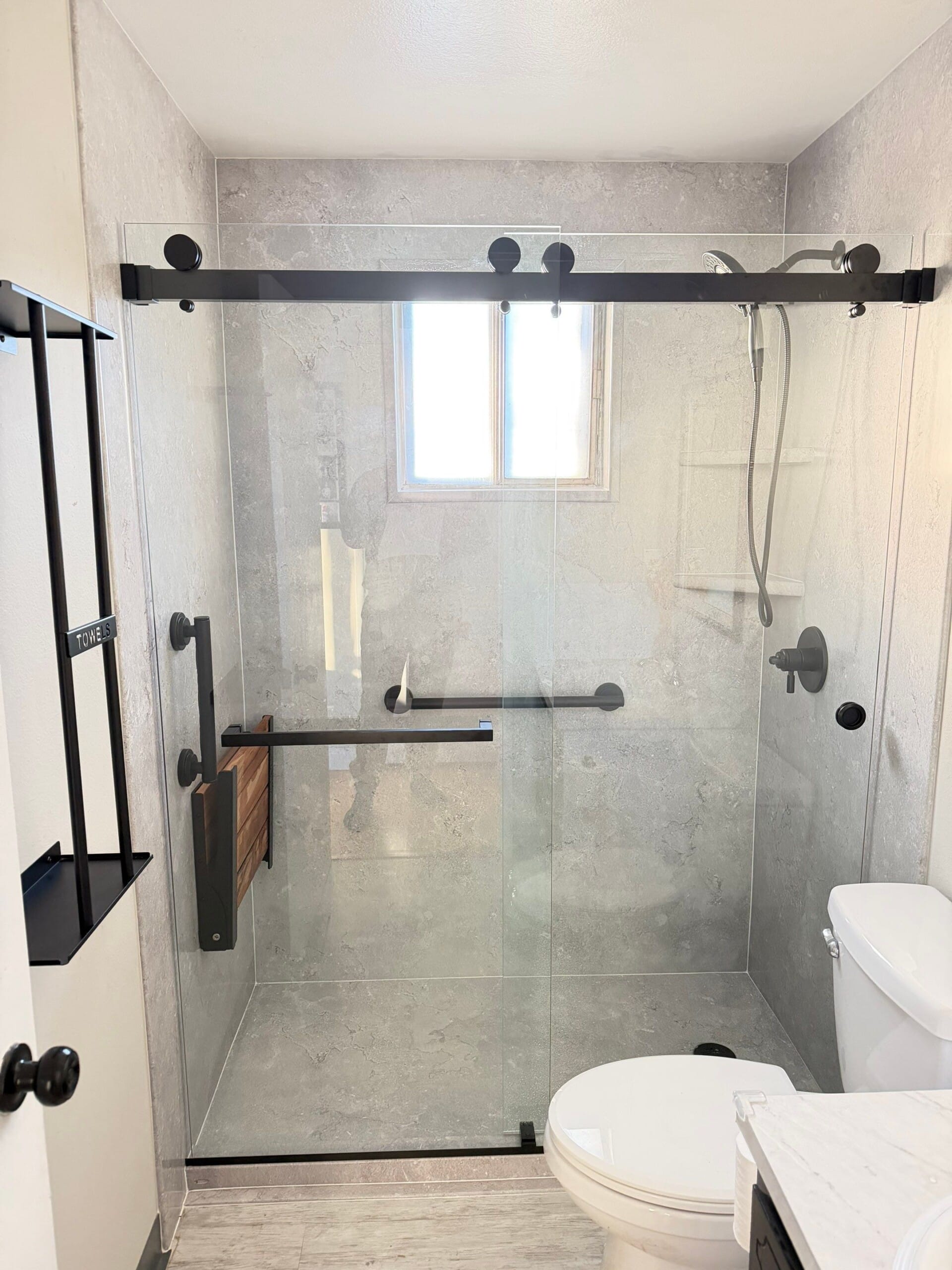 Installation included complete removal of original materials, inspection and reinforcement of wall structures, and the integration of high and low control fixtures for ease of access. The updated space featured realistic gray wall panels, waterproofed backing, and a sliding glass bypass door in matte black finish to enhance water containment and simplify use. Work was completed with full site protection and cleanup to minimize disruption.