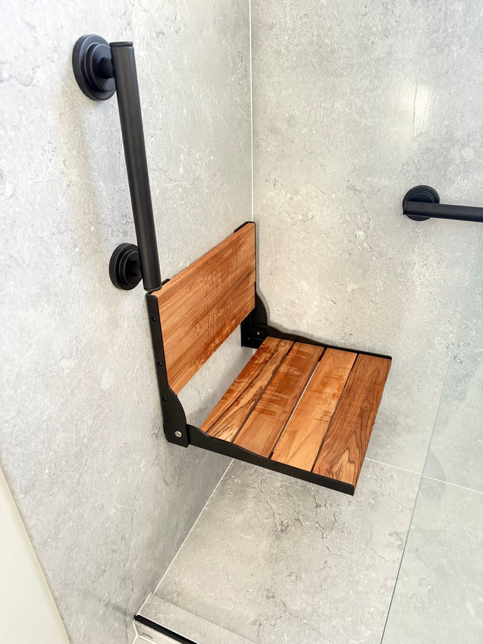 * Matte black grab bars positioned for balance and seated use