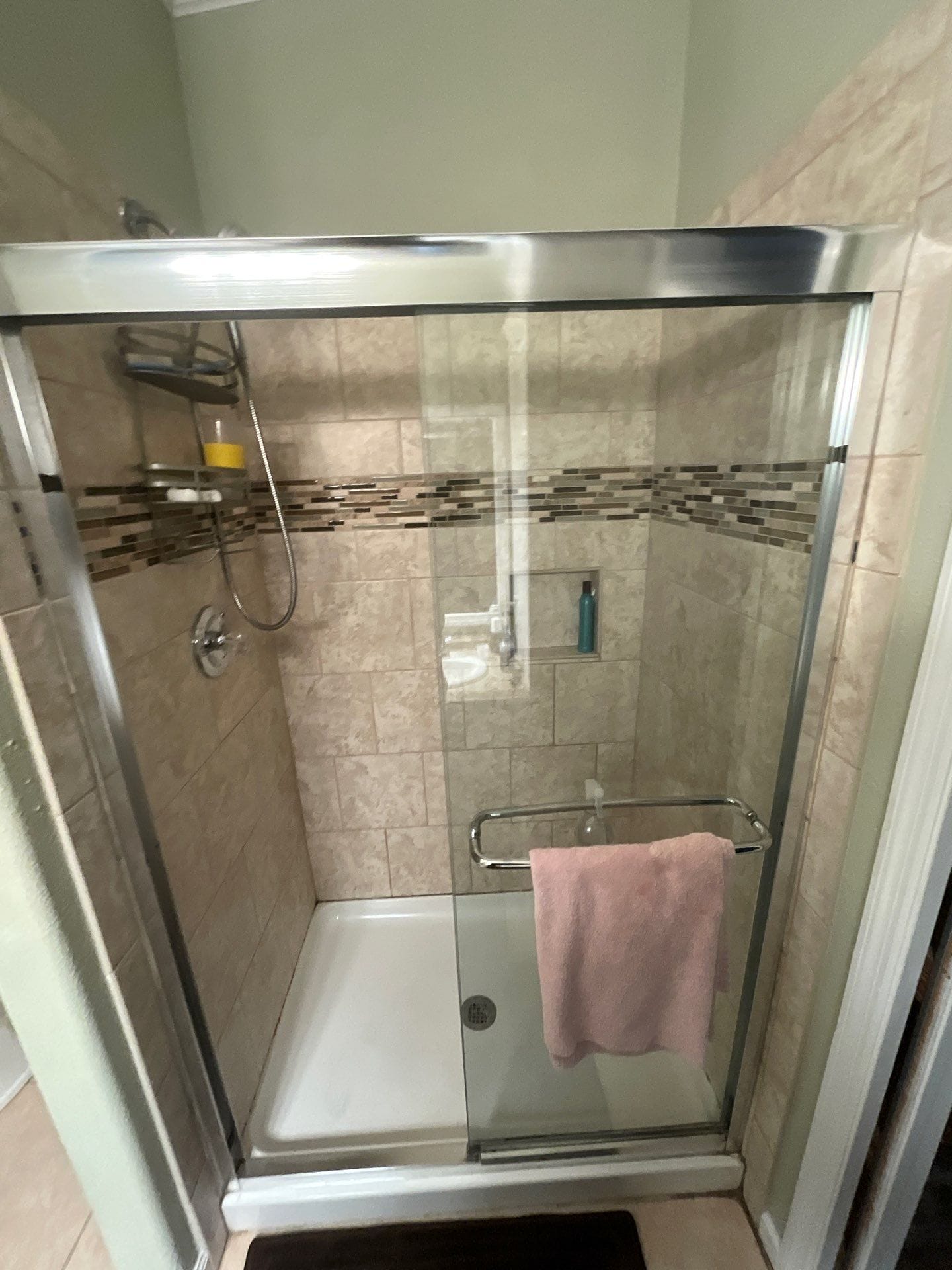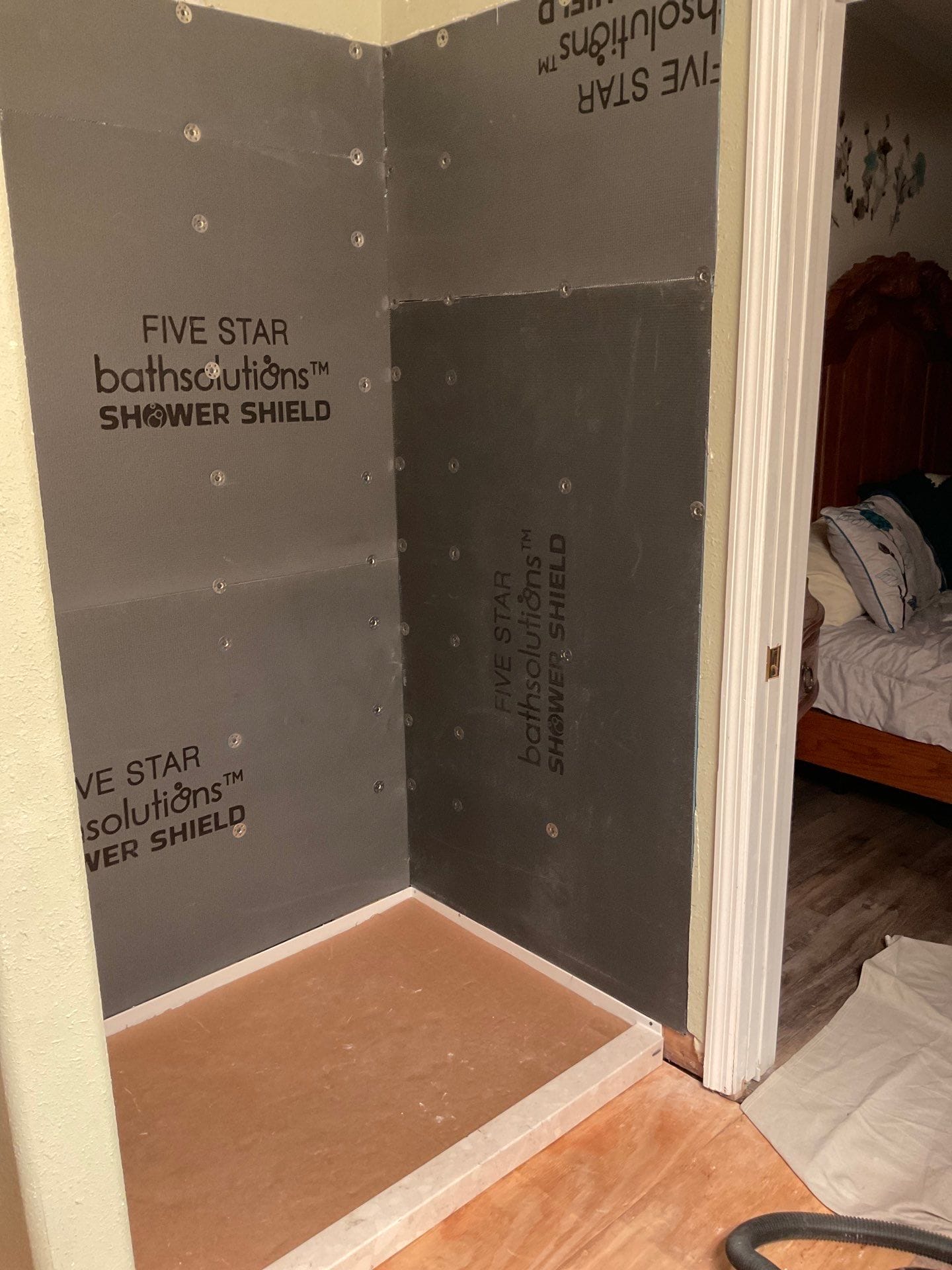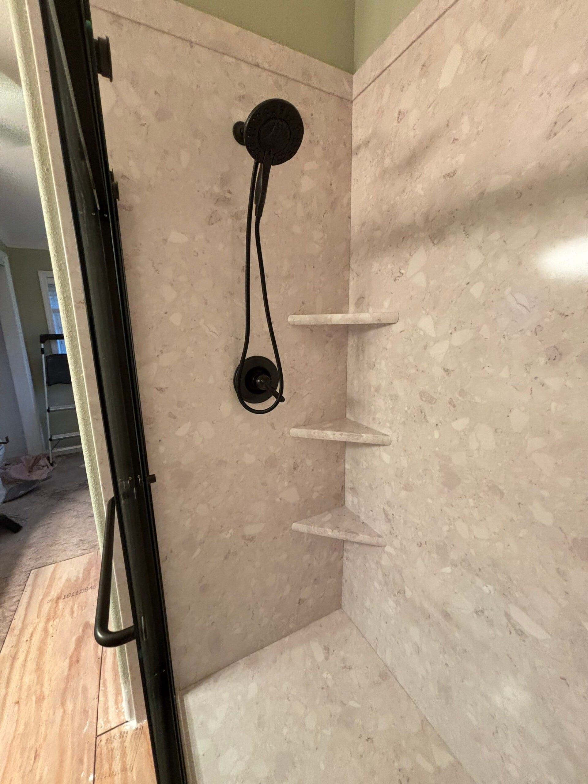 A six-layer Everest composite wall system was selected for its antimicrobial properties, low maintenance surface, and seamless visual appeal. The walls were installed over a waterproof foam-core backer board, forming a moisture-sealed foundation for durability. Two triangular corner shelves were integrated directly into the panels, while a horizontal grab bar provided secure support. The updated frameless bypass shower doors featured oil-rubbed bronze hardware and a low-profile threshold to maintain accessibility while enhancing aesthetics.