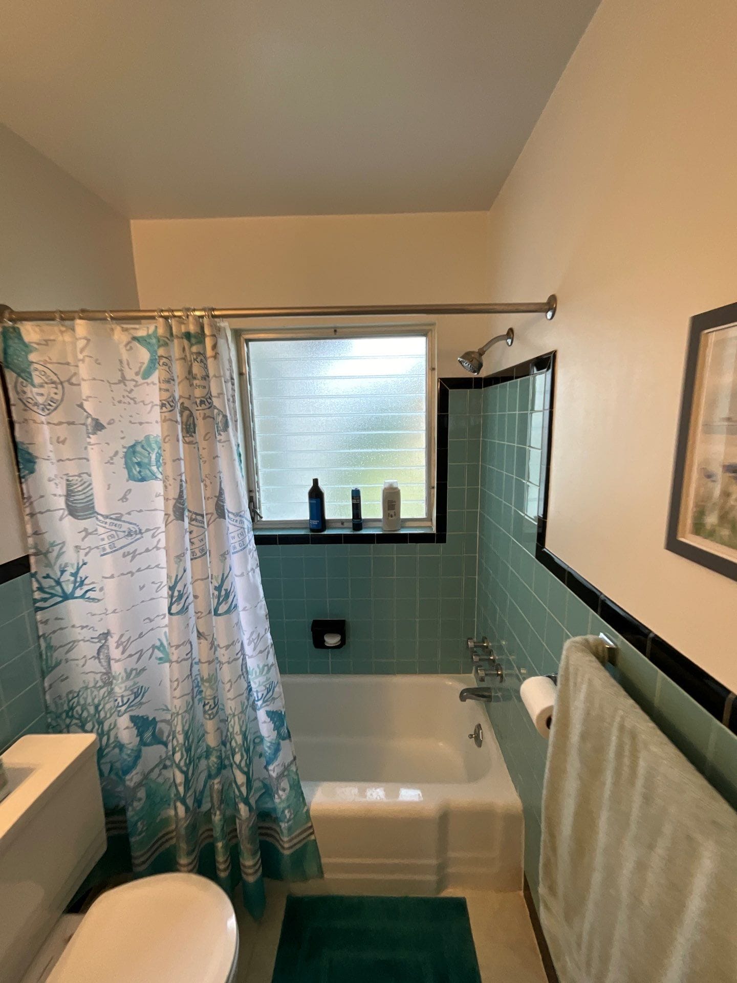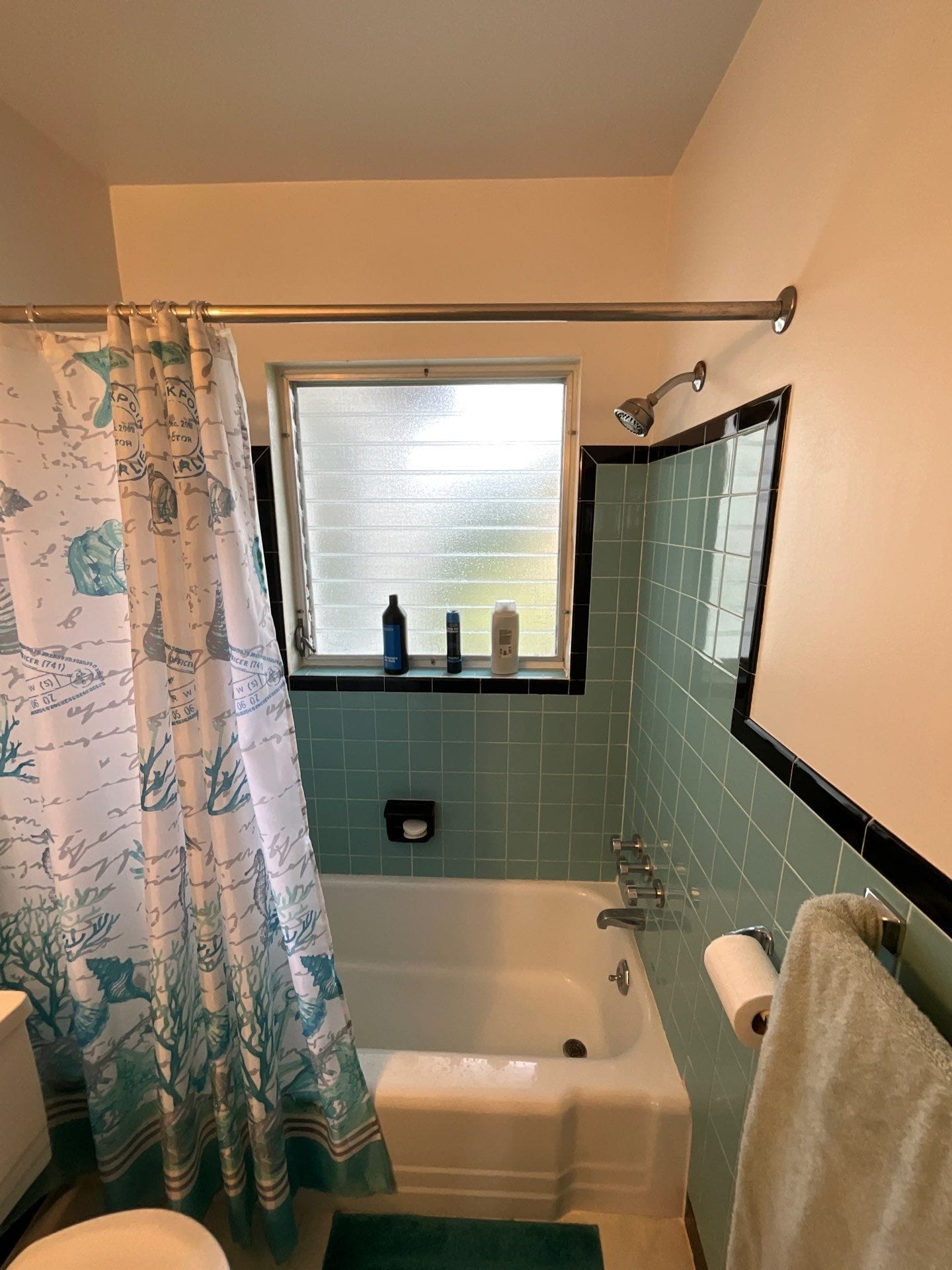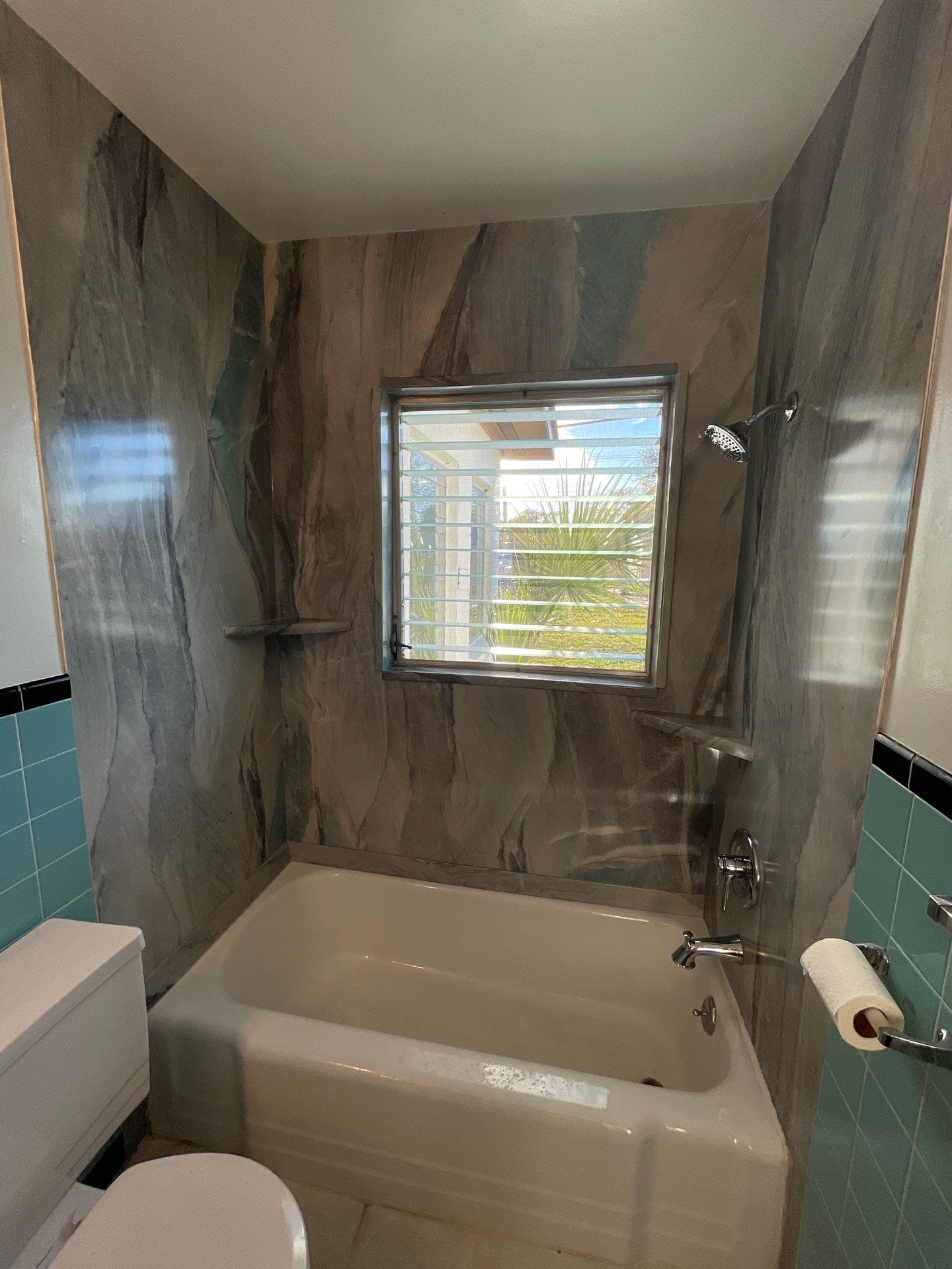 The installation involved removal of the original blue-tiled surround, exposing the wall to studs to ensure any water damage was addressed prior to the new buildout. Updated composite wall panels were installed along with a new chrome showerhead, tub spout, and integrated corner shelves. The original tub was retained, indicating the customer opted against a full tub replacement or walk-in shower conversion. Final touches included reinstallation of the curtain rod and cleanup of the project area, all completed within the projected timeline.