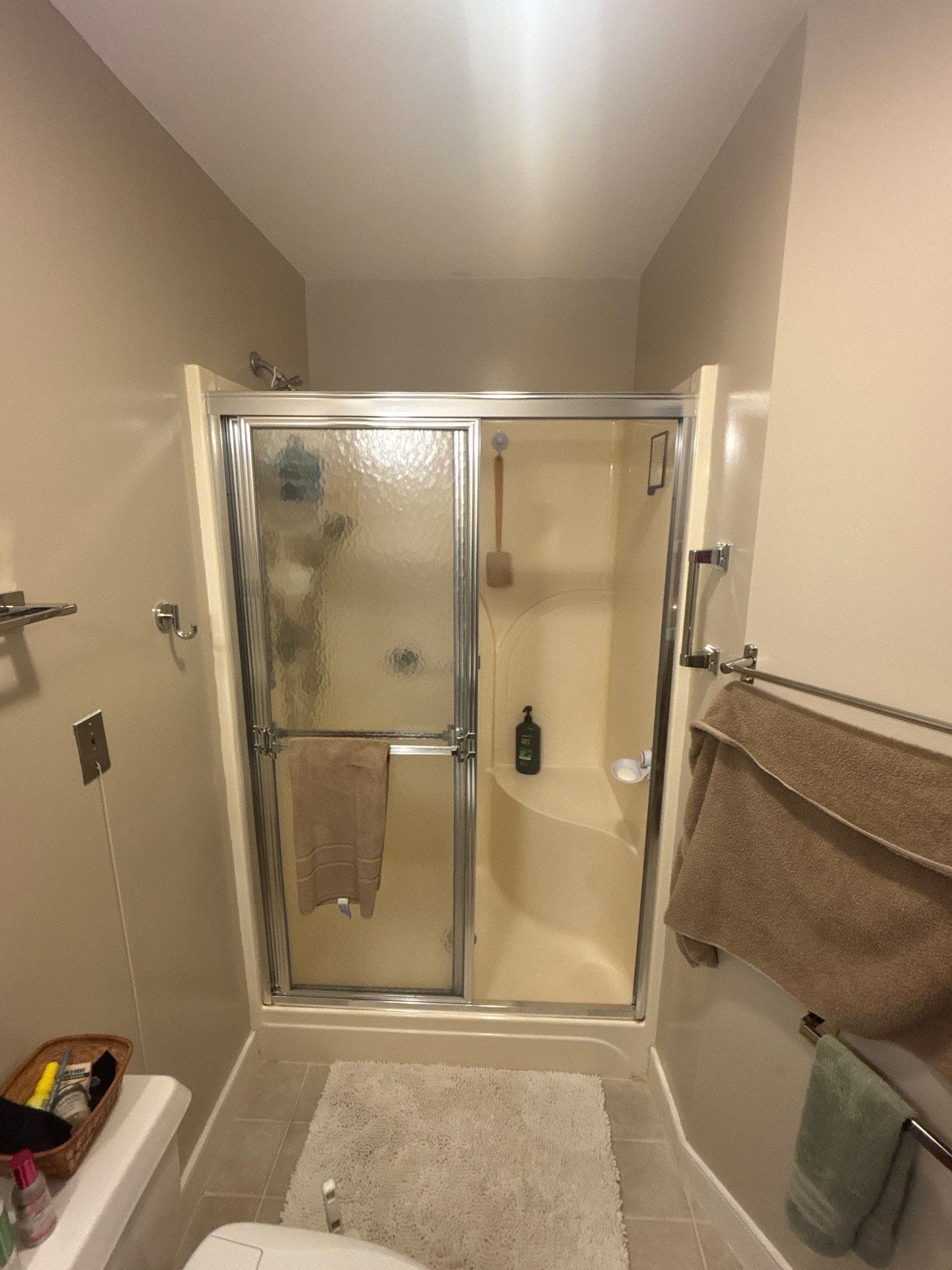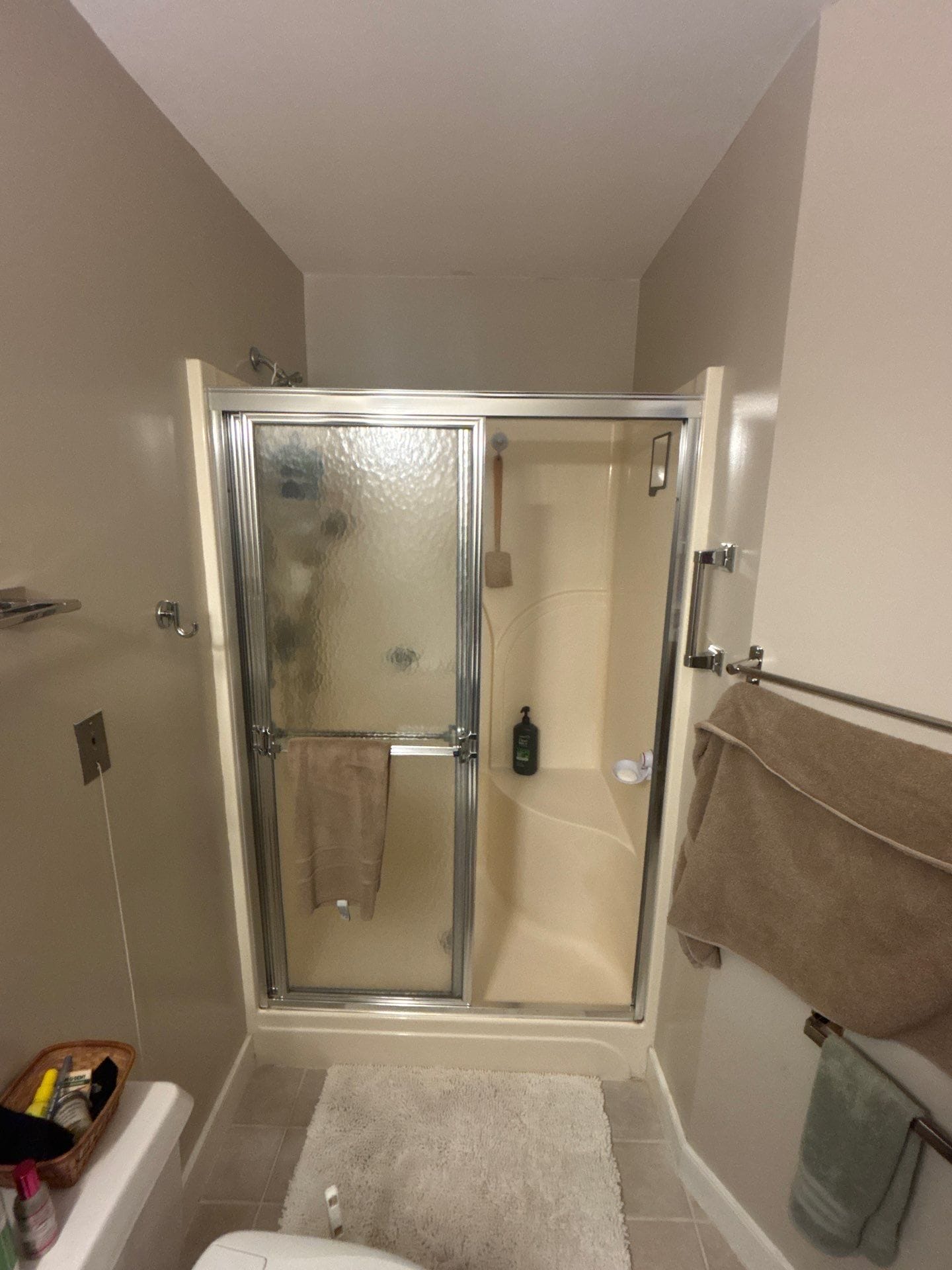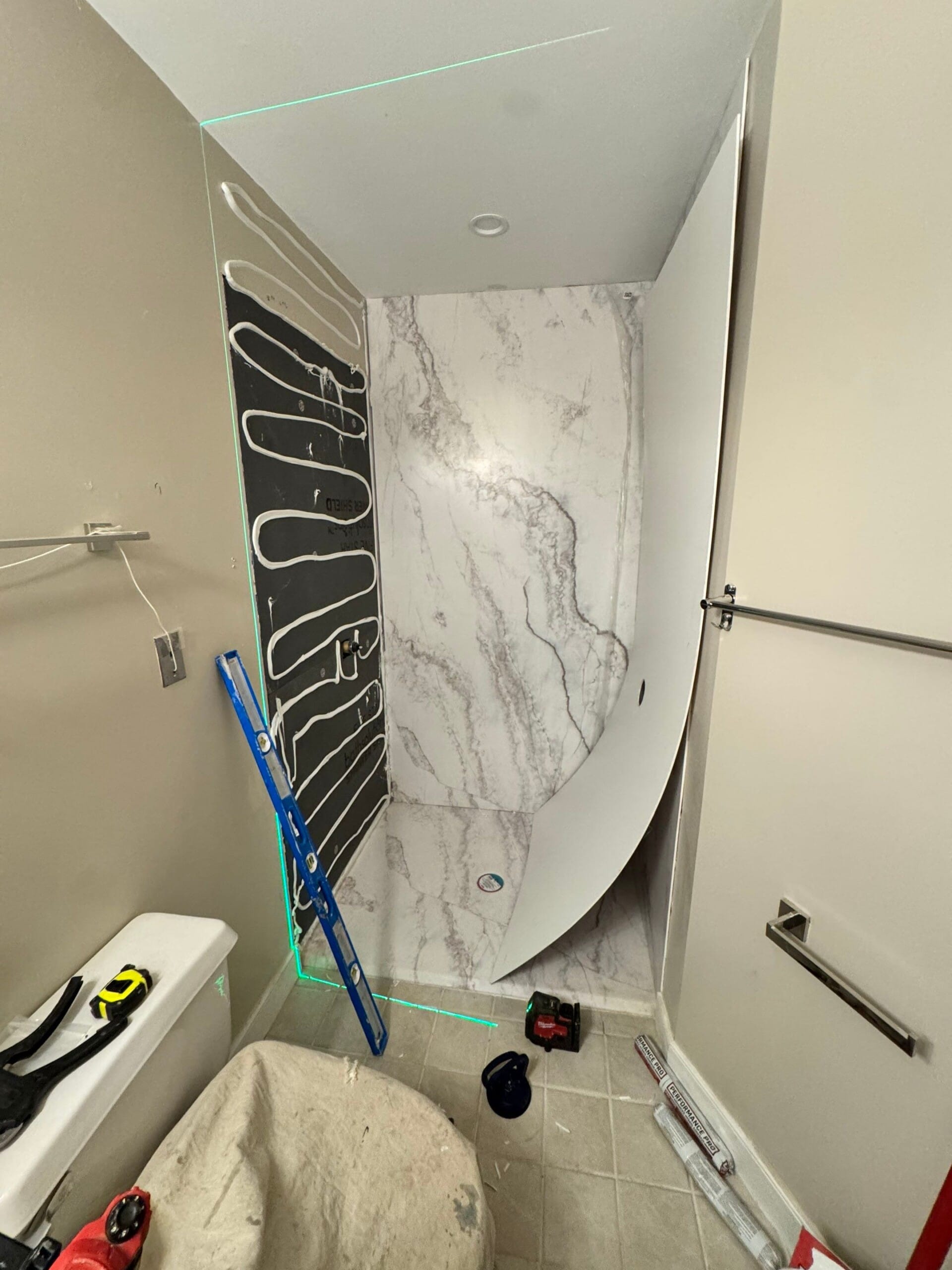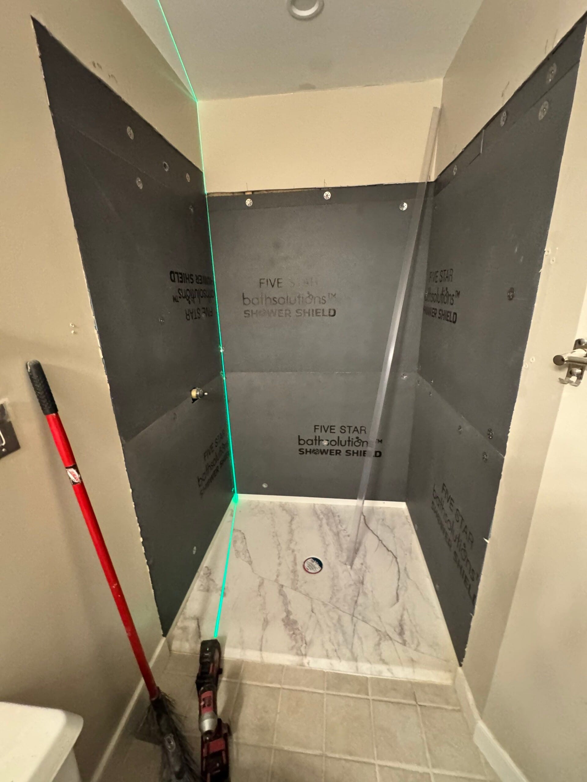 The system incorporates a six-layer antimicrobial polyvinyl composite surface that is grout-free, mold-resistant, and designed for easy upkeep. Panels are installed over a waterproof backer board that was sealed using high-bond adhesive and mildew-resistant silicone. This setup ensures long-term protection against water infiltration and surface degradation. Tile flooring was retained outside the shower area and protected throughout the construction process.