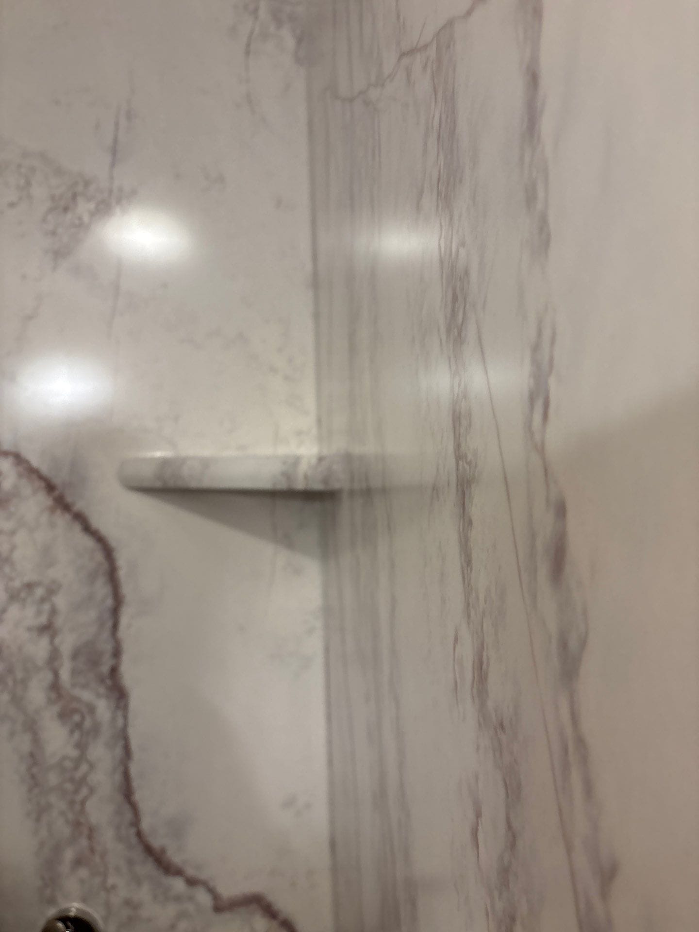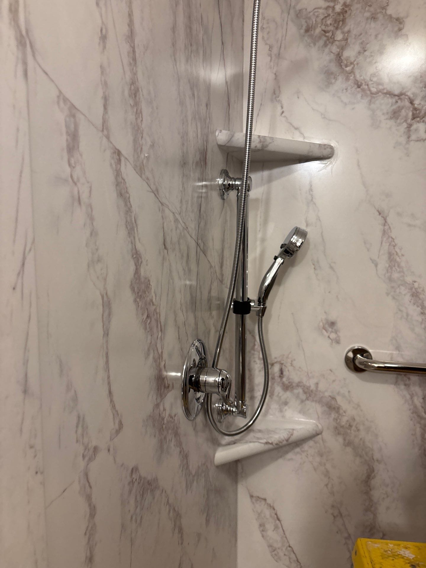 The newly installed walk-in shower features full-height Calacatta-style composite wall panels with a realistic veining pattern. Fixtures were upgraded to polished chrome and include a dual showerhead setup—one fixed and one handheld—mounted on a vertical slide bar for adjustable positioning. Two ADA-compliant grab bars were installed for balance and support, including a horizontal rear grab bar and a vertical bar near the entrance. A fold-down teak bench was added to the side wall to provide flexible seating without impeding entry.