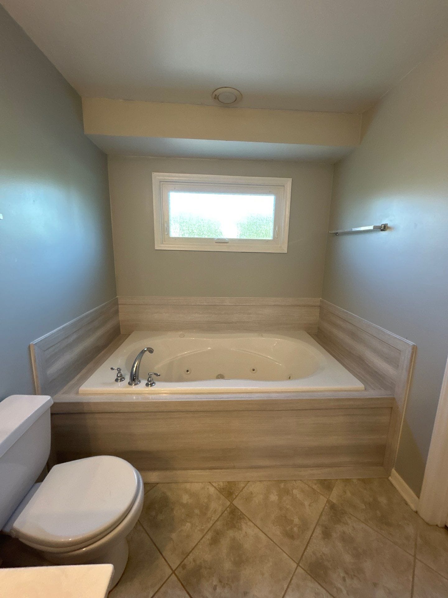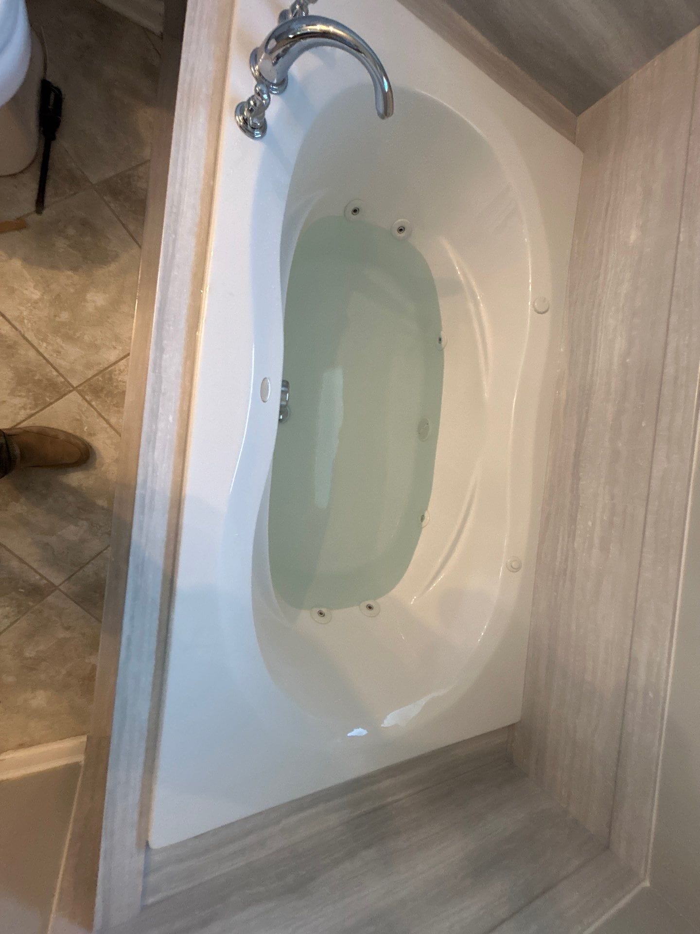 Installation involved removal of the original tub deck façade and surrounding trim, followed by preparation and reinforcement of the enclosure base. Composite wall panels were precision-cut to fit the perimeter of the tub and installed with sealed edges for waterproofing. The existing jetted tub was retained, with fixtures updated and reinstalled to match the new surround. Care was taken to blend the new materials with the existing tile floor and ensure all transitions were smooth and clean. The remodel dramatically improved the visual tone of the space, offering a neutral, upscale finish with minimal interruption to the overall layout.