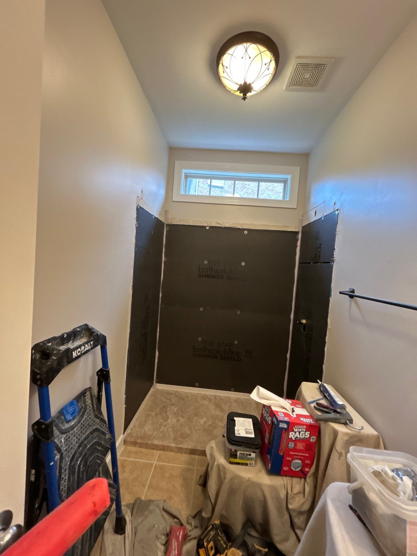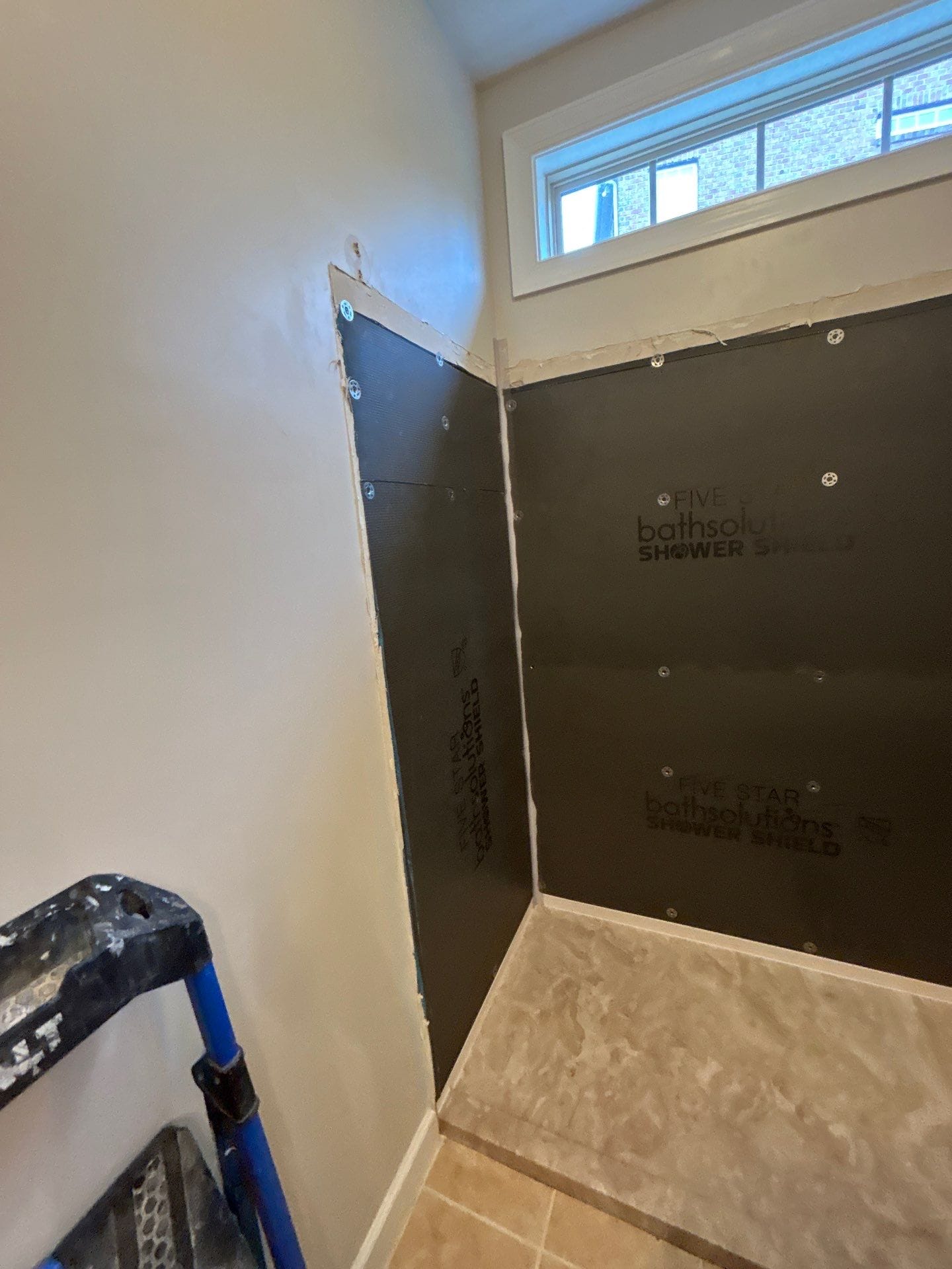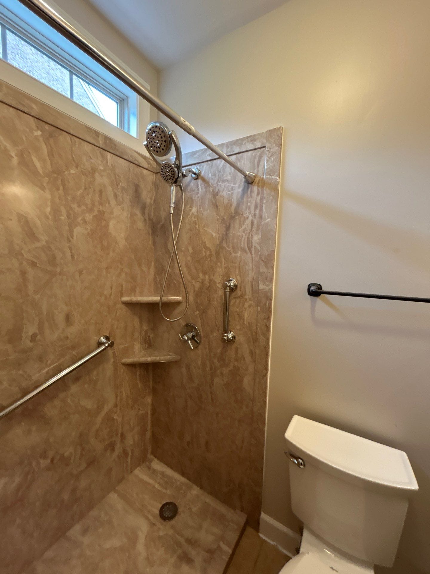 Installation involved complete demolition of the original tile and tub structure down to the studs. Waterproof backer board with quad-lock corner protection was installed before setting the new composite wall panels. The configuration included a chrome multi-function showerhead with a detachable handheld wand, one long horizontal grab bar, and two triangular corner shelves. No bench, niche, or frameless glass was present in the final photos, and the pony wall described in the review was not included. The shower area remained open and was fitted with a new straight curtain rod to match the layout.