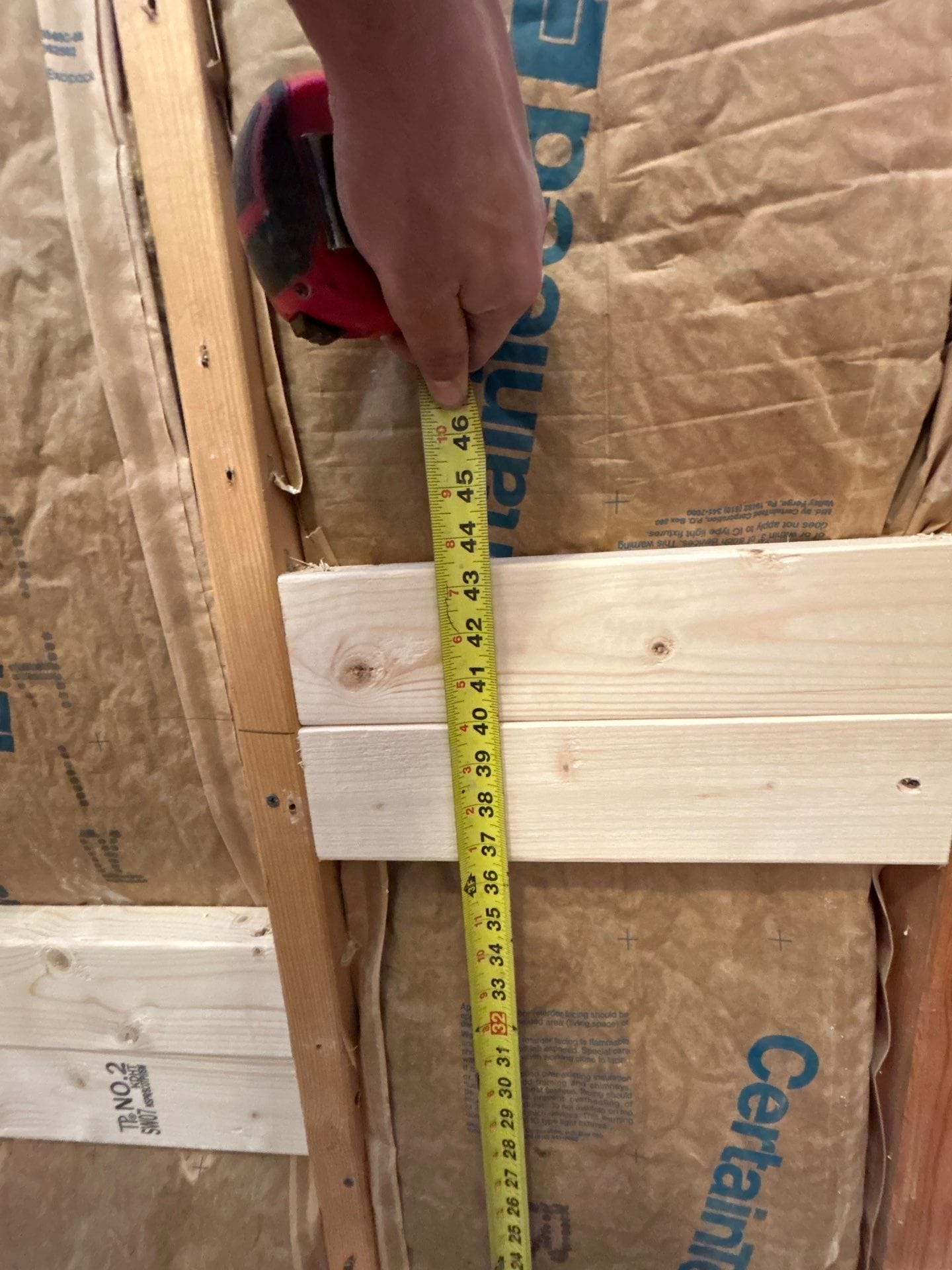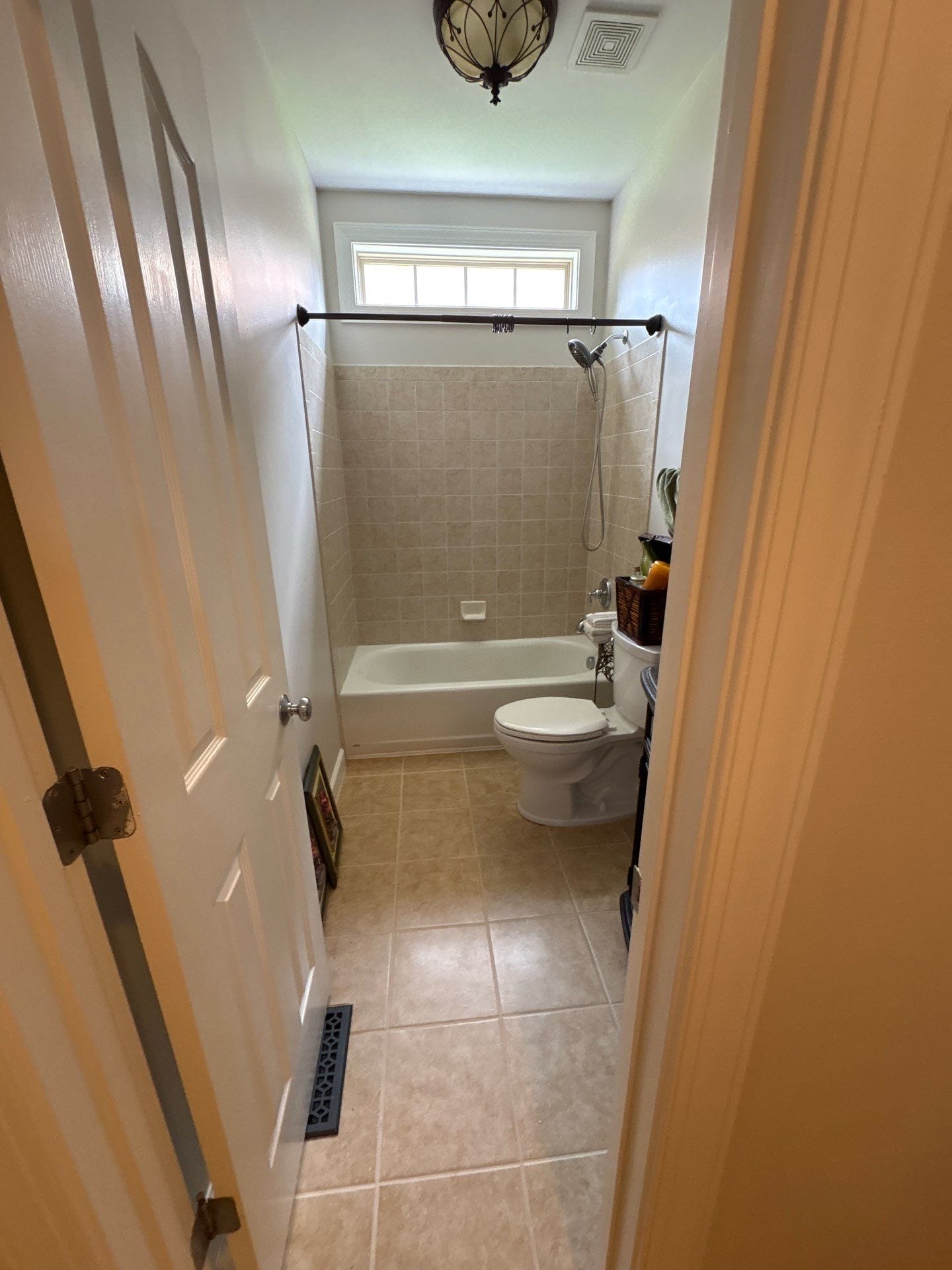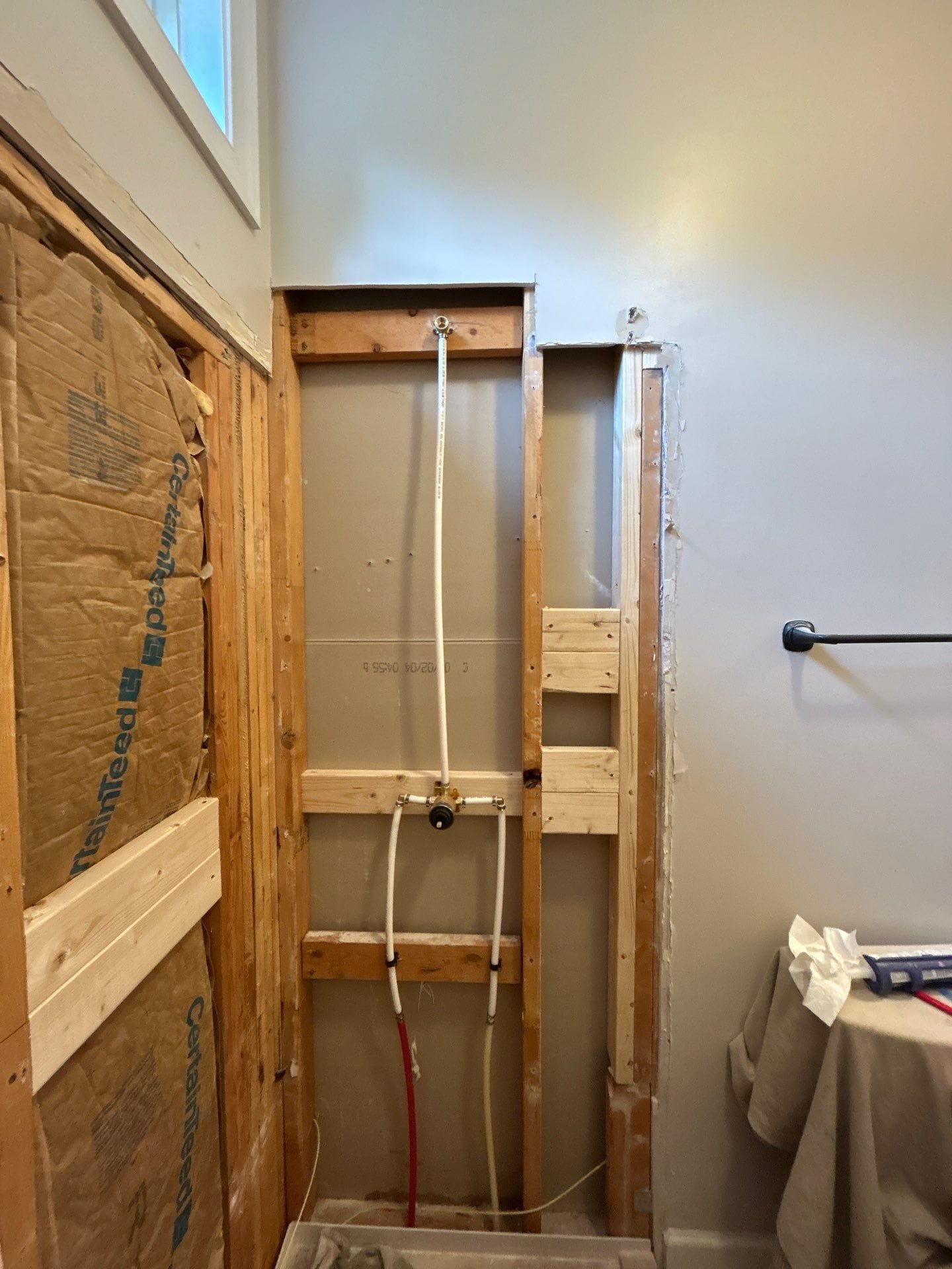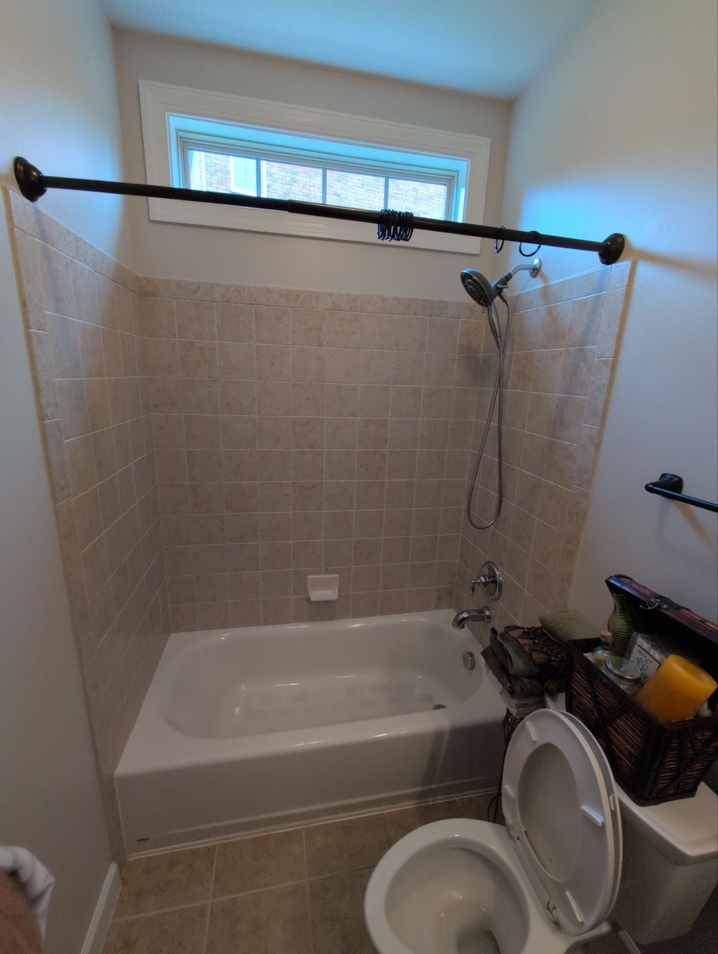 Installation involved complete demolition of the original tile and tub structure down to the studs. Waterproof backer board with quad-lock corner protection was installed before setting the new composite wall panels. The configuration included a chrome multi-function showerhead with a detachable handheld wand, one long horizontal grab bar, and two triangular corner shelves. No bench, niche, or frameless glass was present in the final photos, and the pony wall described in the review was not included. The shower area remained open and was fitted with a new straight curtain rod to match the layout.
