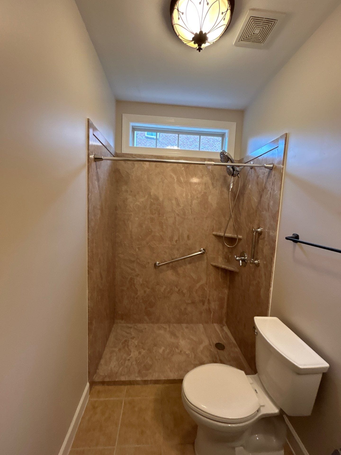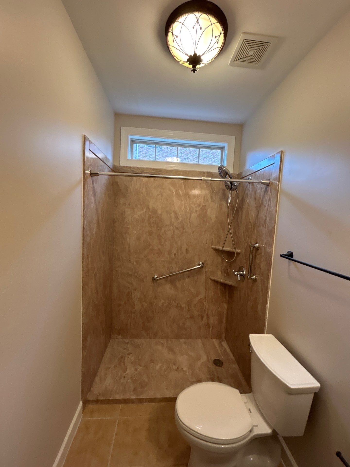 Brad Benson presented the Smart Choice package from Five Star Bath Solutions, highlighting a six-layer antimicrobial wall system designed to mimic the appearance of stone while avoiding grout lines and maintenance issues. The system offered a non-porous surface that resists mold and stains. The new wall color was selected to coordinate with the existing tile flooring. All panels were sealed with antimicrobial silicone and finished to ceiling height with a smooth transition to adjacent walls.
