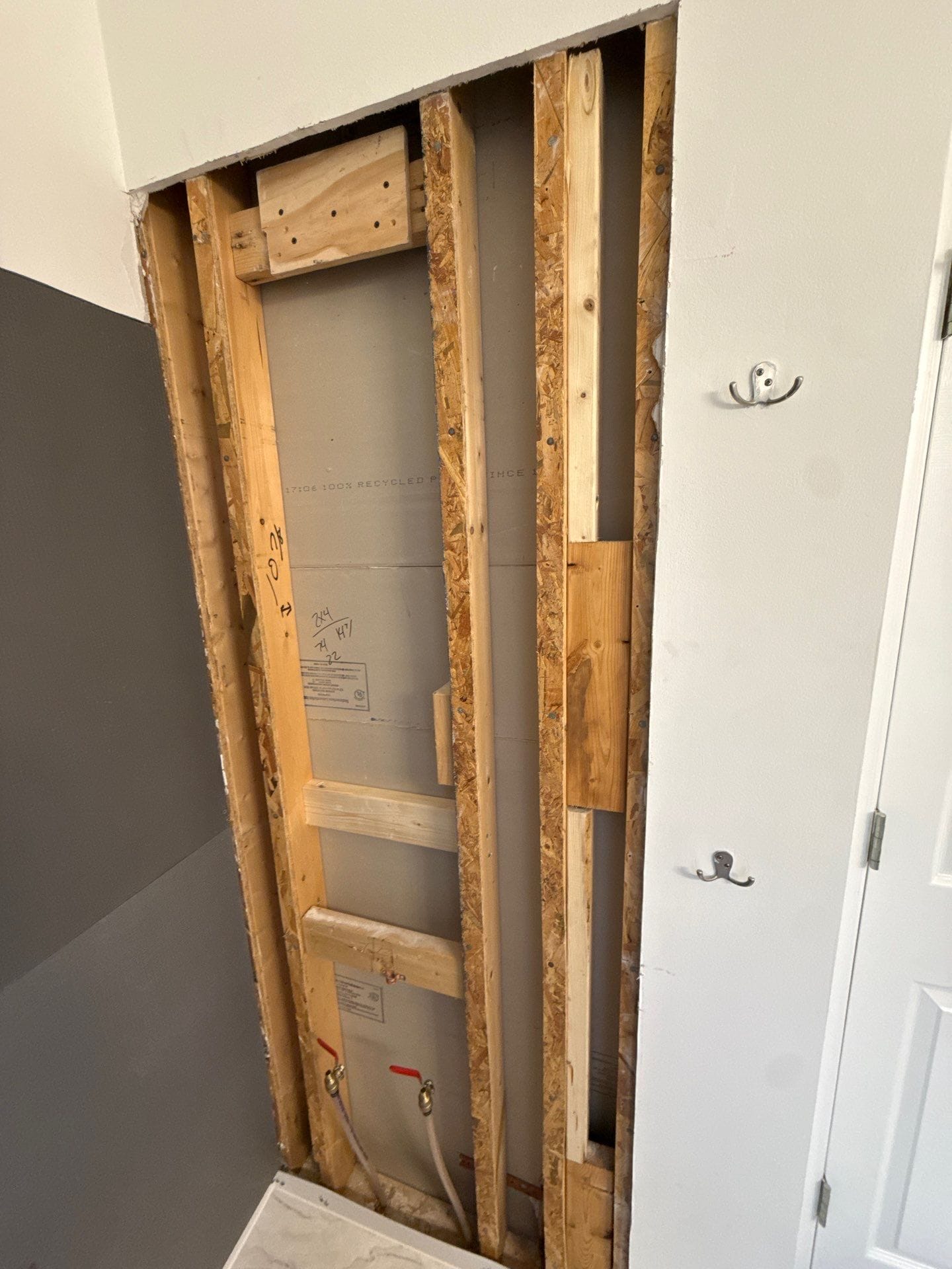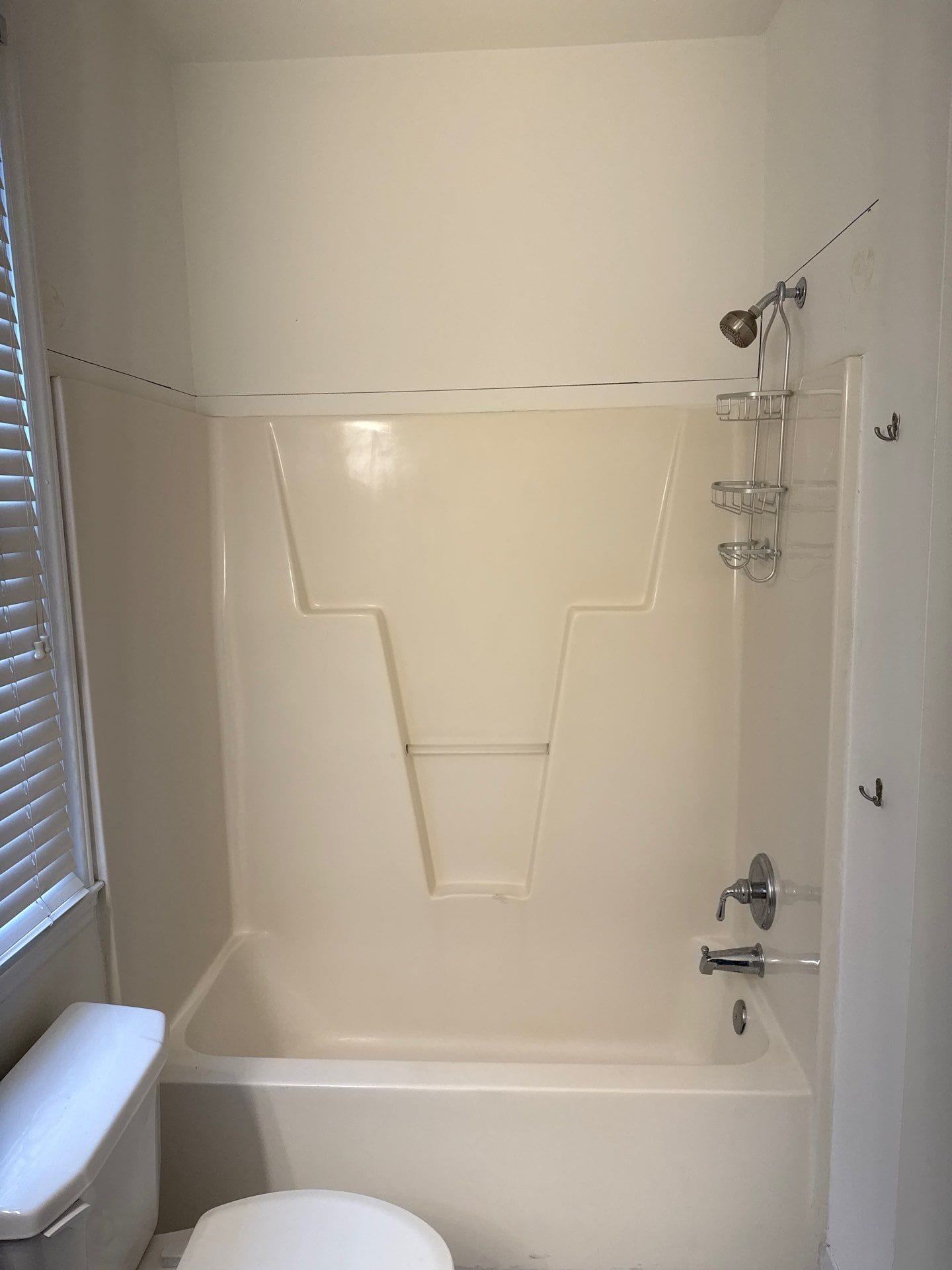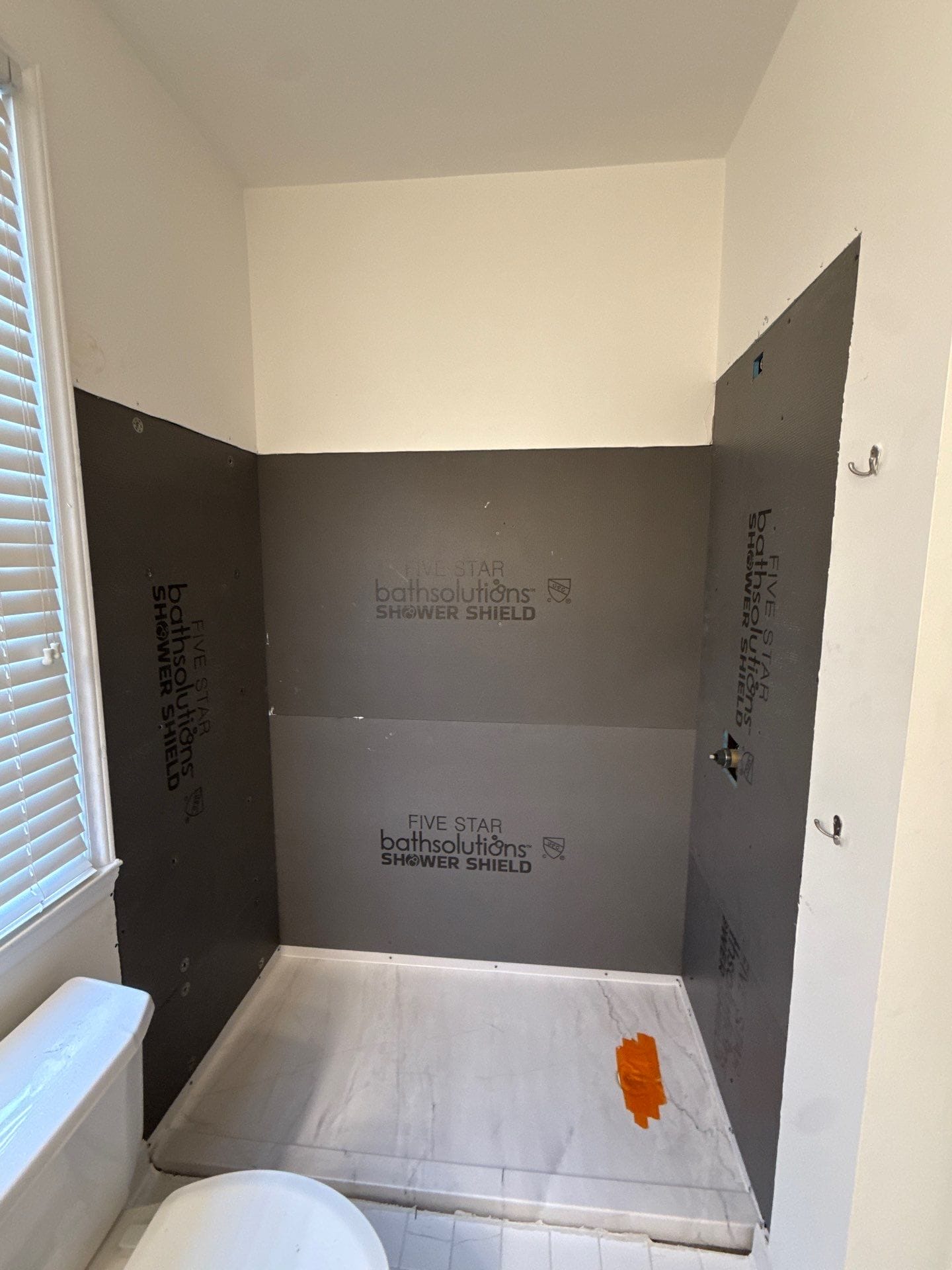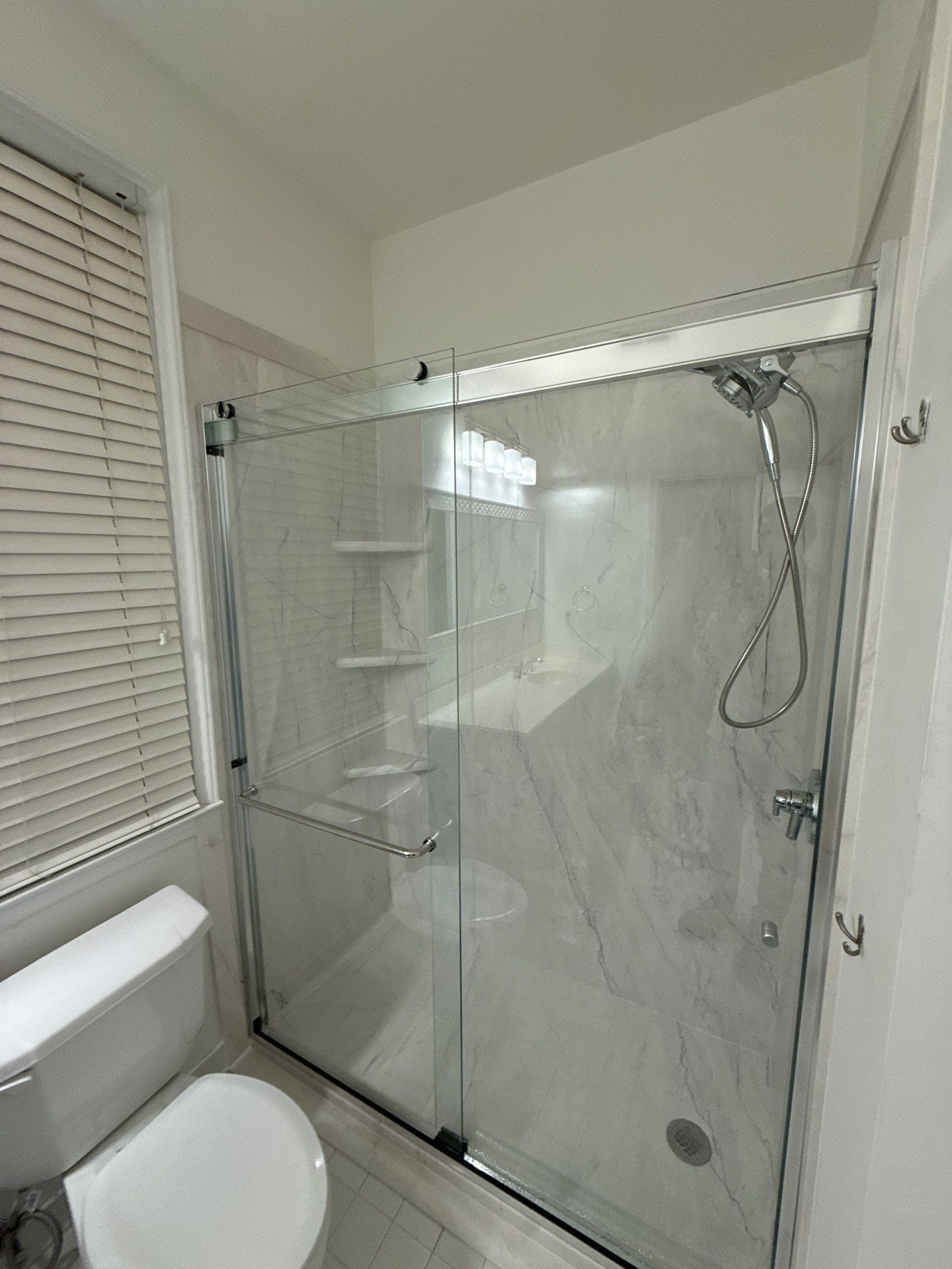Installation involved professional removal and haul-away of the previous system, with care taken to avoid mess or exterior debris. A project manager was assigned to return for follow-up measurements before materials were finalized. The new shower was expanded to full footprint width with a low-threshold base and installed with two full-height corner shelves, a wall-mounted handheld shower fixture, and a fold-down seat. Clear Infinity-style bypass glass doors were used to maintain openness while enhancing safety and access. All plumbing, backer board, and sealants were installed to code.