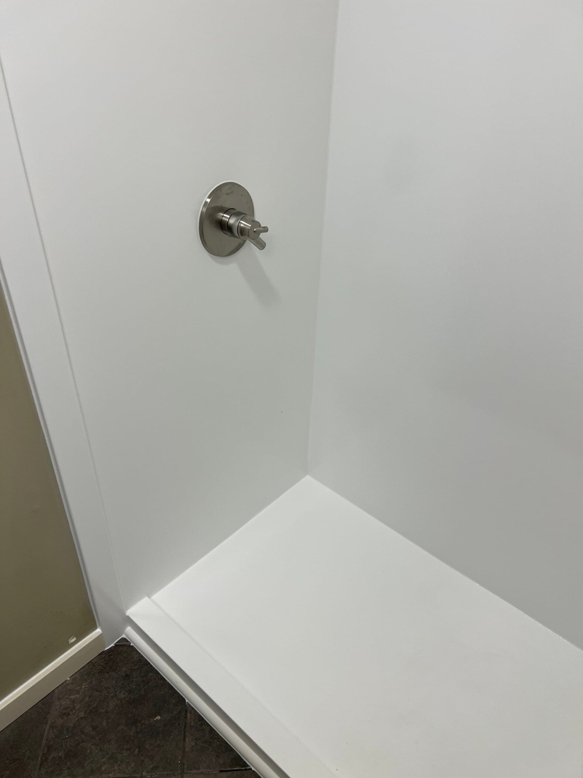 * Mold and mildew resistant, grout-free wall system in solid white finish