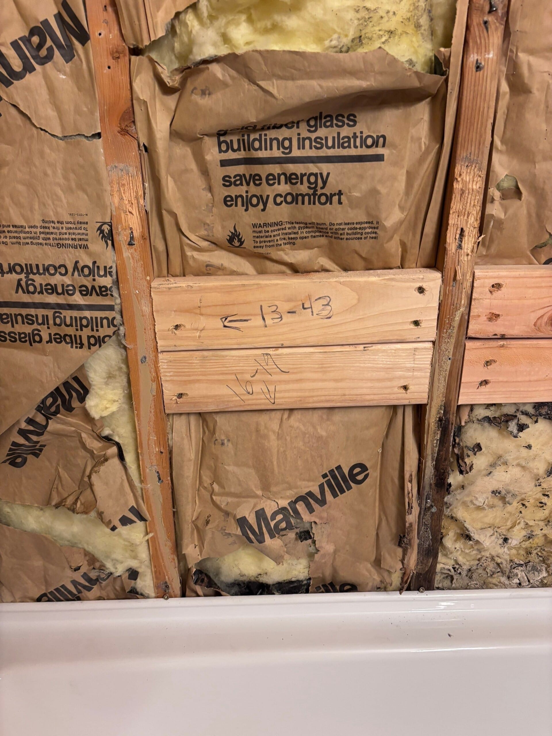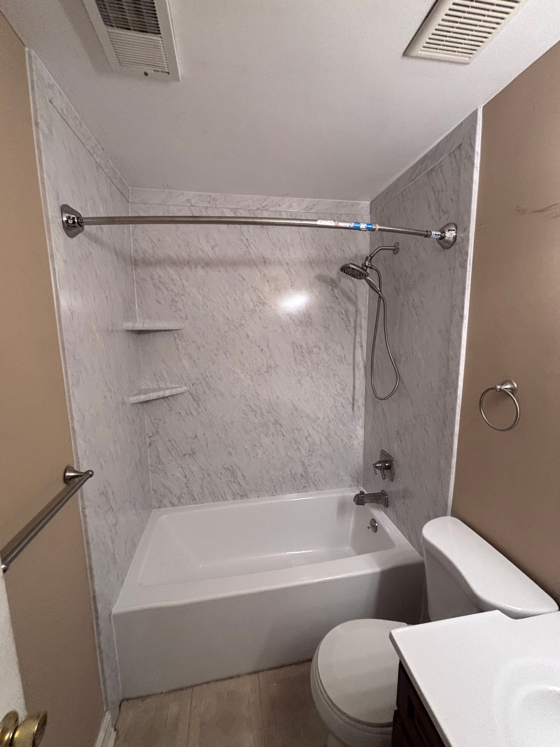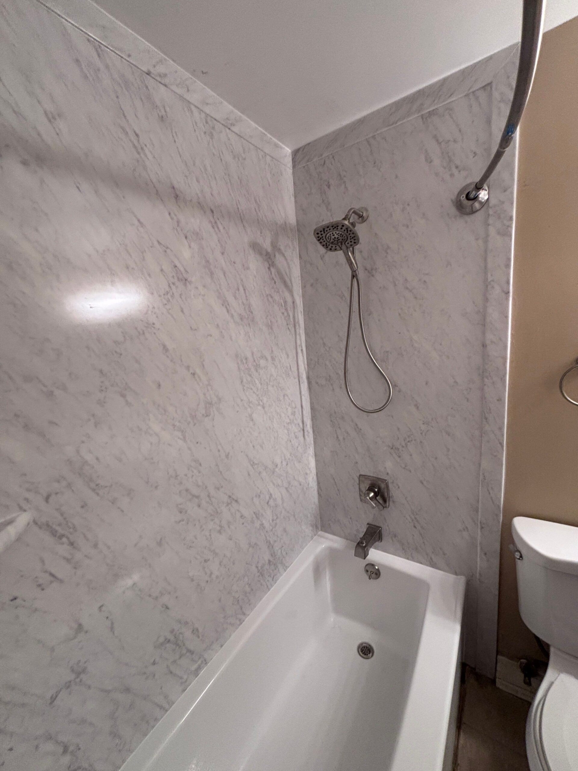 Installation involved full removal of the original wall tile, inspection and preparation of the stud framing, and installation of the proprietary ShowerShield waterproof backer board. The new quarter-inch thick wall panels were installed across three sides of the tub area, trimmed precisely around ceiling and adjoining surfaces. Updated brushed nickel plumbing fixtures and two integrated corner shelves were added for improved utility. A new acrylic bathtub was also installed to replace the worn unit, preserving the familiar layout while elevating finish quality.