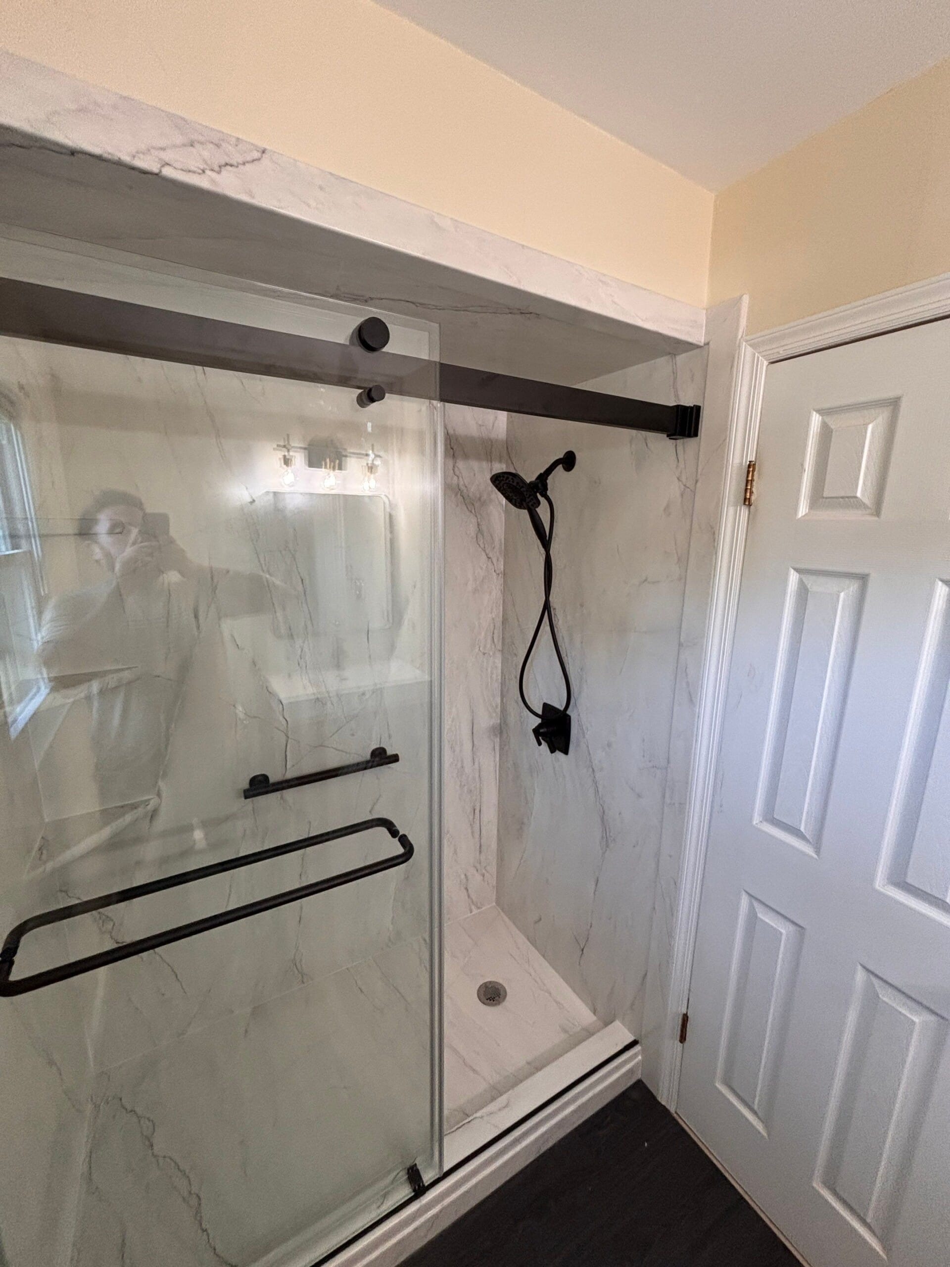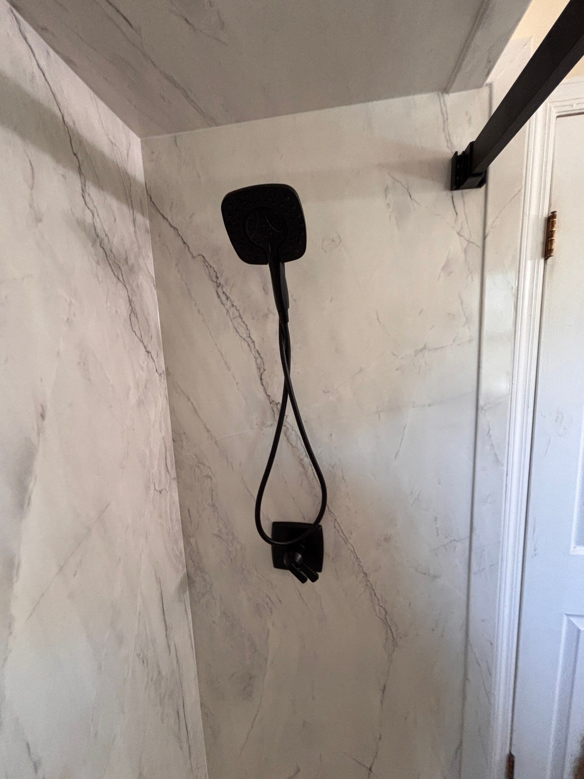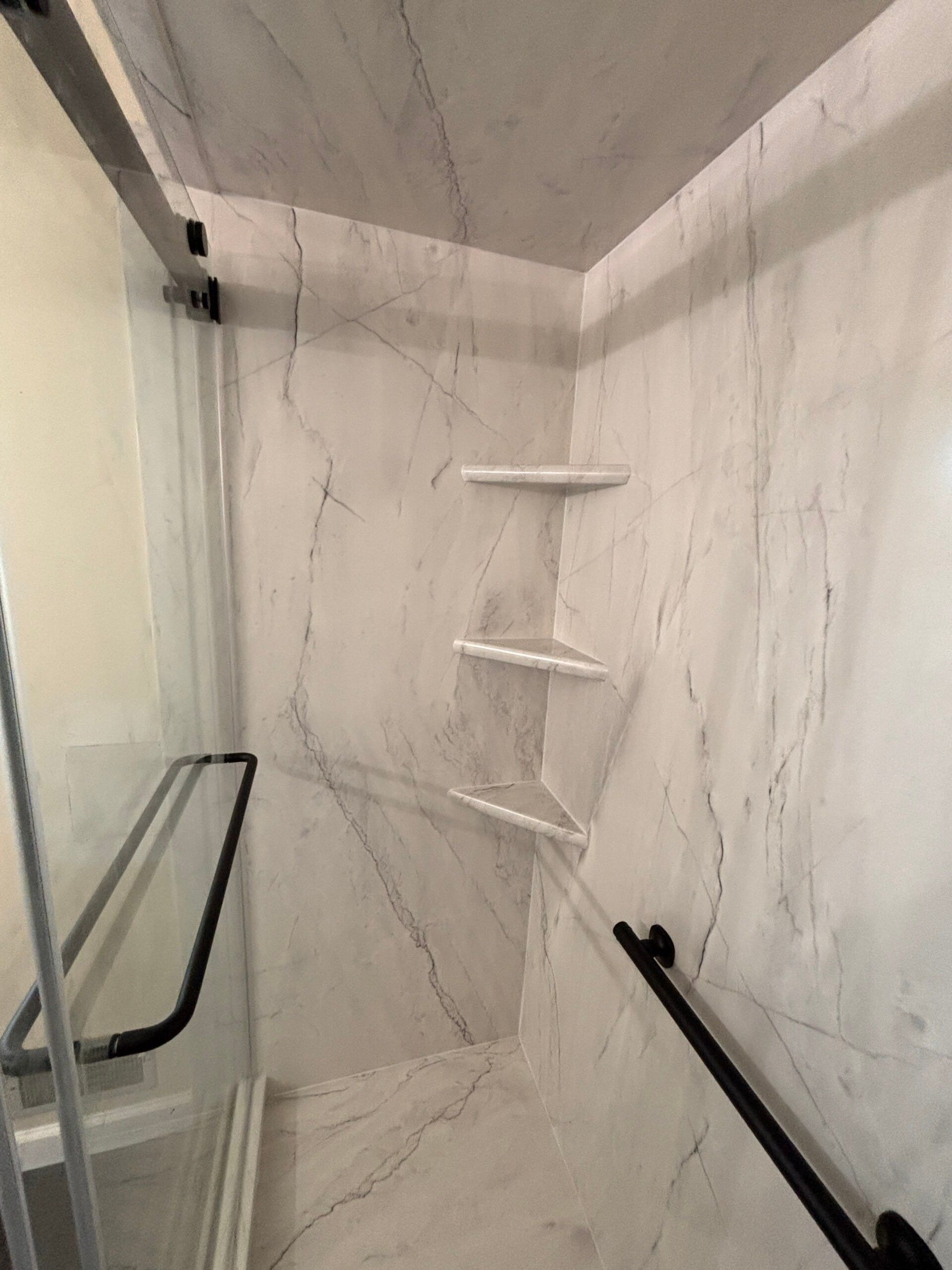 The Five Star Bath Solutions representative introduced a full composite shower system built from antimicrobial, six-layer PVC panels designed to resist mold, stains, and scratches. The surface requires no scrubbing and features a non-porous, waterproof finish with a high-end stone appearance. A one-piece panel configuration was used per wall, extending to the ceiling for a seamless look. The new shower base included a non-slip textured floor on a closed-cell foam foundation for strength and security. Black fixtures were installed throughout, including a handheld wand on a slide bar and coordinating matte black handles and grab bars. The clear glass door system featured a rain-resistant coating to reduce water spotting.