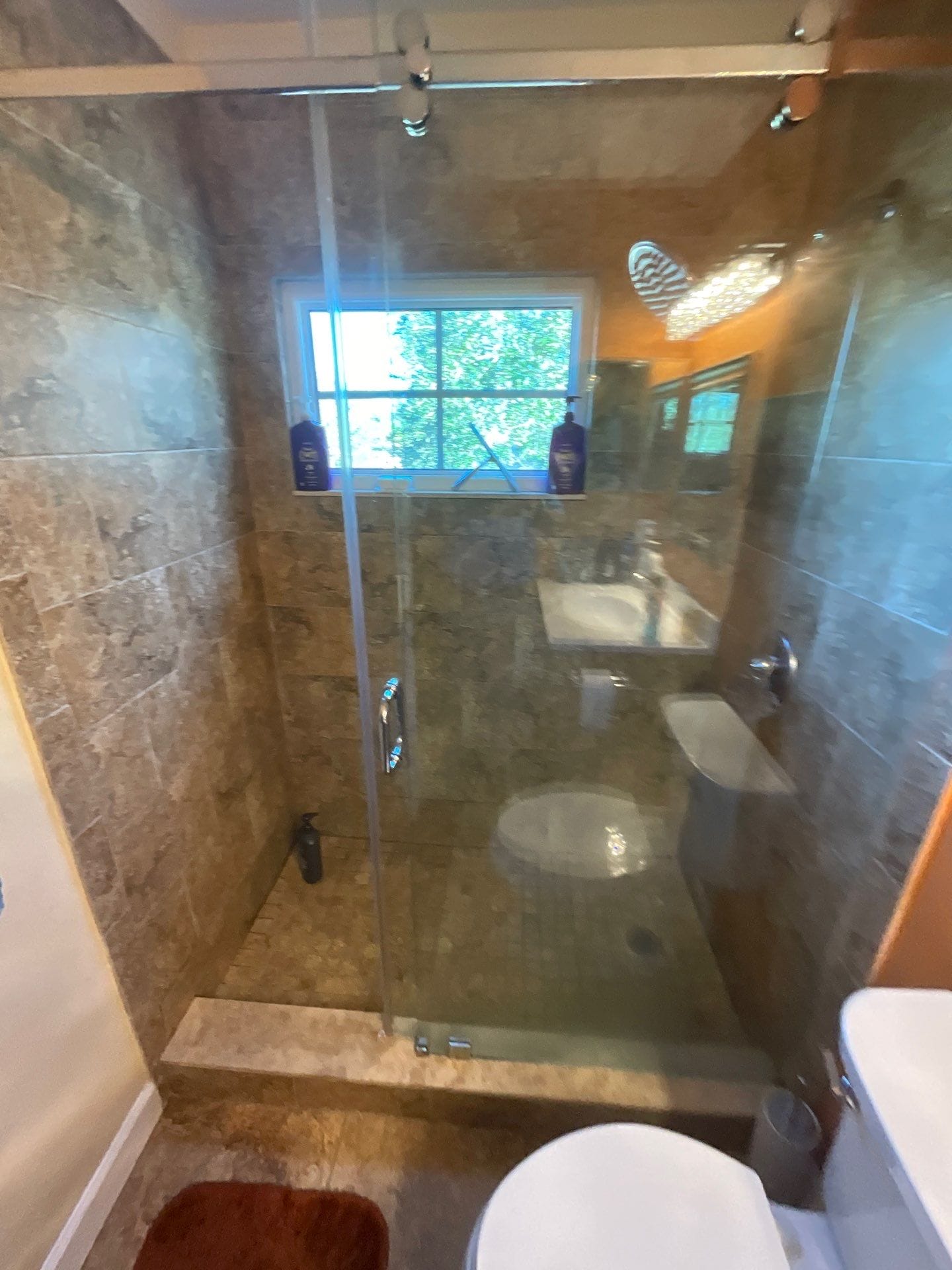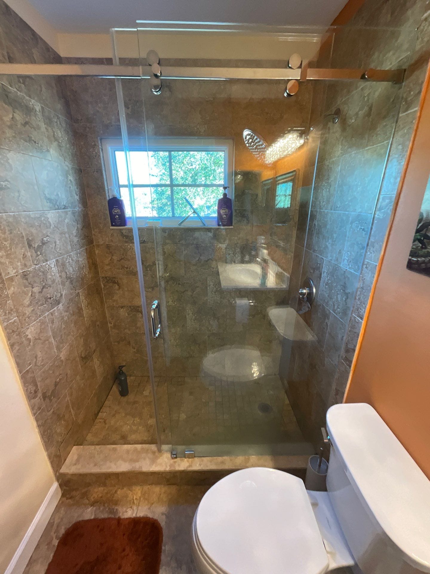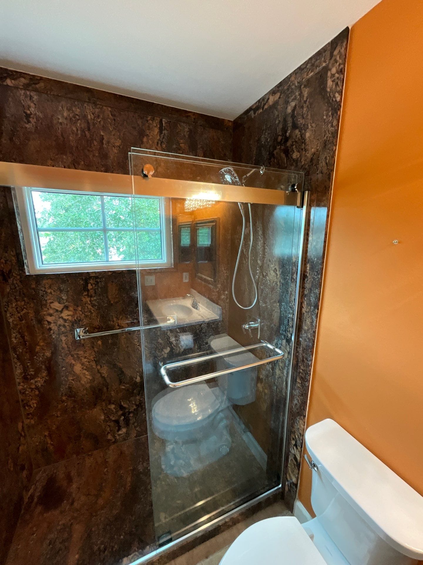The installation process included removal of the existing fiberglass unit and preparation of the shower structure, followed by installation of a waterproof backer system and custom-fitted wall panels. The new design maintained the existing footprint and incorporated a frameless-style sliding glass door with exposed top-mounted hardware. A handheld shower system was installed for added flexibility, and a horizontal grab bar was integrated along the back wall for stability. The window within the shower was preserved and trimmed to match the new wall system, maintaining natural light while ensuring a clean, finished appearance. All transitions were sealed and completed with attention to moisture protection and durability.