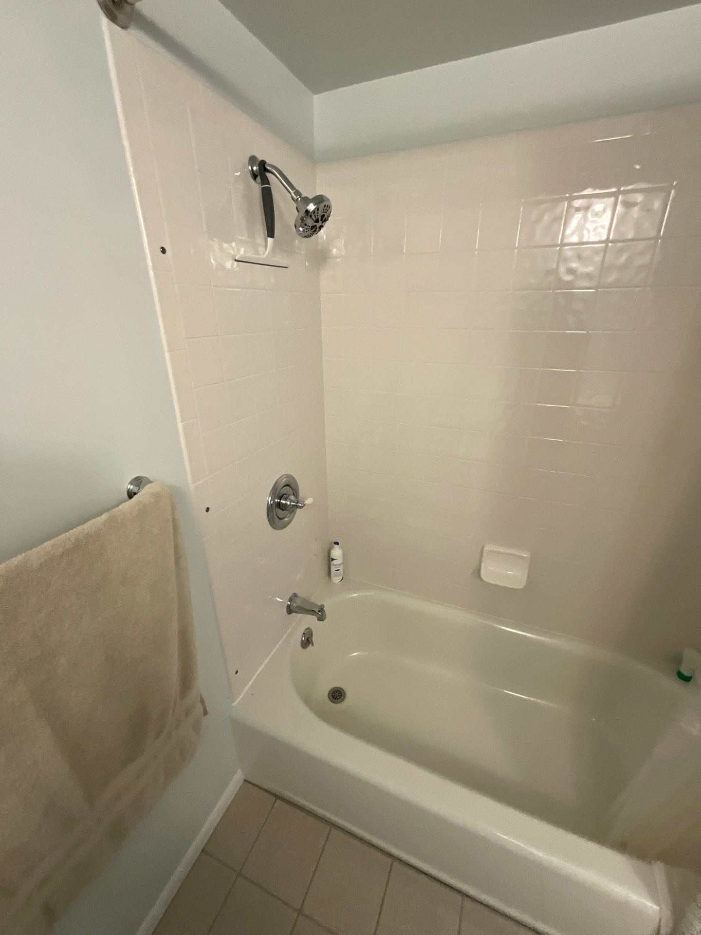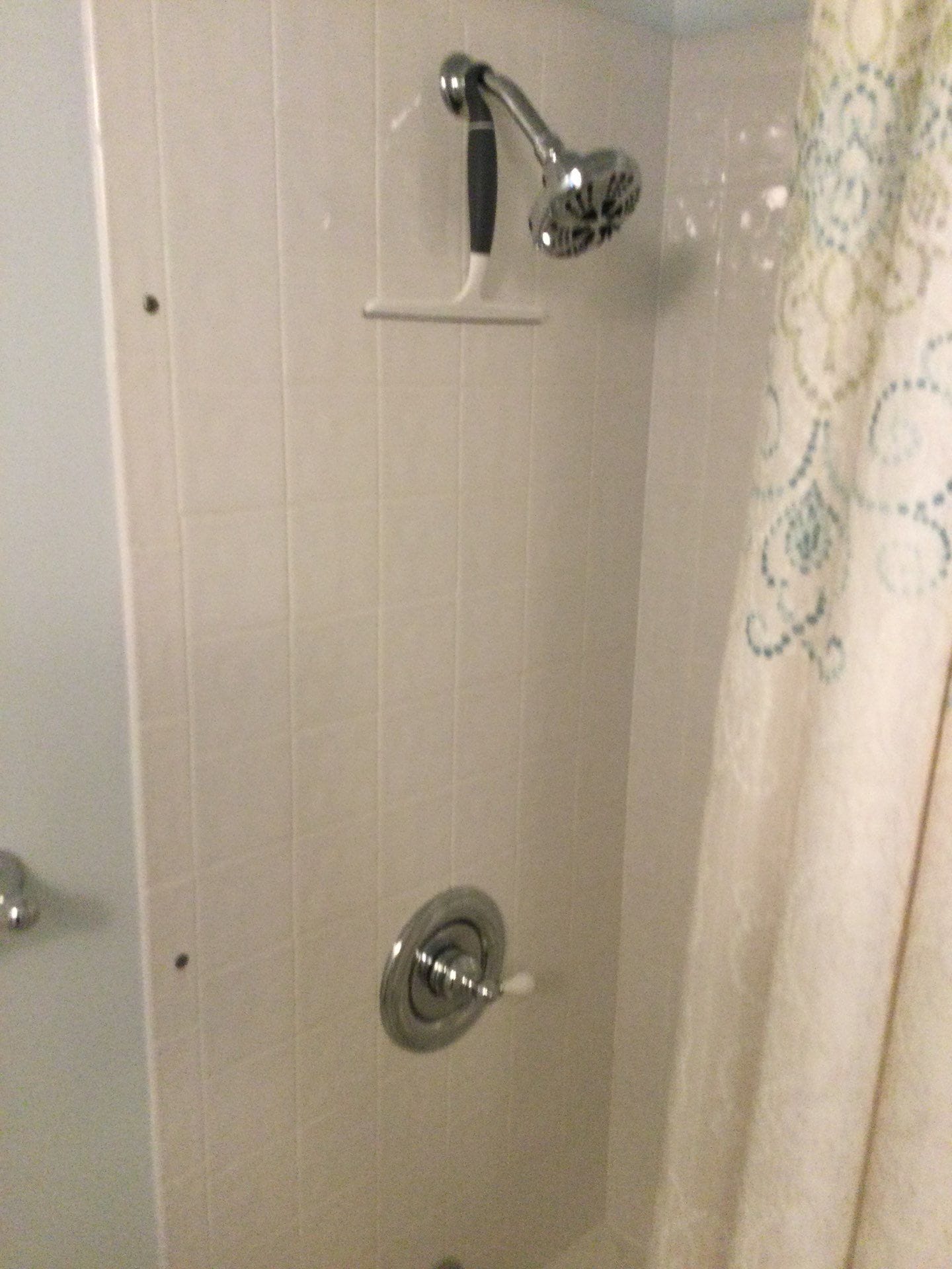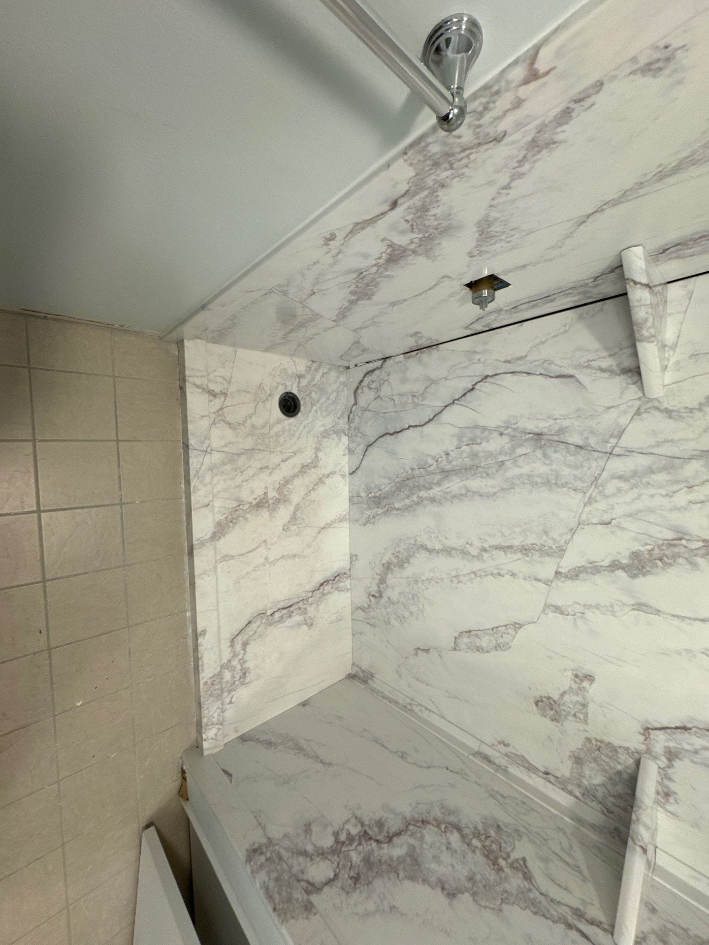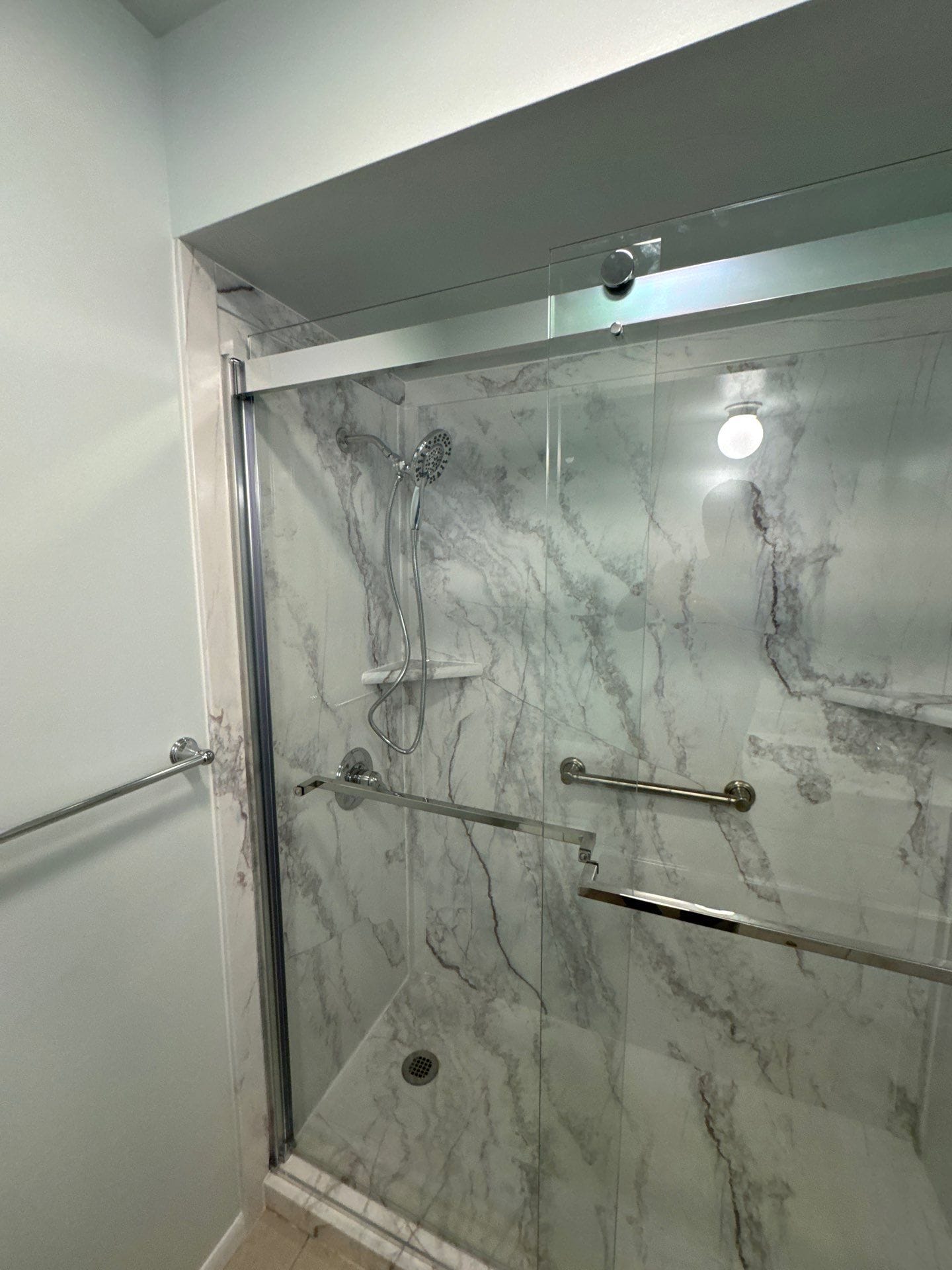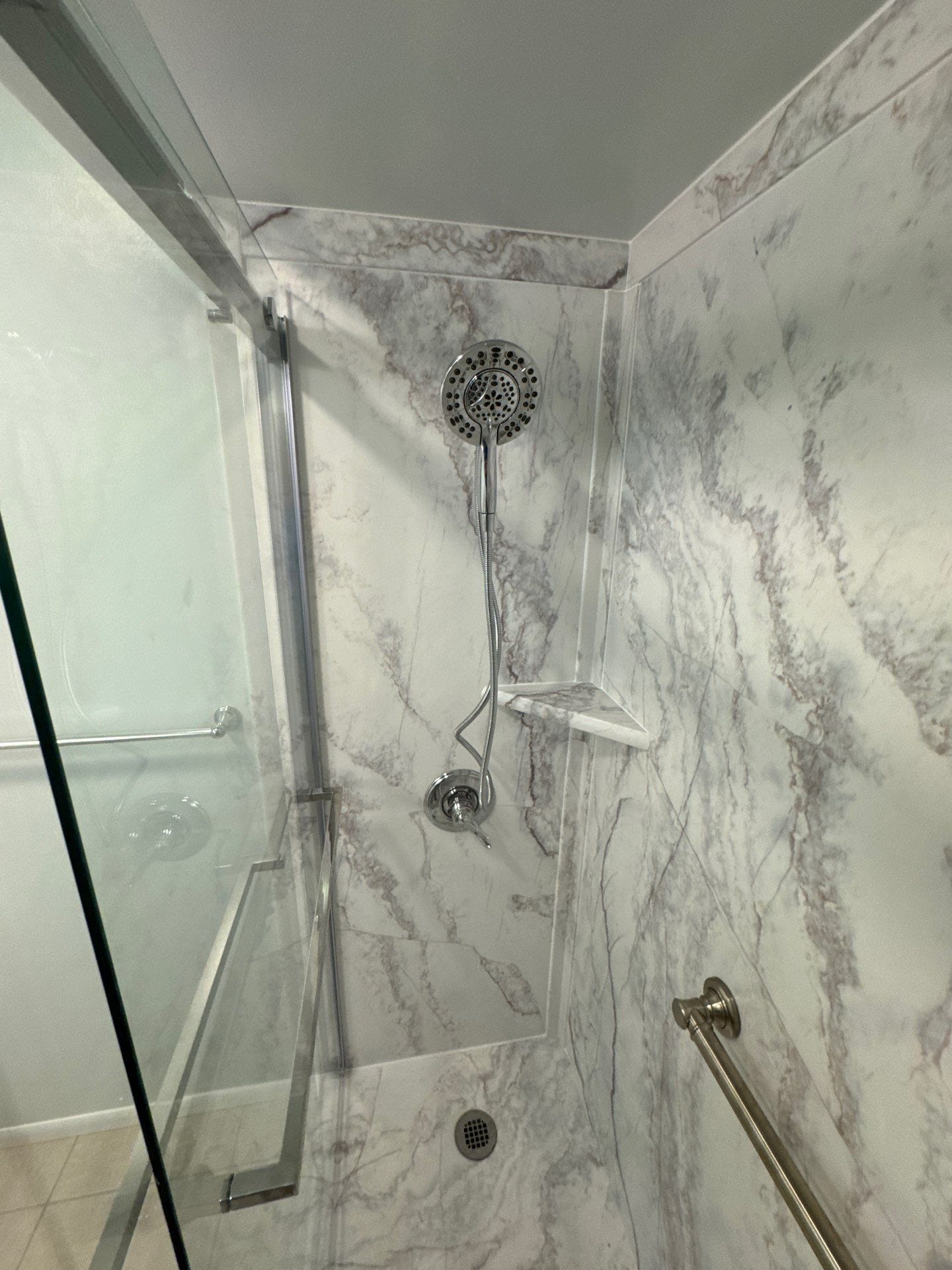 The Representative presented the Smart Choice system as a solution that balances safety, durability, and visual appeal. The system features grout-free composite wall panels with a light marble-style veining pattern, providing a bright and updated look while eliminating maintenance concerns associated with tile. The materials are antimicrobial and designed for long-term performance. Built-in corner shelving was incorporated for convenient storage, and a handheld showerhead was included to improve usability. A grab bar was also integrated to enhance stability and support while maintaining a clean, cohesive appearance.
