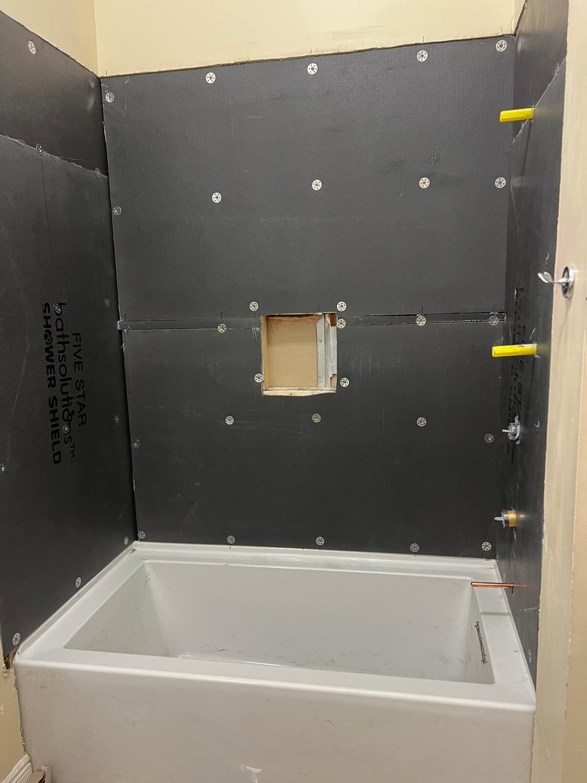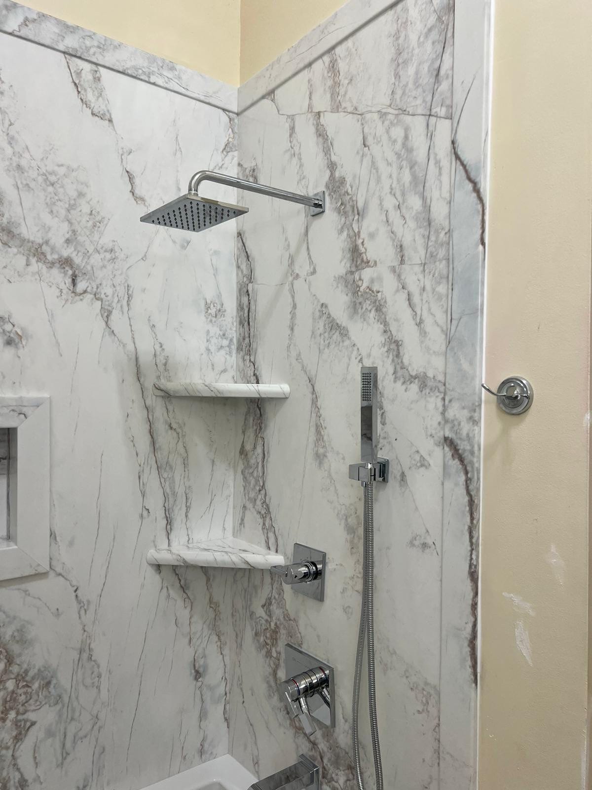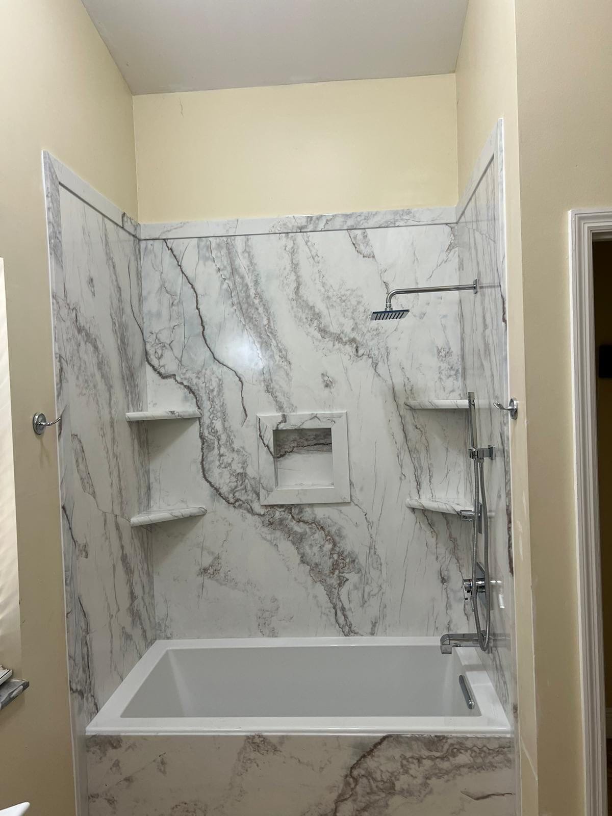 Installation involved removing the old tile surround and tub, preparing the wall structure, and installing a new soaking tub. Full-height composite panels were fitted with matching trim, and three corner shelves along with a recessed niche were added for organized storage. Chrome fixtures, including the square rainfall showerhead and handheld system, were installed to complete the updated look. The project was completed by an in‑house crew following standard protection and cleanup procedures.