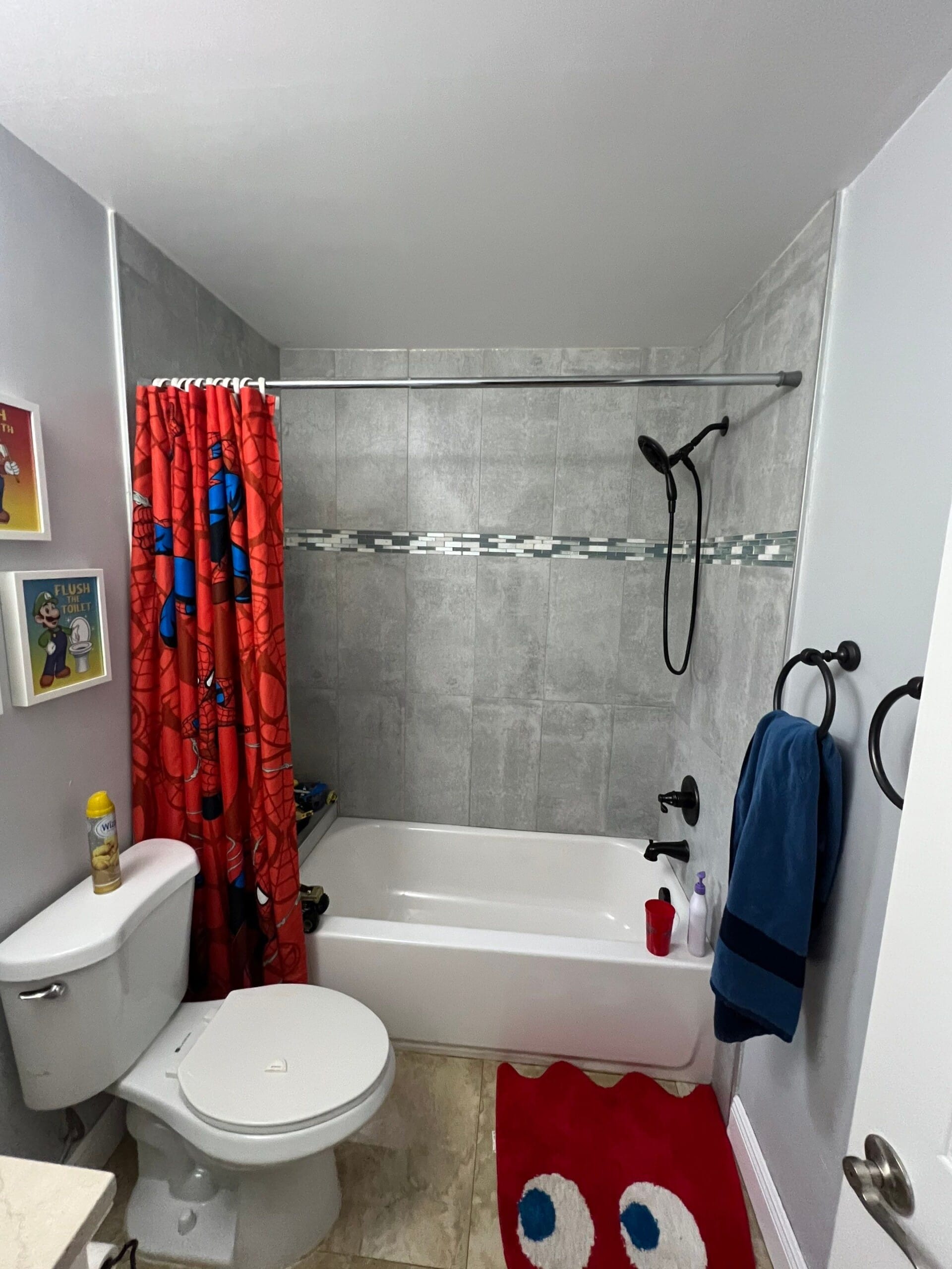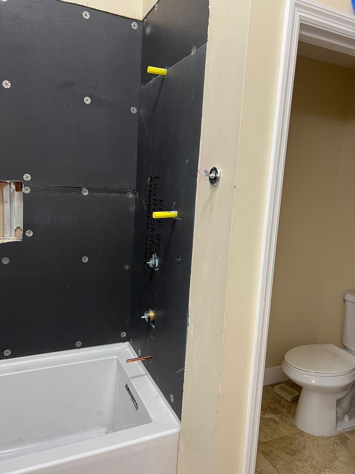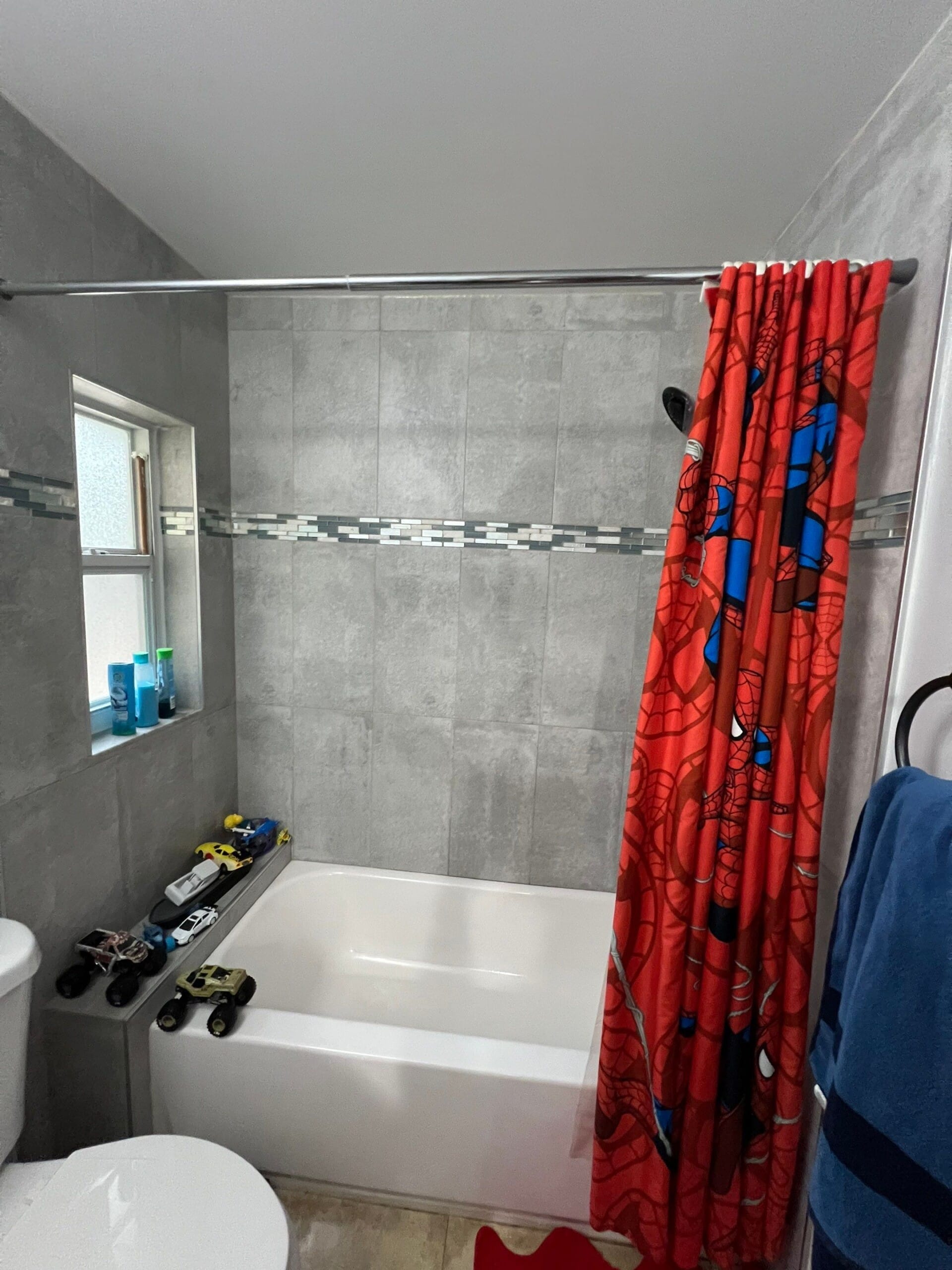 Installation involved removing the old tile surround and tub, preparing the wall structure, and installing a new soaking tub. Full-height composite panels were fitted with matching trim, and three corner shelves along with a recessed niche were added for organized storage. Chrome fixtures, including the square rainfall showerhead and handheld system, were installed to complete the updated look. The project was completed by an in‑house crew following standard protection and cleanup procedures.
