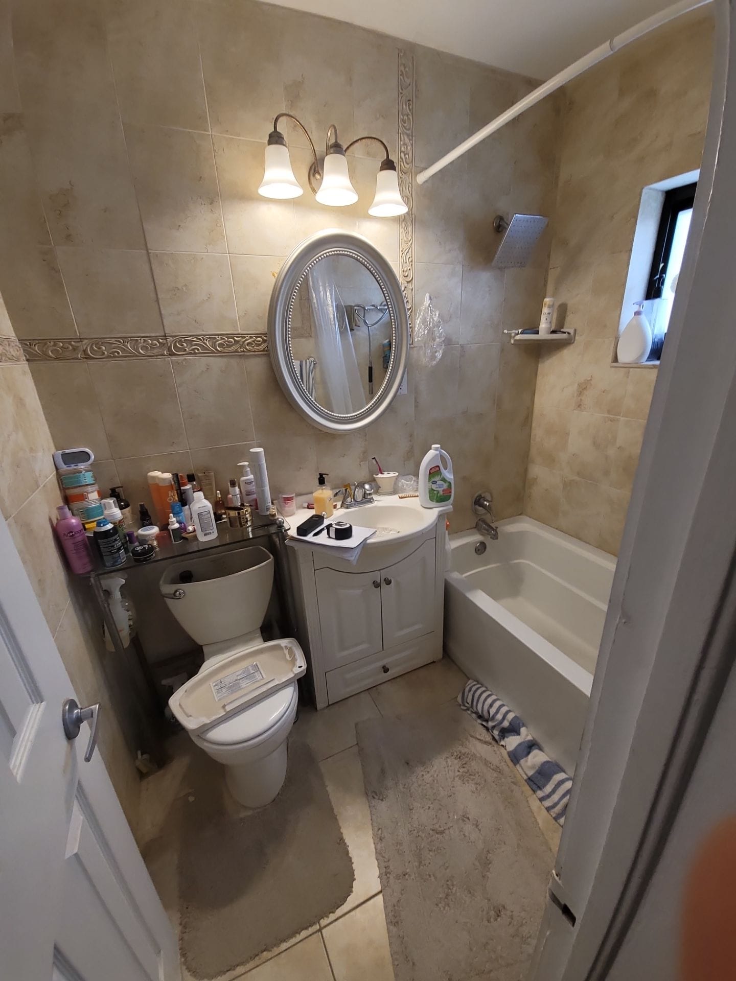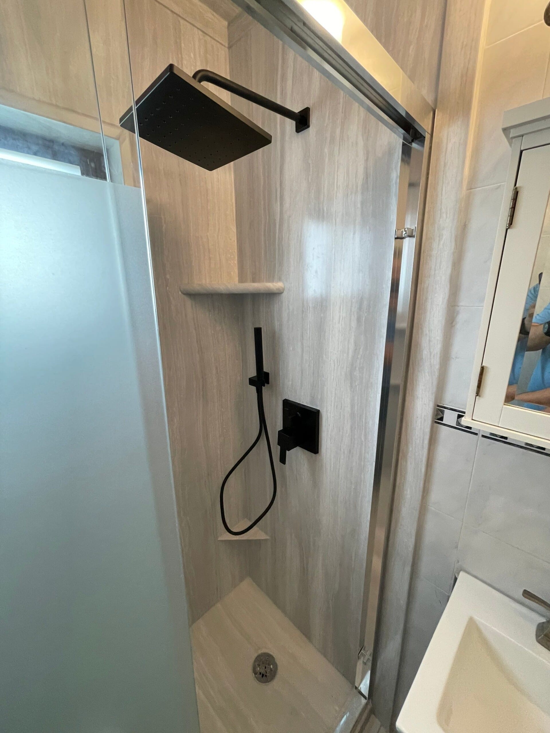 Installation included complete tub removal, wall preparation, subfloor inspection, and full shower system rebuild. The existing tub was replaced with a low-threshold walk-in shower pan, and matching composite wall panels were fitted for a seamless look. Two corner shelves were positioned inside the enclosure, and a rain-style showerhead with a detachable handheld wand was installed. All work was completed by a dedicated in-house team over a one to two-day timeline, with no subcontractors involved.